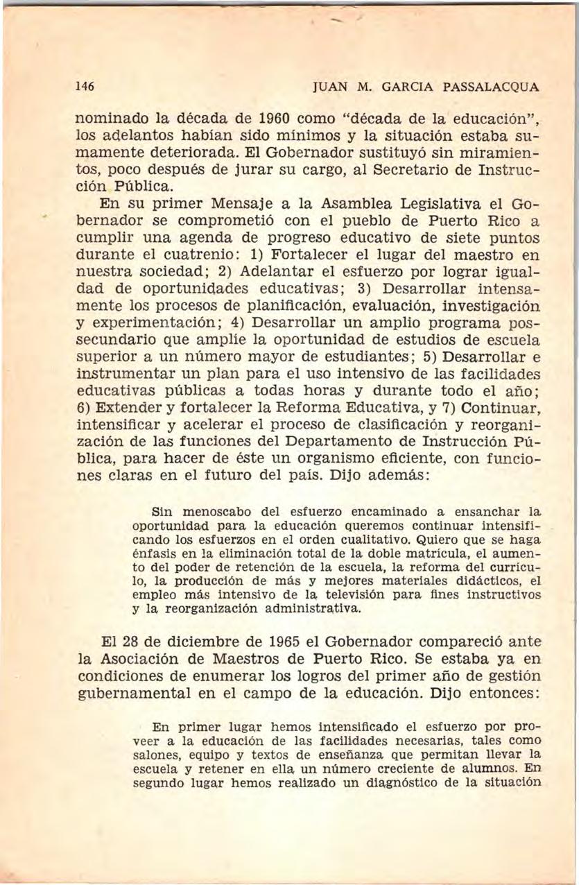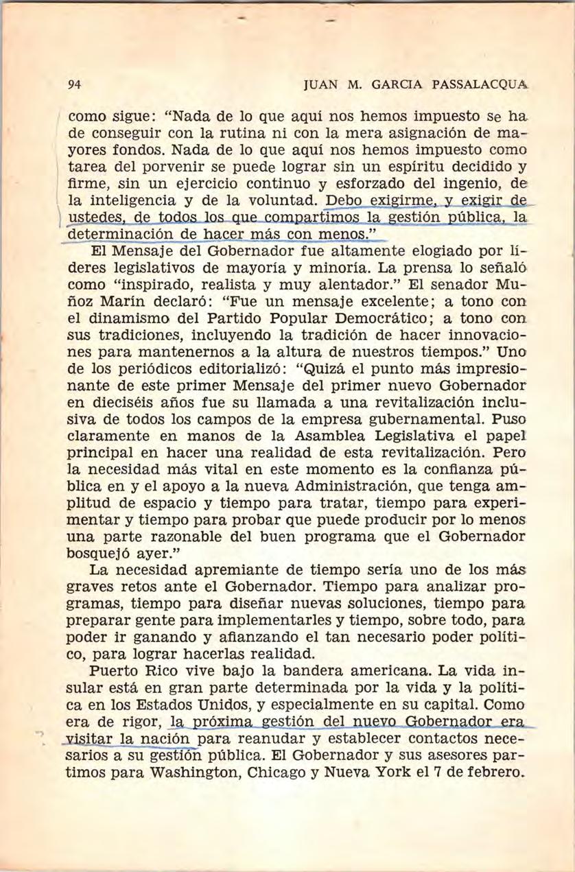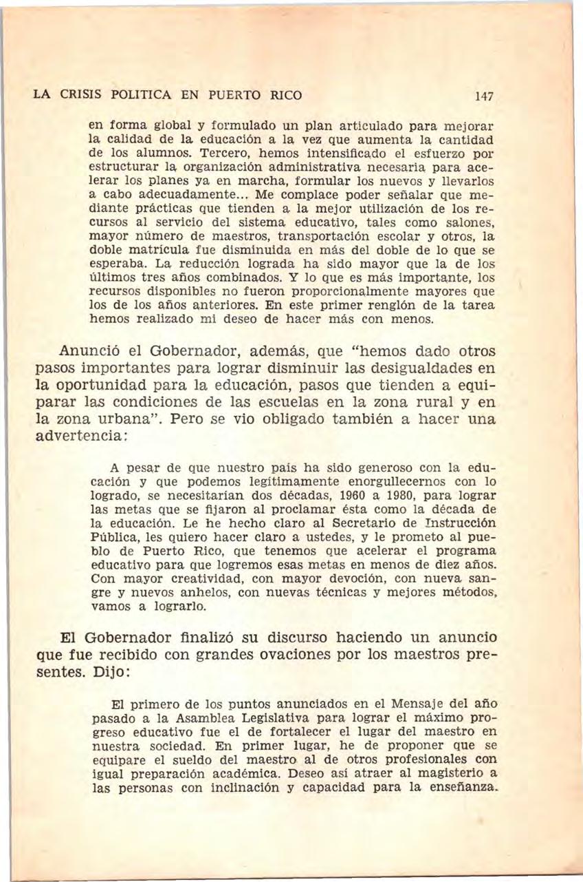 "En Puerto Rico Ia des esperaci6n se ha transformado en esperanza, Ia dependencia en di gnidad , la miseria en progreso, Ia inercia en acci6n. Todo esto ha ocurrido en menos de treinta afios. Nada mas natural que para aquellos de nosotros que contribuimos a dirigir esa revoluci6n, el cambio continue siendo el media para alcanzar el progreso, el instrumento para resolver los problemas. Desde Iuego que no buscamos lo nuevo por si mismo, ni tampoco lo aceptamos meramente porque sea ine vita ble. Mas bien lo que vemos en es te proceso de ponerlos al dia y de hacer frente a las demandas de un cambio aceler ado es Ia oportunidad de dar cada vez mas sentido y realida d a los tradicionales valores de la dignidad humana y el valor individual."