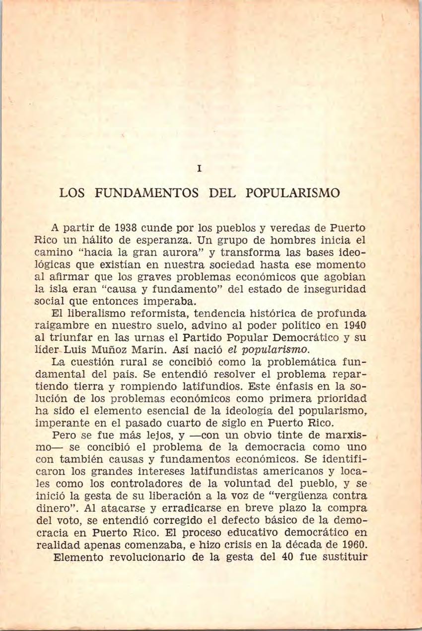 El liberalismo reformista, tendencia hist6rica de profunda raigambre en nuestro suelo, advino al poder politico en 1940 al triunfar en las urnas el Partido Popular Democratico y su lider- Luis Mufi.oz Marin. Asi naci6 el popularis,mo.
