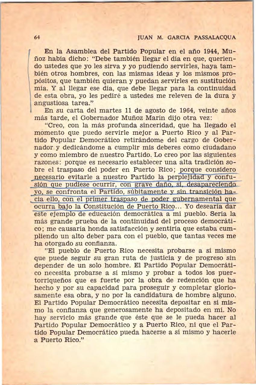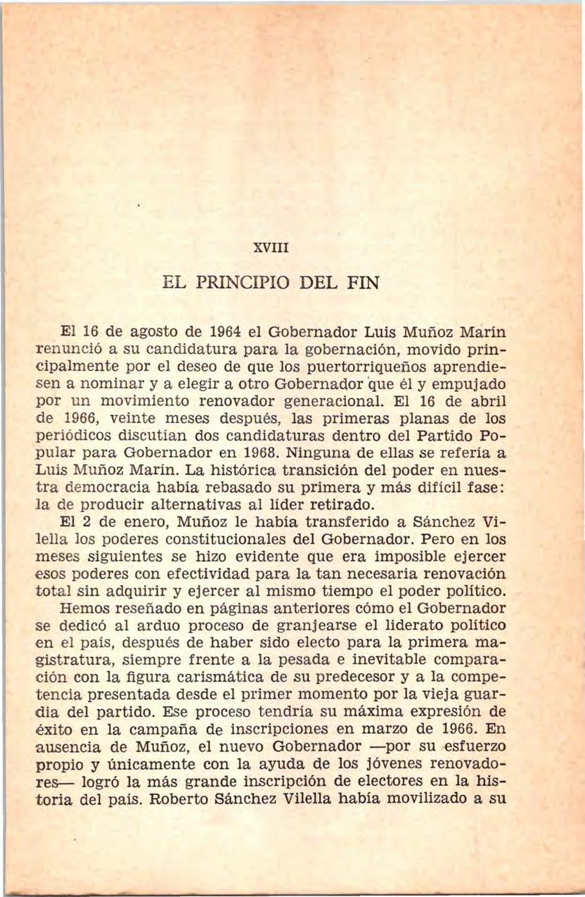 El 16 de agosto de 1964 el Gobernador Luis Mufi.oz Marin renunci6 a su candidatura para la gobernaci6n, movido principalmente por el deseo de que los puertorriquefios aprendiesen a nominar ya elegir a otro Gobernador 'que el y empujado por un movimiento renovador generacional. El 16 de abril de 1966, veinte meses despues, las primeras planas de los peri6dicos discutian dos candidaturas dentro del Partido Popular para Gobernador en 1968. Ninguna de ellas se referia a Luis Mufi.oz Marin. La hist6rica transici6n del poder en nuestra democracia habia rebasado su primera y mas dificil fase: la de producir alternativas al lider retirado.