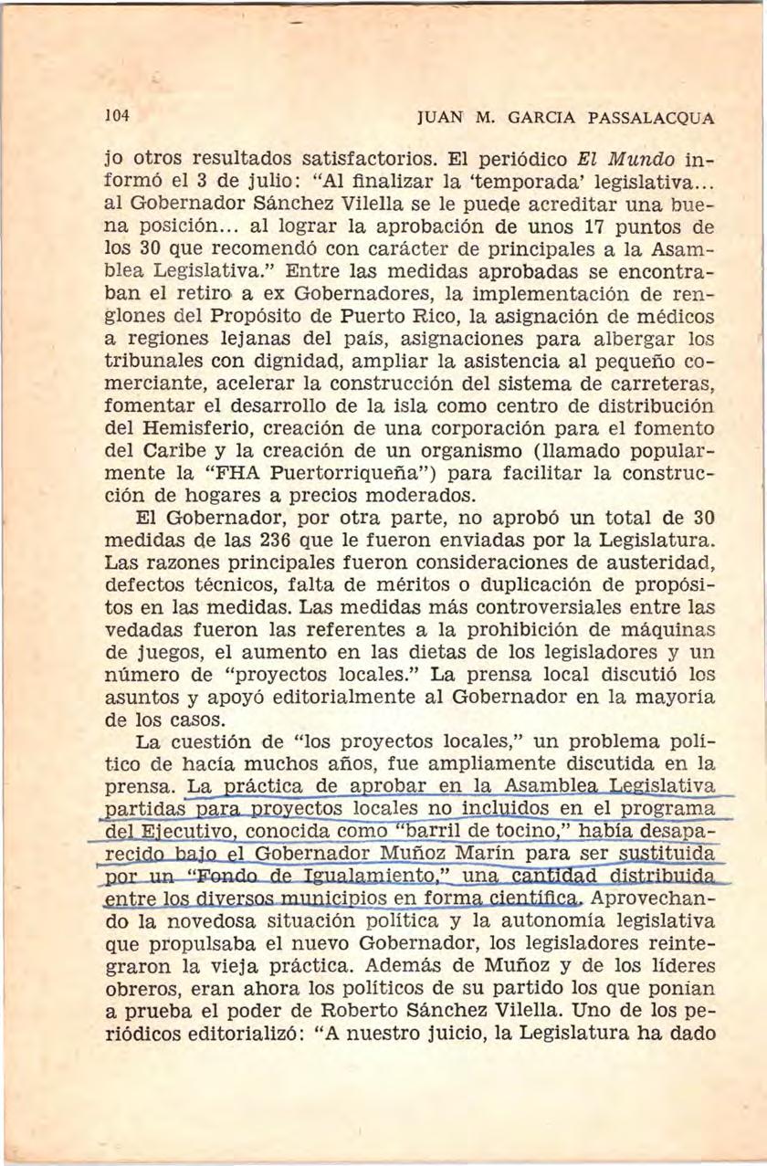 En esa misma conferencia de prensa el Gobernador sefia16 que "habia aprendido mucho" con el proceso referente al debatido proyecto, el que convirti6 en Ley en el mes de junio. Era obvio que el complejo industrial-financiero de la isla le habia infligido una gra ve derrota a su administraci6n. Realizamos entonces que el poder habia pasado del proceso politico, una vez mas, a manos de los grandes intereses.