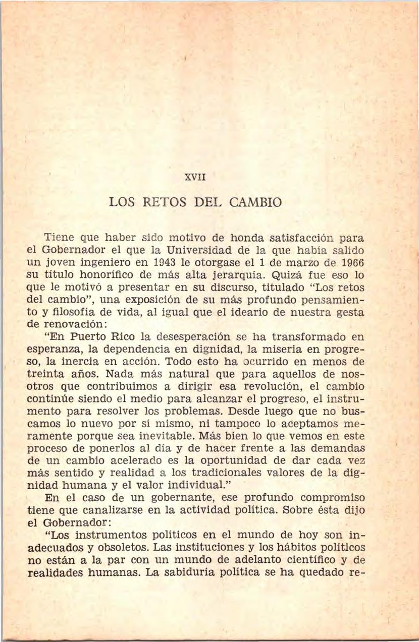 Ti ene que habe r sido motivo de honda satisfacci6 n para el Gobernador el que Ia Universidad de Ia que habia salido un joven ingeniero en 1943 le otorgase el 1 de marzo de 1966 su titulo honorifico de mas alta jerarquia. Quiza fu e eso Io que le motiv6 a presen tar en su discurso, titulado "Los retos del cambio", una exposici6n de su mas prof undo pensa miento y filosofia de vida, al igual que el ideario de nuestr a gesta de renovaci6n: