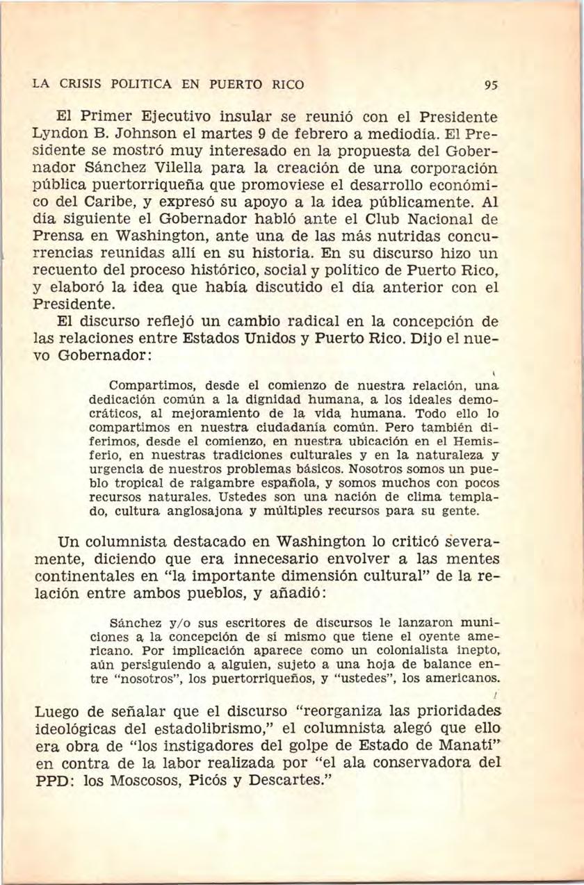 Profundamente convencidos de que la labor de la Comision de Status resultaria academica si no se definia el crecimiento del ELA, y creyendo que el pueblo de Puerto Rico debia conocer todos las pormenores del mismo antes de ir a un plebiscito a votar par dicho status, Sanchez y este autor discutimos extensamente la grave situacion par tres dias consecutivos con la participacion de un joven amigo norteamericano del Gobernador, que habia venido a la isla con motivo