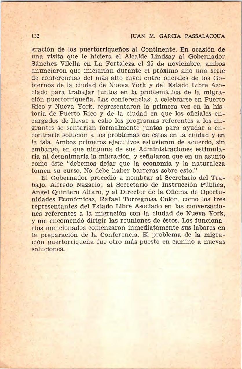 de lo Interior en Asuntos Insulares, Wayne Aspinall; los miembros de la Comisi6n de Status Leo O'Brien, Roger C. Morton, Henry M. Jackson y Jacob Javitts, y los congresistas John P. Saylor, miembro del Com ite de lo Interior, y Gaylord Nels on, miembro del Comite del Trabajo. En la Casa Blan ca el Gobernador visit6 ademas a Harry McPherson, Ayudante Especial del Presiden te, quien, luego de la partida de Lee C. White, habria de tener a su car go los asuntos referen tes a Puerto Ric o, que se tramitan en la Casa Blanca desde 1961 debido a una Orden Ejecutiva del entonces Presidente Kennedy. Ademas de una serie de actividades relacionadas con la pre nsa , el Gobernador se reuni6 en Washington con James H. Rowe, Presidente de la Comisi6n de Status; con Lincoln Gordon, Sub-Secretario de Estado para Asuntos Latinoamericanos; con el Embajador de los Estados Unidos en la Organizaci6n de Estados Americ anos, Elsworth Bunker; con Ben Stephansky, Secretario Ejecutivo de la Comisi6n de Status, y con otros altos funcionarios. De regreso el Gobernador se detuvo en Nueva York, donde se reuni6 con el Alcalde, John V. Lindsay, y con el Presidente del Consejo de la Ciudad de Nueva York, Frank O ' Connor, discutiendo con ambos los planes para la celebraci6n de la Conferencia de alto nivel para diciembre de 1966.