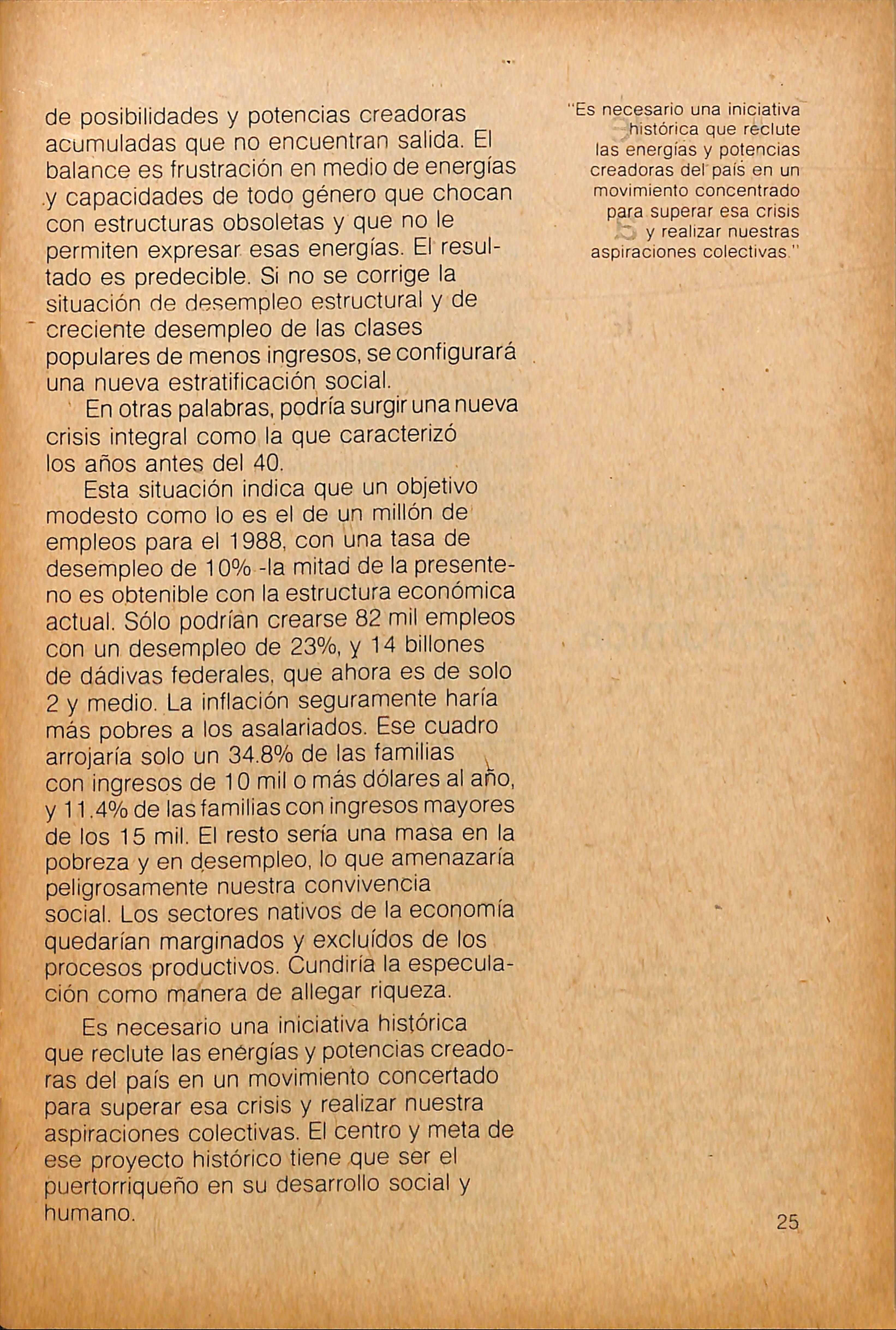 Por todo lo anterior, urge una reevaluación completa del proyecto puertorriqueño, de sus metas y posibilidades, en aras de una estrategia integrada que pueda con frontar viejos problemas y conflictos en forma viable y saludable. Frente a la compla cencia de los que consideran que el malestar puertorriqueño es normal como incidental al progreso, y frente a los que no ven antídoto alguno a la disolución inevi table del país hasta convertirse en un arrabal de los Estados Unidos, nosotros nos encararemos al reto.