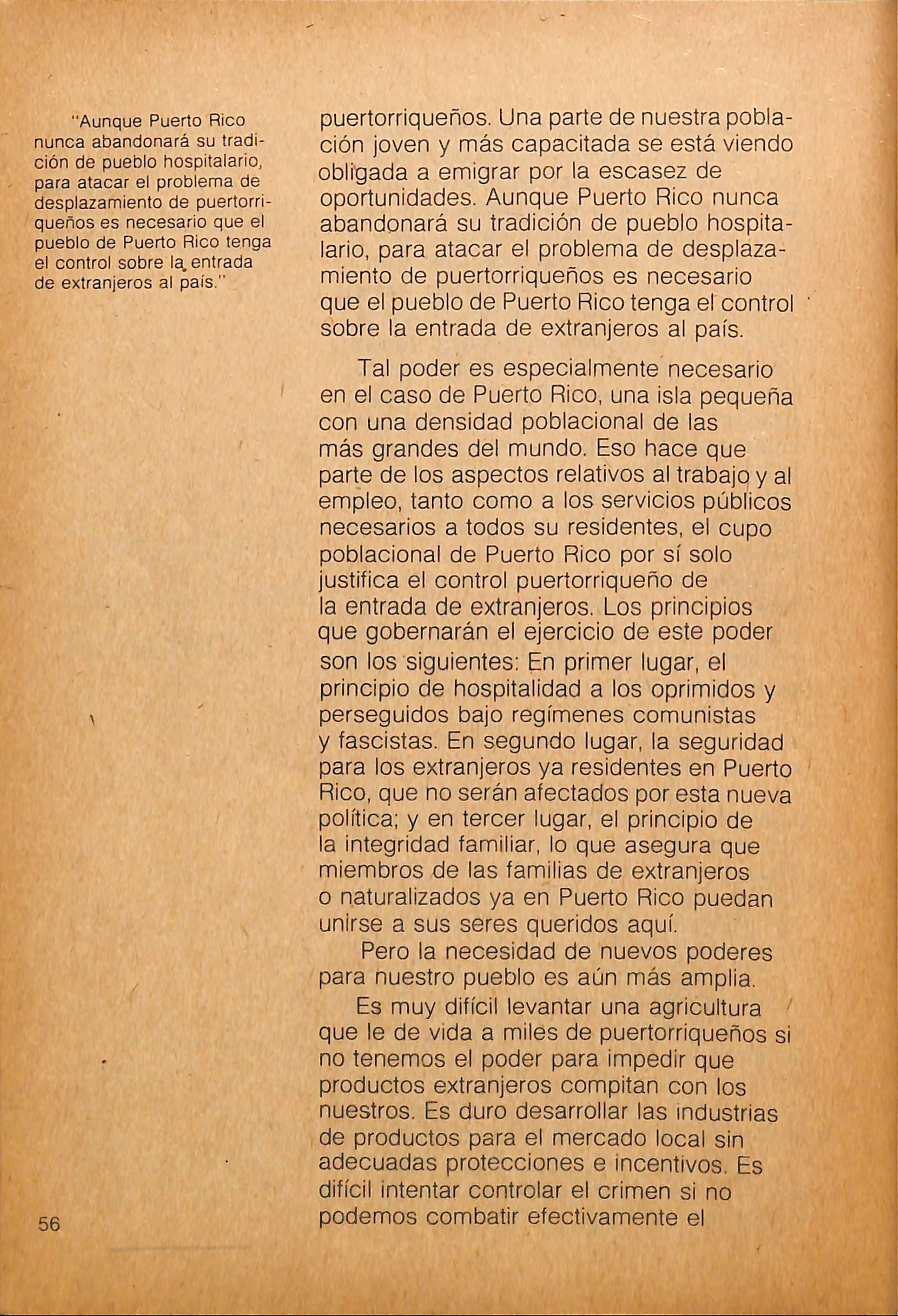 puertorriqueños. Una parte de nuestra pobla ción joven y más capacitada se está viendo obligada a emigrar por la escasez de oportunidades. Aunque Puerto Rico nunca abandonará su tradición de pueblo hospita lario, para atacar el problema de desplaza miento de puertorriqueños es necesario que el pueblo de Puerto Rico tenga el control sobre la entrada de extranjeros al país.