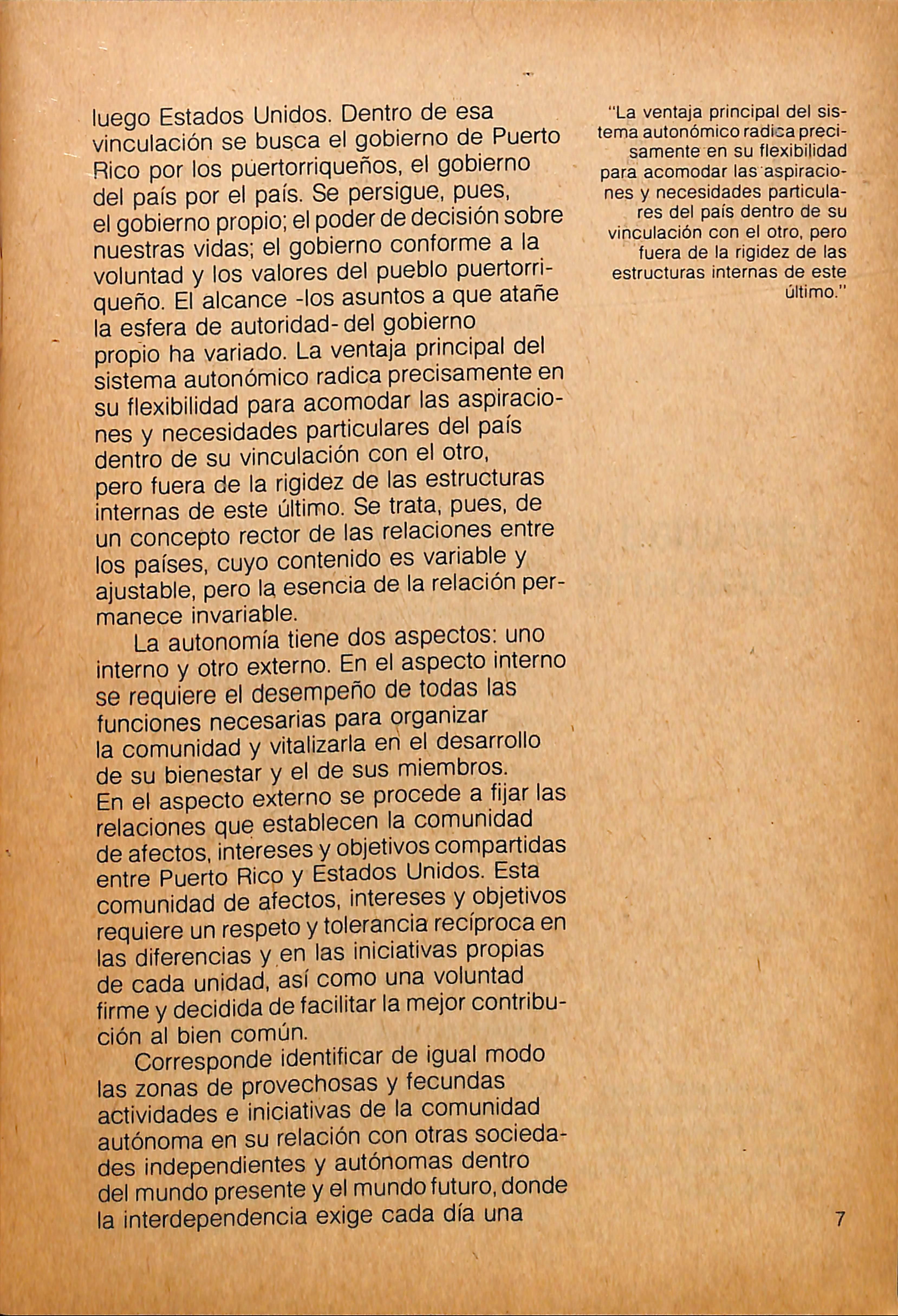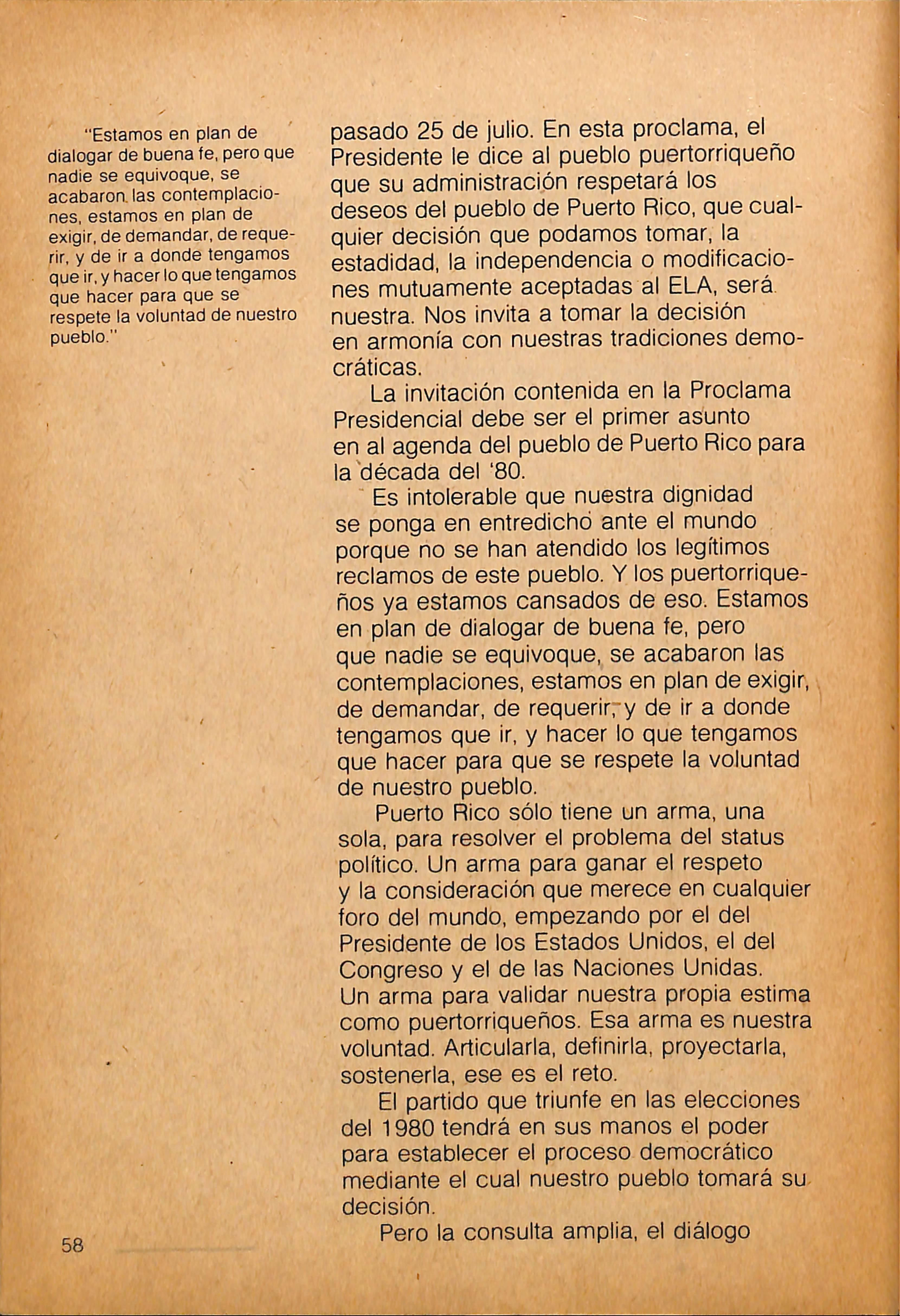 "Para que nuestro pueblo se pueda enfrentar a los retos de la década del '80 y pueda realizar sus aspiraciones necesita una mayor autoridad política sobre su propia vida. Obtener esa autoridad supone efectuar una serie de cam bios al Estado Libre Asociado."