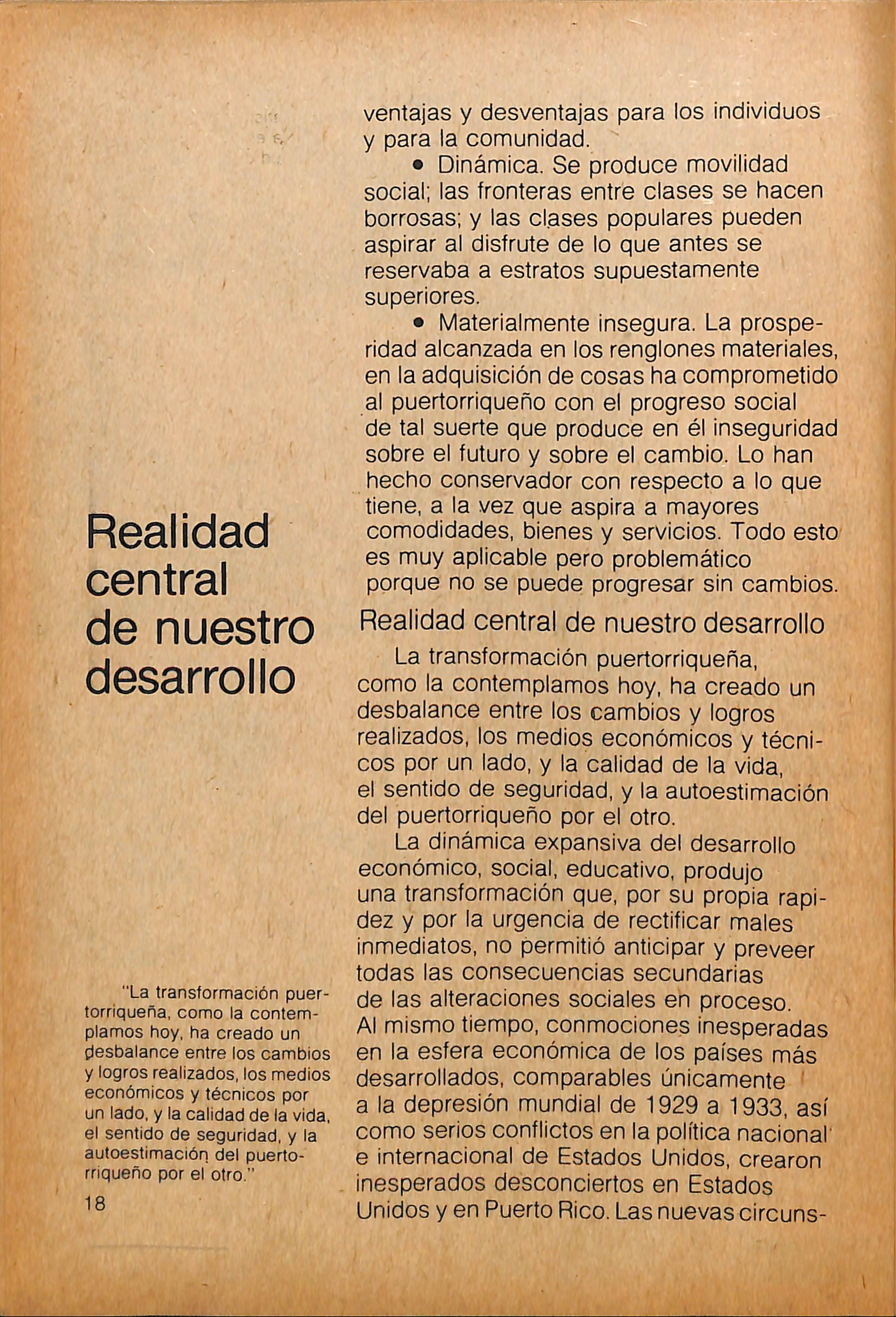 "La transformación puer torriqueña, como la contem plamos hoy, ha creado un tfesbalance entre los cambios y logros realizados, los medios económicos y técnicos por un lado, y la calidad de la vida, el sentido de seguridad, y la auloestimación del puerto rriqueño por el otro." 18