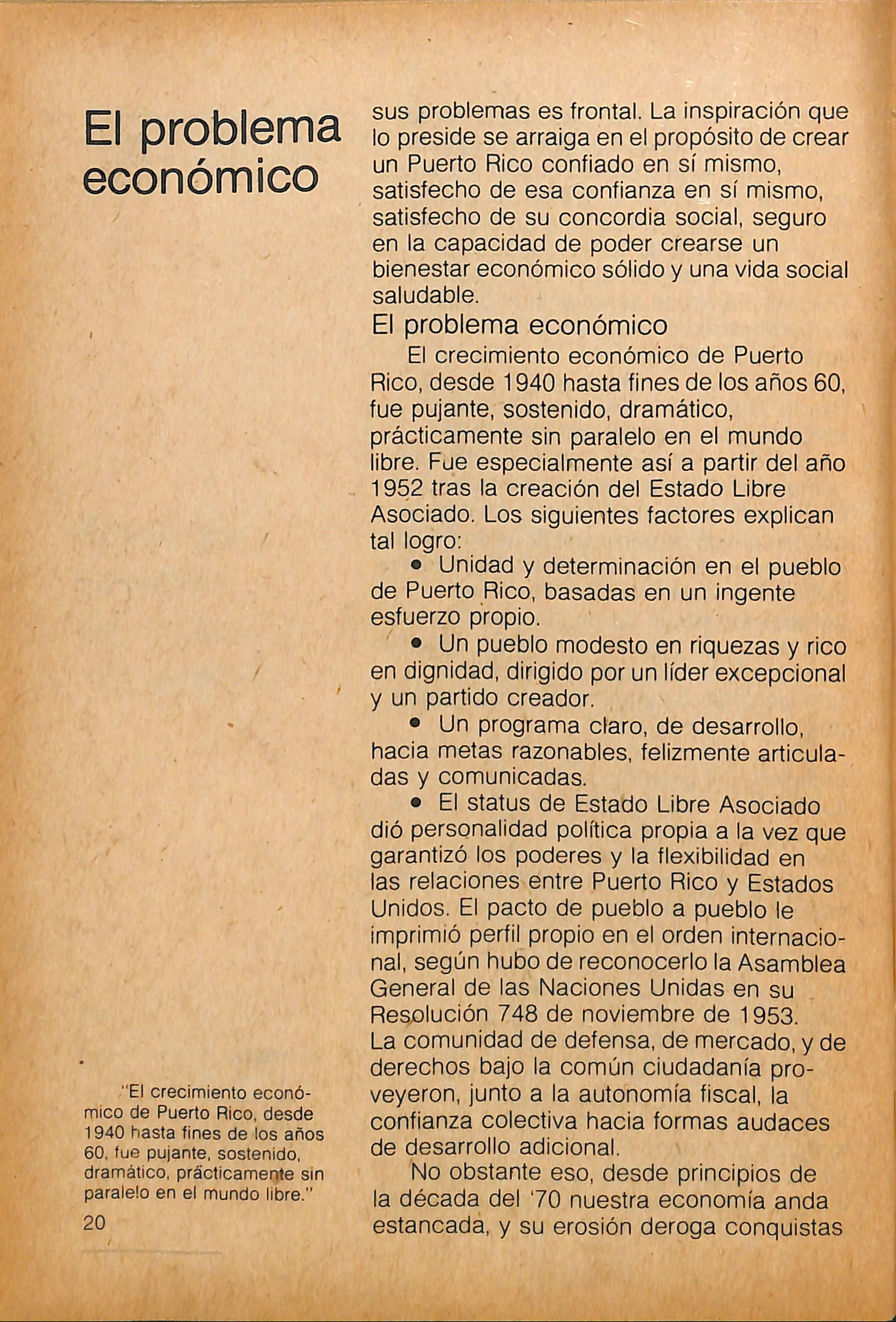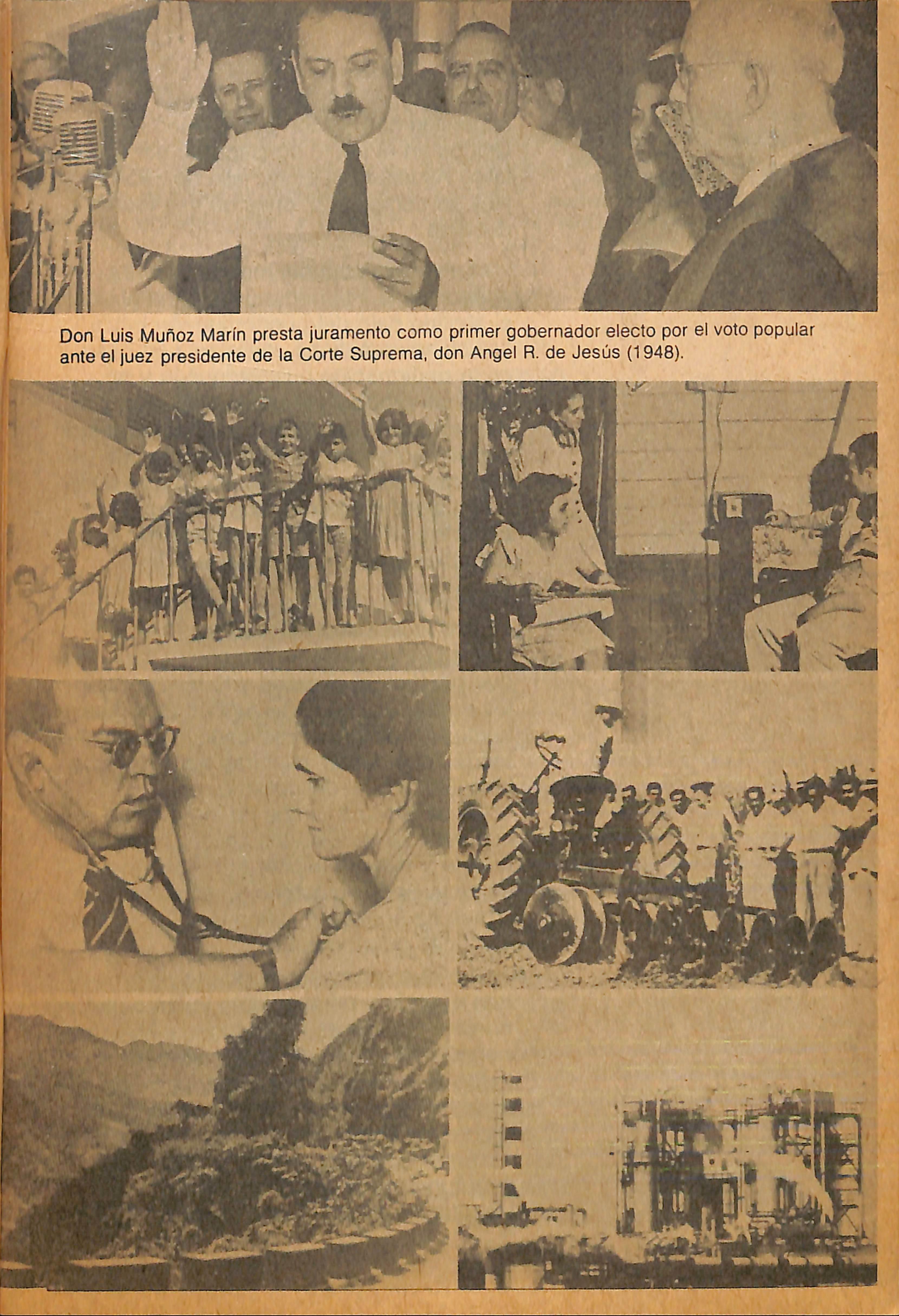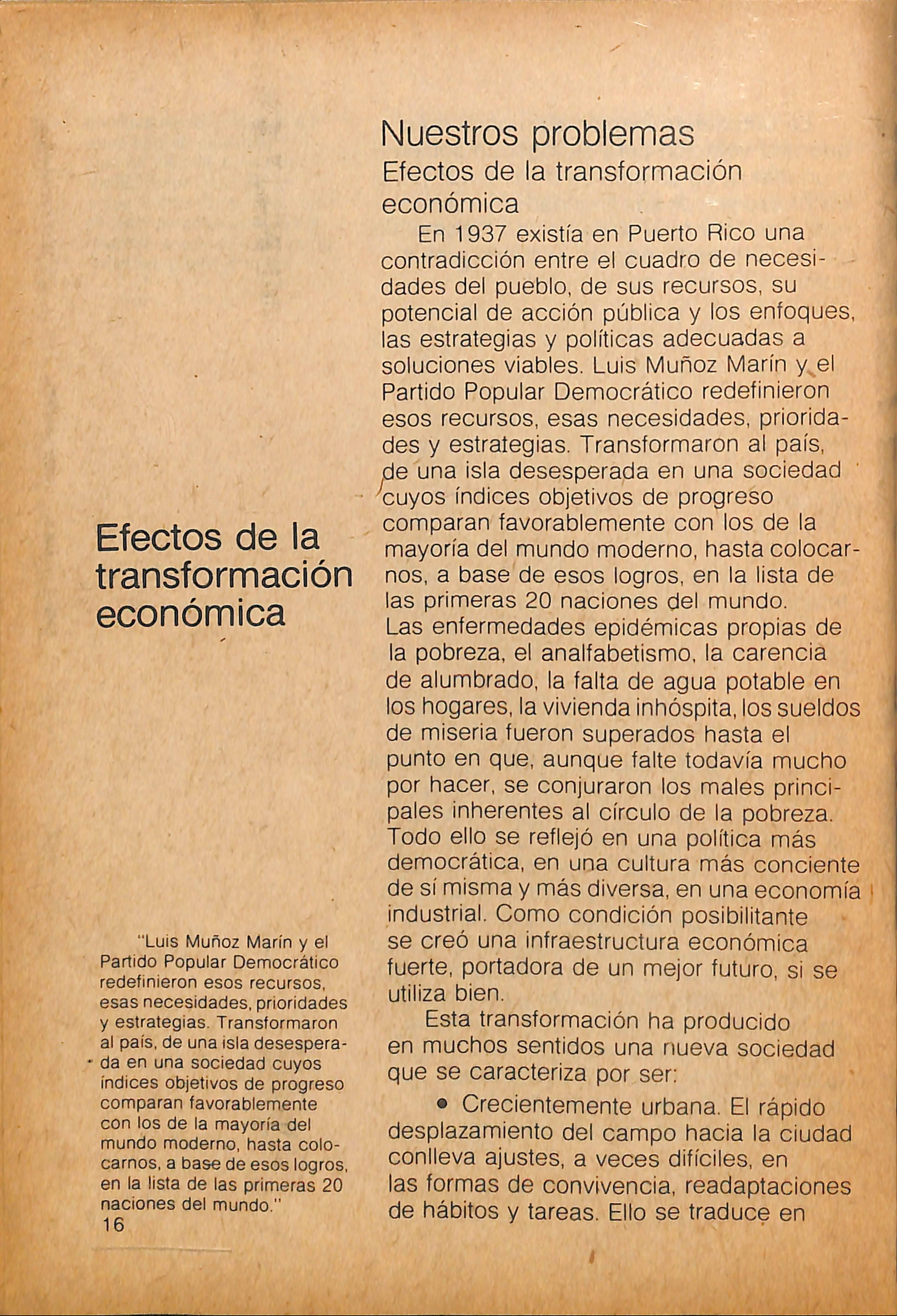"Luis Muñoz Marín y el Partido Popular Democrático redefinieron esos recursos, esas necesidades, prioridades y estrategias. Transformaron al país, de una isla desespera da en una sociedad cuyos índices objetivos de progreso comparan favorablemente con los de la mayoría del mundo moderno, tiasta colo carnos, a base de esos logros, en la lista de las primeras 20 naciones del mundo." 16