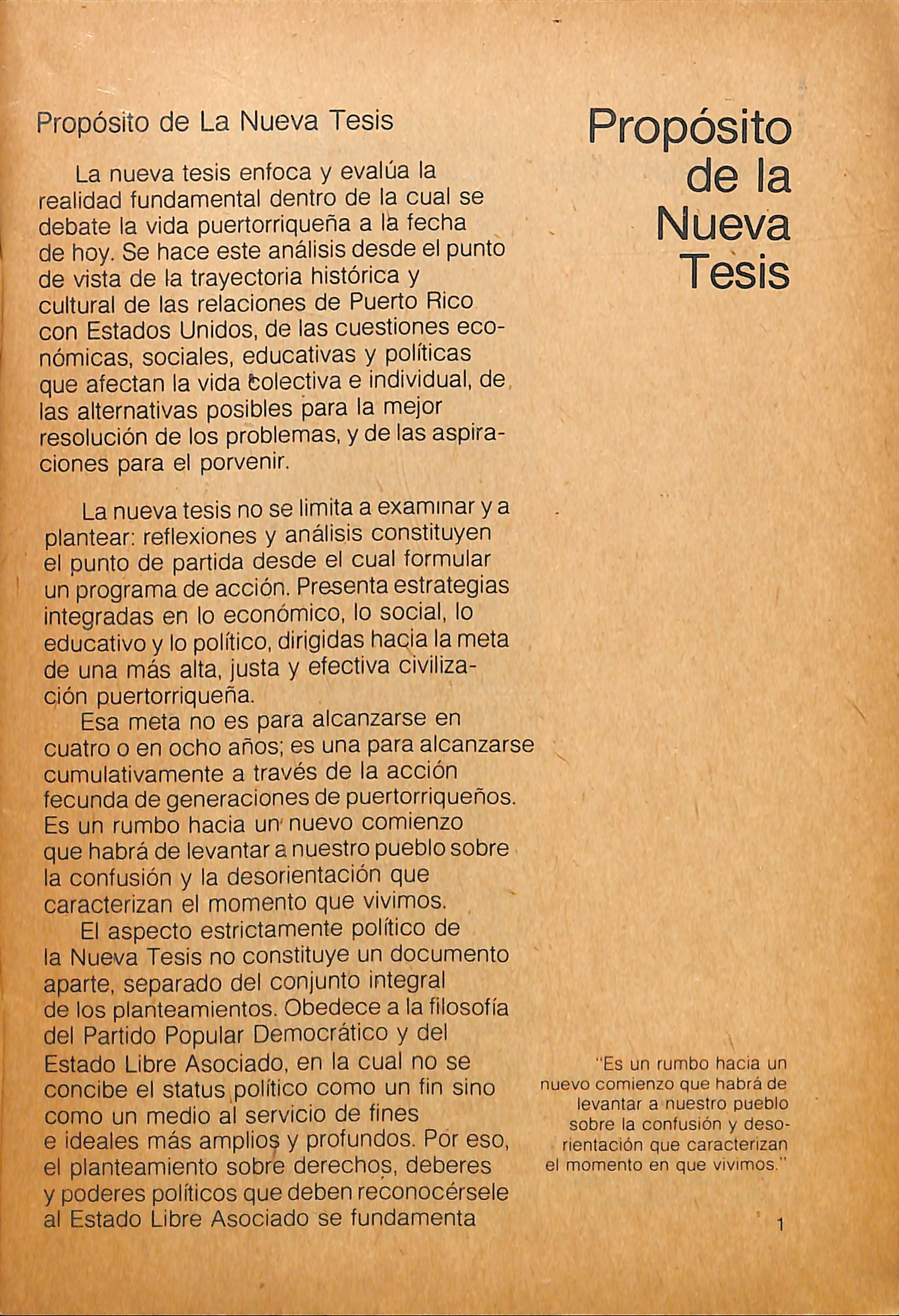 "La nueva tesis es un (plan de afirnnacióitf^^SfiJ puertorriqueña qüe va más allá del stati político con un llamado a los pueatorriquéñ^ de todos los partidos pai'a desarrollar unaeconomía y una sociedad dé justicia'en la cual nuestro pueblo determine áu déstirüb.^ri