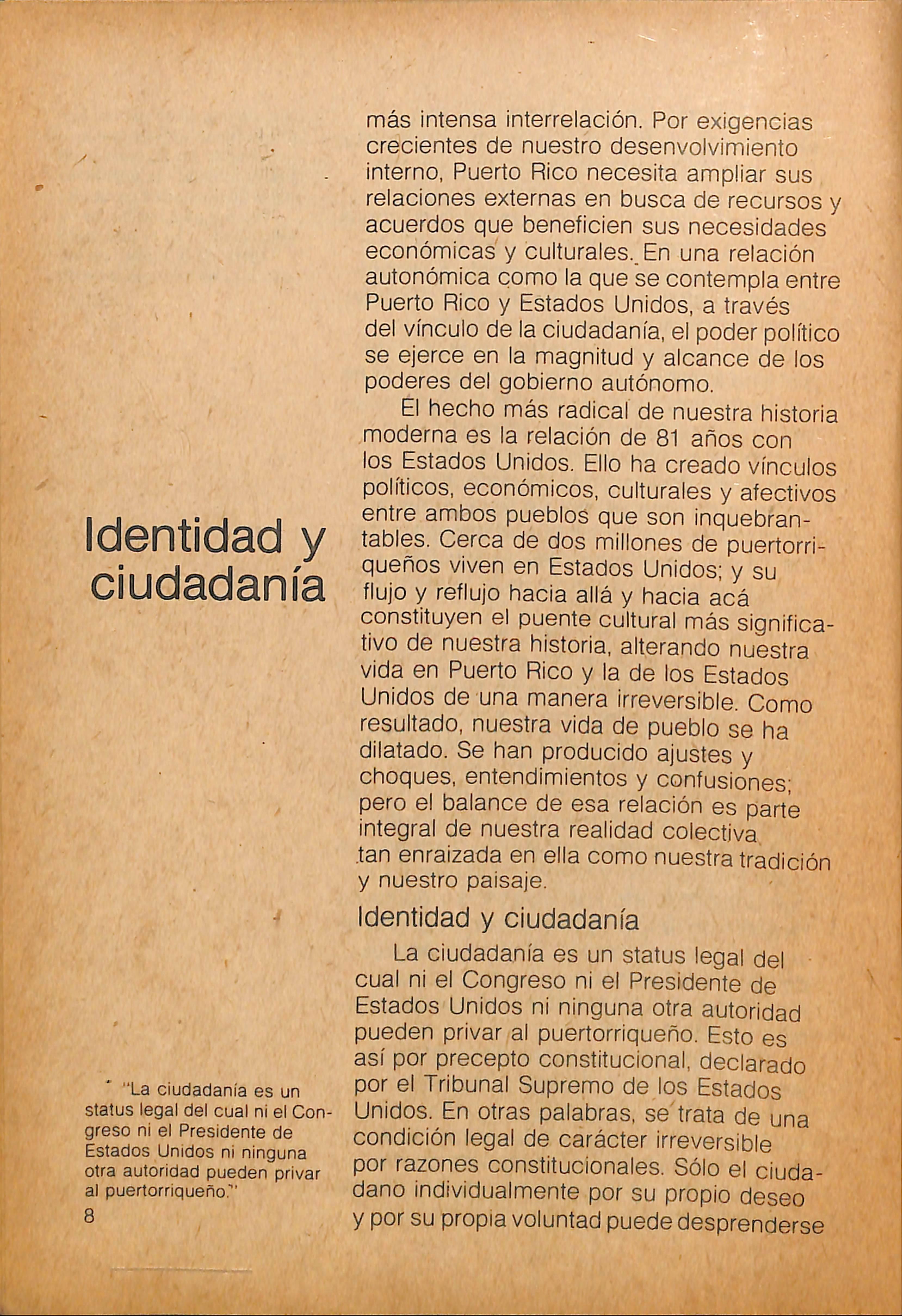 "La ciudadanía es un status legal del cual ni el Con greso ni el Presidente de Estados Unidos ni ninguna otra autoridad pueden privar al puertorriqueño.'" 8 más intensa interrelacíón. Por exigencias crecientes de nuestro desenvolvimiento interno, Puerto Rico necesita ampliar sus relaciones externas en busca de recursos y acuerdos que beneficien sus necesidades económicas y culturales..En una relación autonómica como la que se contempla entre Puerto Rico y Estados Unidos, a través del vínculo de la ciudadanía, el poder político se ejerce en la magnitud y alcance de los poderes del gobierno autónomo. El hecho más radical de nuestra historia moderna es la relación de 81 años con los Estados Unidos. Ello ha creado vínculos políticos, económicos, culturales y afectivos entre ambos pueblos que son inquebran tables. Cerca de dos millones de puertorri queños viven en Estados Unidos; y su flujo y reflujo hacia allá y hacia acá constituyen el puente cultural más significa tivo de nuestra historia, alterando nuestra vida en Puerto Rico y la de los Estados Unidos de una manera irreversible. Como resultado, nuestra vida de pueblo se ha dilatado. Se han producido ajustes y choques, entendimientos y confusiones; pero el balance de esa relación es parte integral de nuestra realidad colectiva .tan enraizada en ella como nuestra tradición y nuestro paisaje.