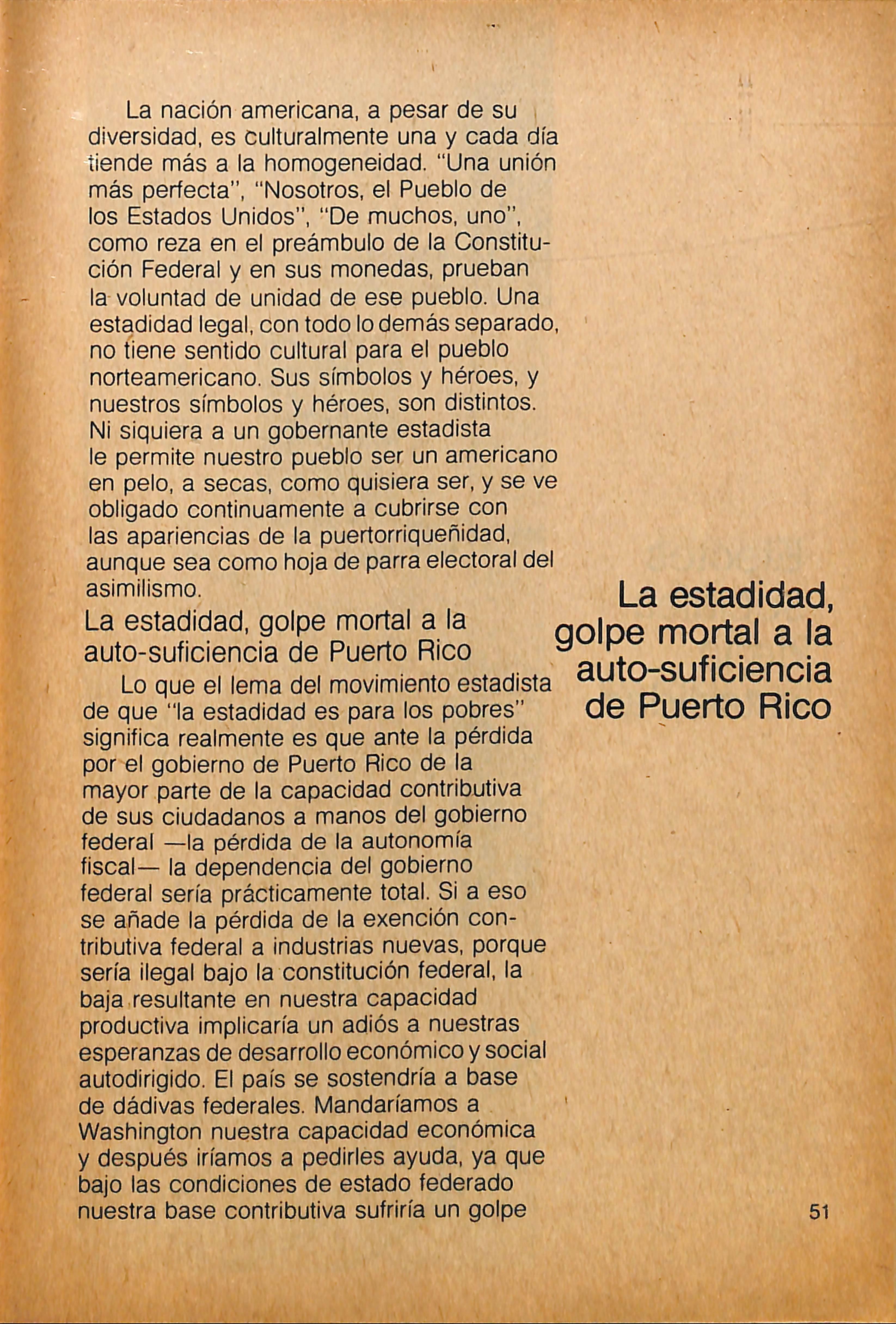 La nación americana, a pesar de su diversidad, es culturalmente una y cada día tiende más a la homogeneidad. "Una unión más perfecta", "Nosotros, el Pueblo de los Estados Unidos", "De muchos, uno", como reza en el preámbulo de la Constitu ción Federal y en sus monedas, prueban la voluntad de unidad de ese pueblo. Una estadidad legal, con todo lo demás separado, no tiene sentido cultural para el pueblo norteamericano. Sus símbolos y héroes, y nuestros símbolos y héroes, son distintos. Ni siquiera a un gobernante estadista le permite nuestro pueblo ser un americano en pelo, a secas, como quisiera ser, y se ve obligado continuamente a cubrirse con las apariencias de la puertorriqueñidad, aunque sea como hoja de parra electoral del asimilismo.