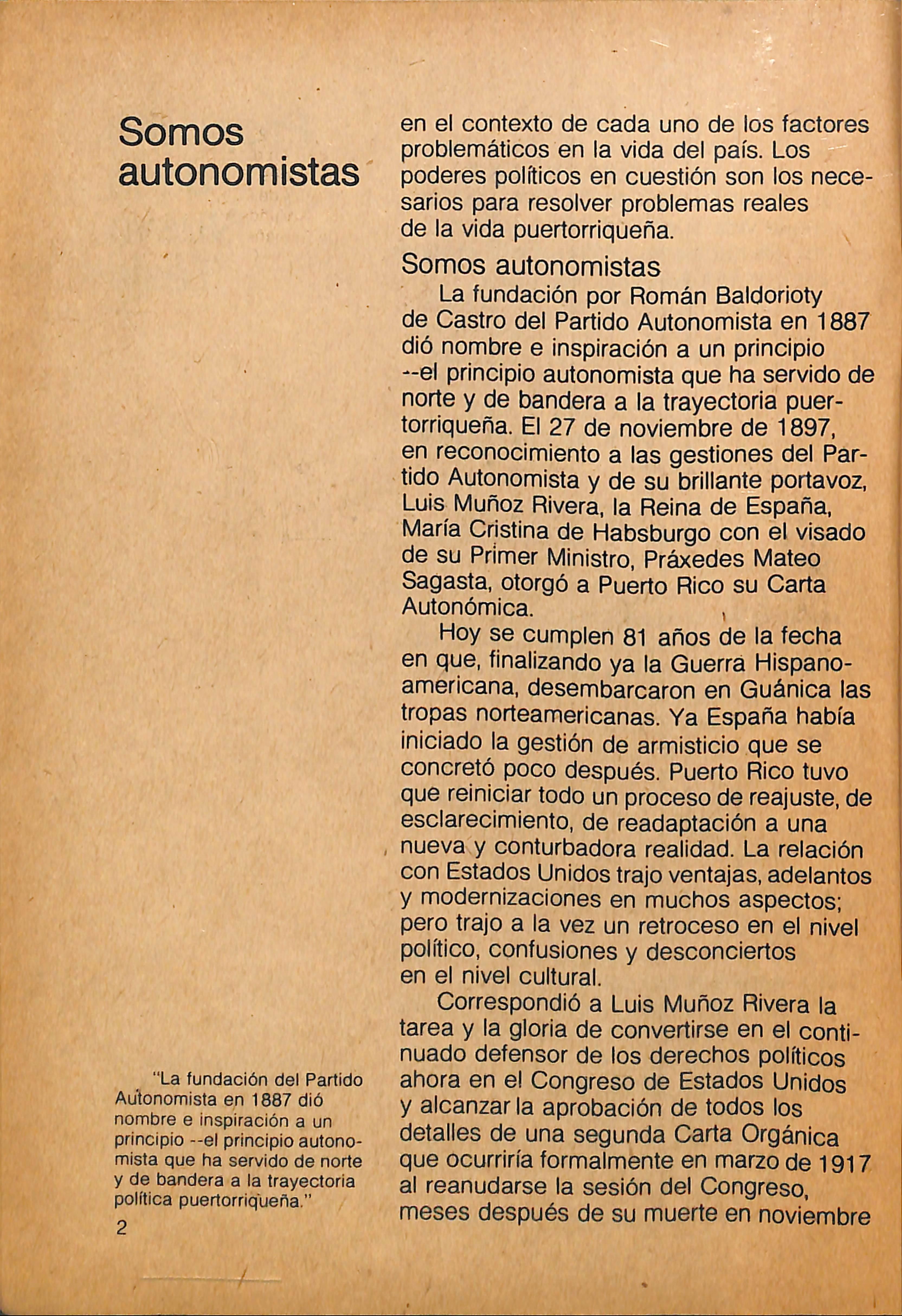 "La fundación del Partido Aulonomista en 1887 dió nombre e inspiración a un principio --ei principio autono mista que fia servido de norte y de bandera a la trayectoria política puertorriqueña." 2