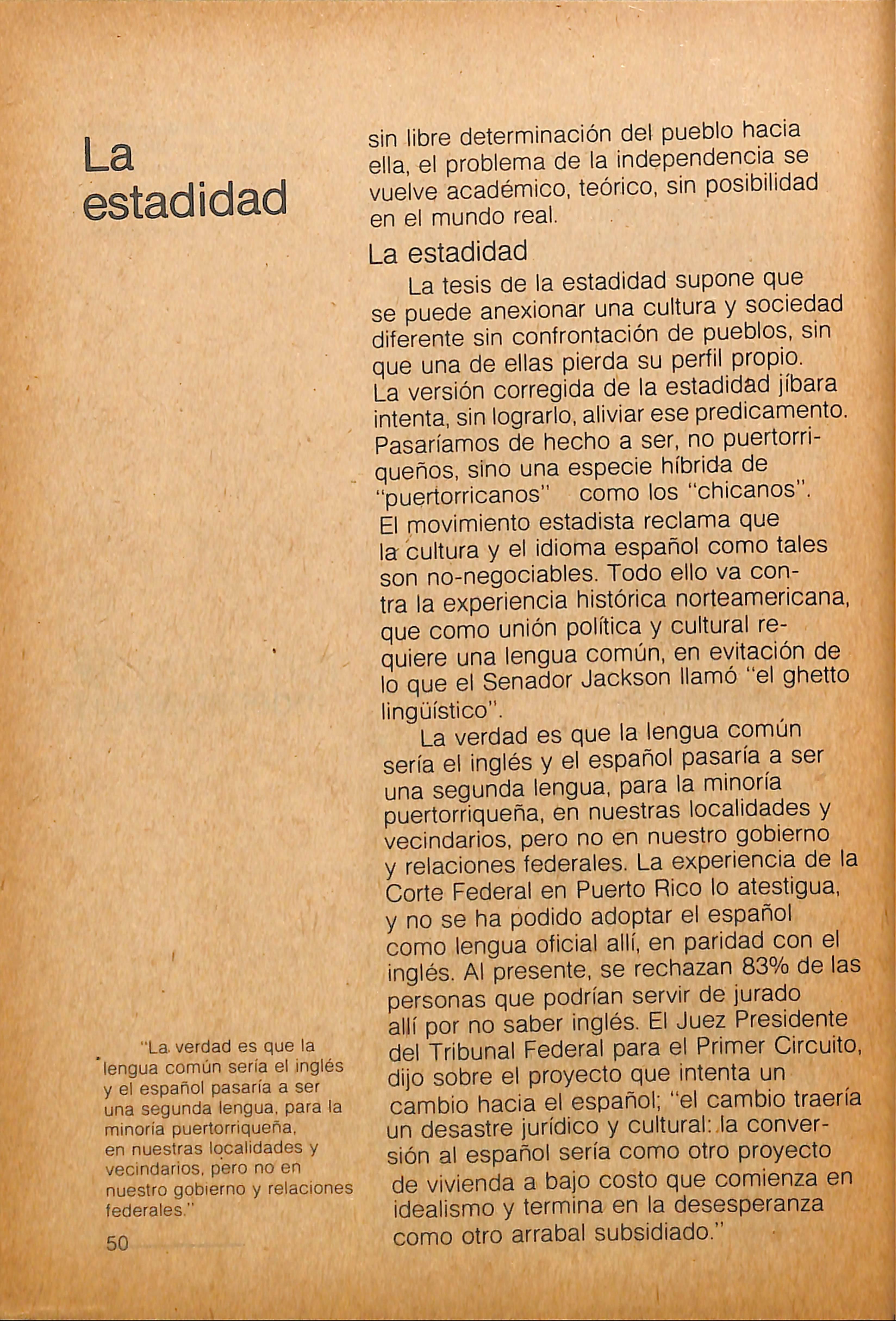 El movimiento estadista reclama que la cultura y el idioma español como tales son no-negociables. Todo ello va con tra la experiencia histórica norteamericana, que como unión política y cultural re quiere una lengua comijn, en evitación de lo que el Senador Jackson llamó el ghetto lingüístico".