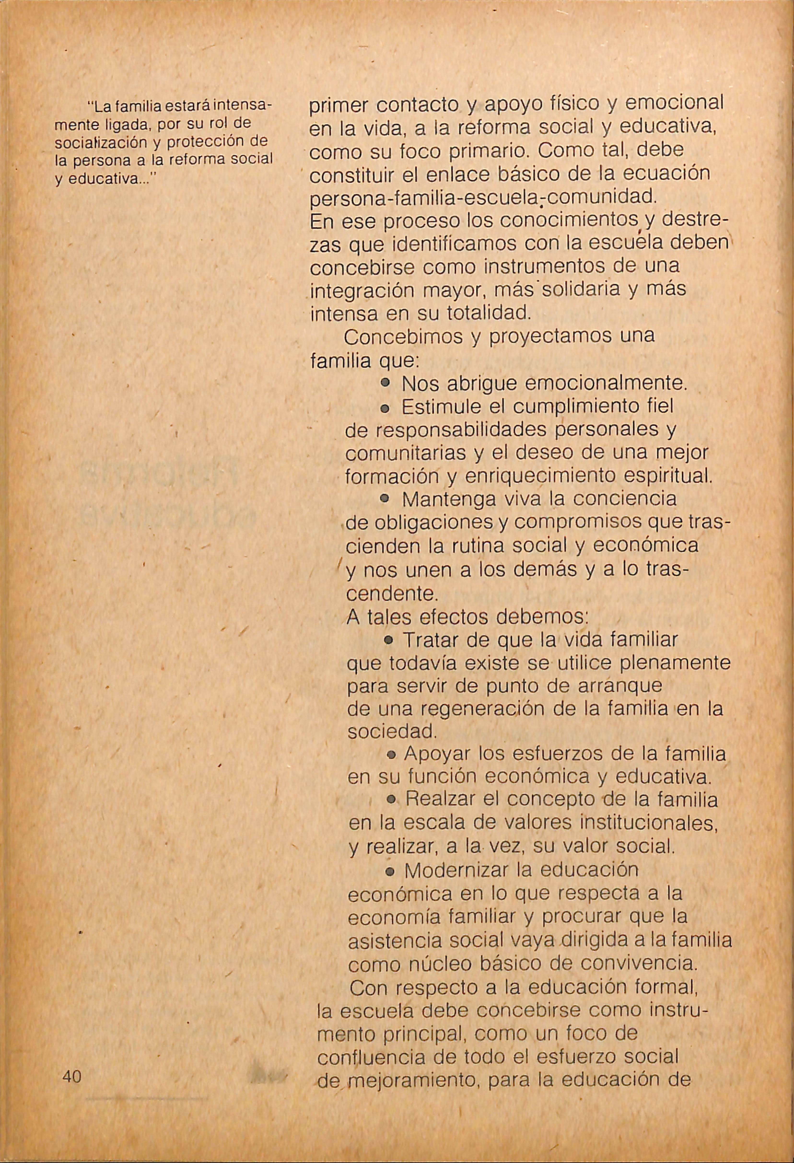 • Modernizar la educación económica en lo que respecta a la economía familiar y procurar que la asistencia social vaya dirigida a la familia como núcleo básico de convivencia. Con respecto a la educación formal, la escuela debe concebirse como instru mento principal, como un foco de confluencia de todo el esfuerzo social de. mejoramiento, para la educación de
