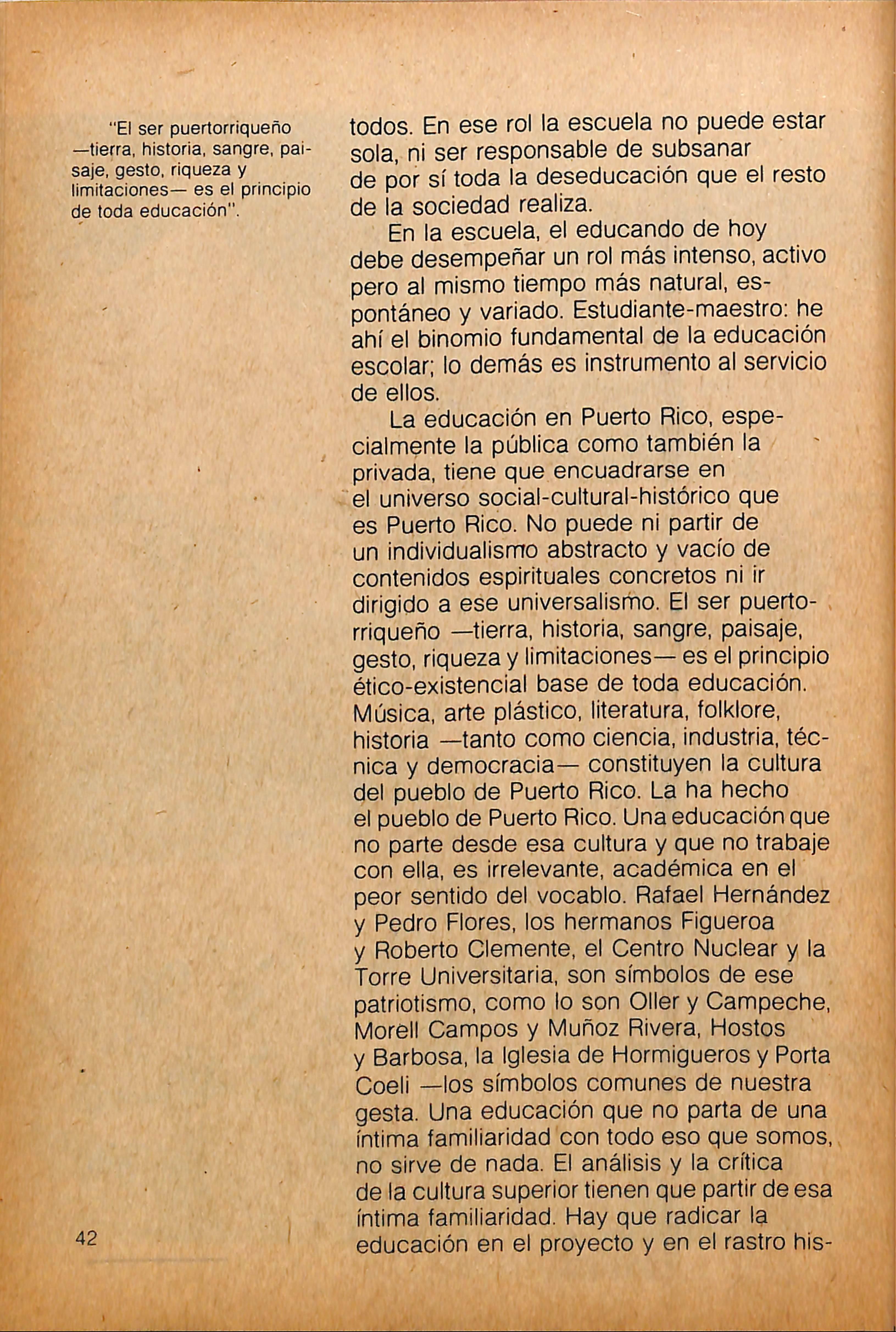 "Es sólo medíante estos valores particulares que se sostendrá en el puertorriqueño la aspiración universal de toda educación, ya que es solo así, desde la convivencia particular, que se puede llegar a lo ajeno, lo universal y lo trascendente." '