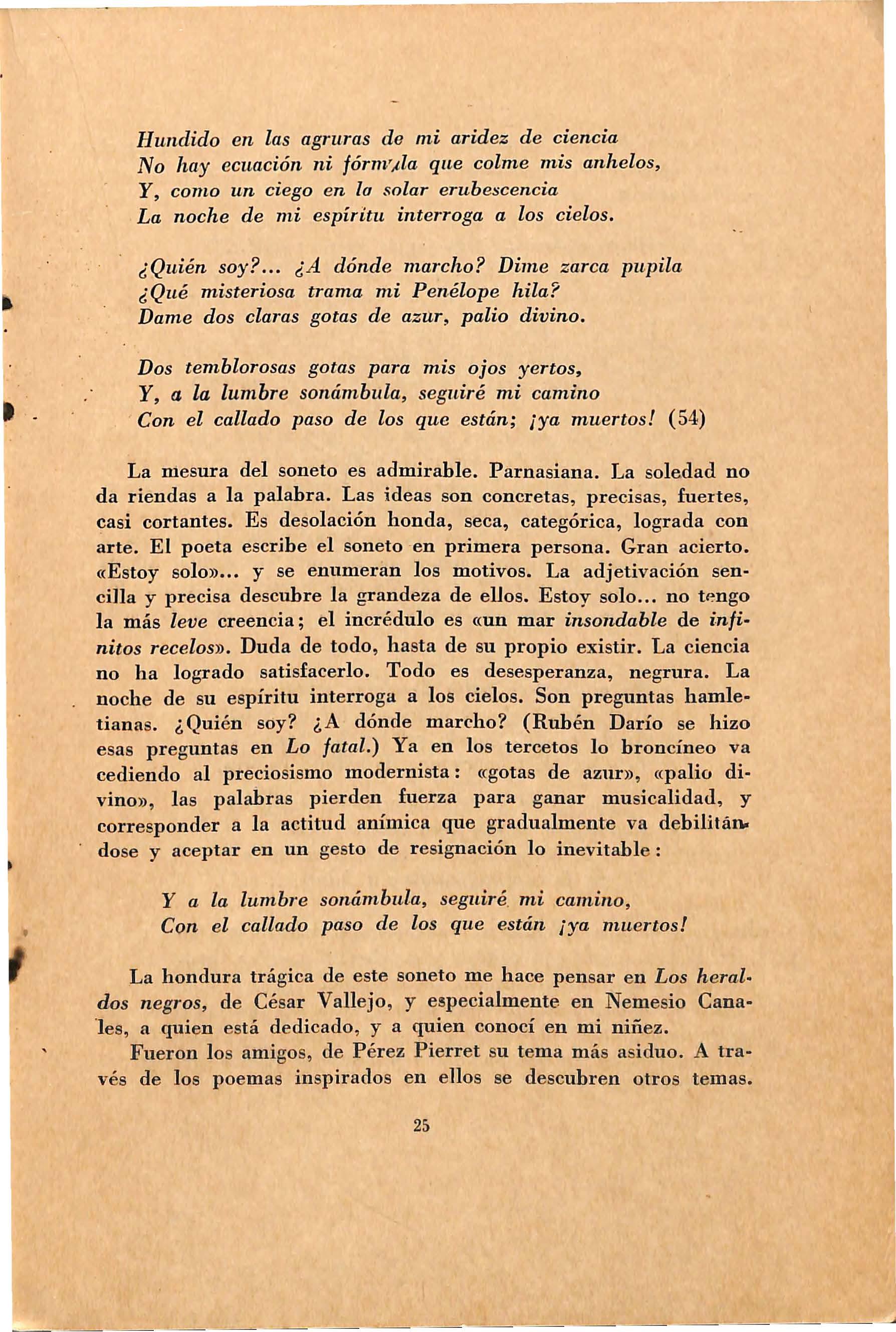 M ond r a g ón ( 53 ), l os poet a s no s on clá si c o s, ni románti c o s, ni n:iod e rni st a s, so n si m pl e m e nte po e ta s Y poeta es r e alm e nt e P é rez · P ier r e t: qu e co nt e mpla la b e lle za d e lo qu e v iv e ; y ama la v ida, la juven tud , la e se n c ia de la e mo ción, la fo r taleza d e l ver s o , los pe n s amie nto s bron cín e o s, lo s t e ma s eternos. No ha y duda que Pér e z Pi err e t no da c abid a a blandura s emotiva s ; a s pira a cince lar , a r e puj a r , a esc ul p ir c o mo e l parna siano, pero entr e ratos la fi gura bron cín e a s e · d es dobla , adqui e re su más íntima person a lid a d y s u g i e r e l a inman e n cia de su ser. L a v id a sa ti sfech a d e l po et a lo hace su sceptible al placer del r ec ono cim i e nto nobl e de la s co sas inmediata s y lo s s er es que le. rod e an . E sto lo d esv ía un poco d e la actitud moderni sta hacia l o ce r can o. Pé r e z Pi e rr e t c a si si e mpre s e vale d e l soneto. Unas veces e n e nd ecas íl a b os, otra s e n al e jandrino s, muchas v eces logra e l c ort e cl ás i c o p e rfecto , co mo e n e l po e ma Viejo tema romántico. E n t odo caso ha ce c aptar al l e ctor la grandeza , la perfe c ción o d esa li e nto d e l hombr e o el t e m a objeto d e poetización. E so sent imo s al l ee r lo s po e m as El l a udo, el Responso, e< a Ja memoria d e l i nmo1·tal Rose nd o M ati e nzo CintrÓm), o e l s oneto Esto y s olo , d e dica d o a Neme si o Ca n a l e s . Para mí Jo s' tr es má s h e rmo o s po e mas qu e co noz c o d e P é r e z Pi e rret. En Estoy s olo se talla , no lo fí sico o i n t e l ec tu a l d e un hombre , sino que se ima g ina la de solación a n g u stio sa d e un es pír i tu escé pti c o que ha olvidado a Dio s :