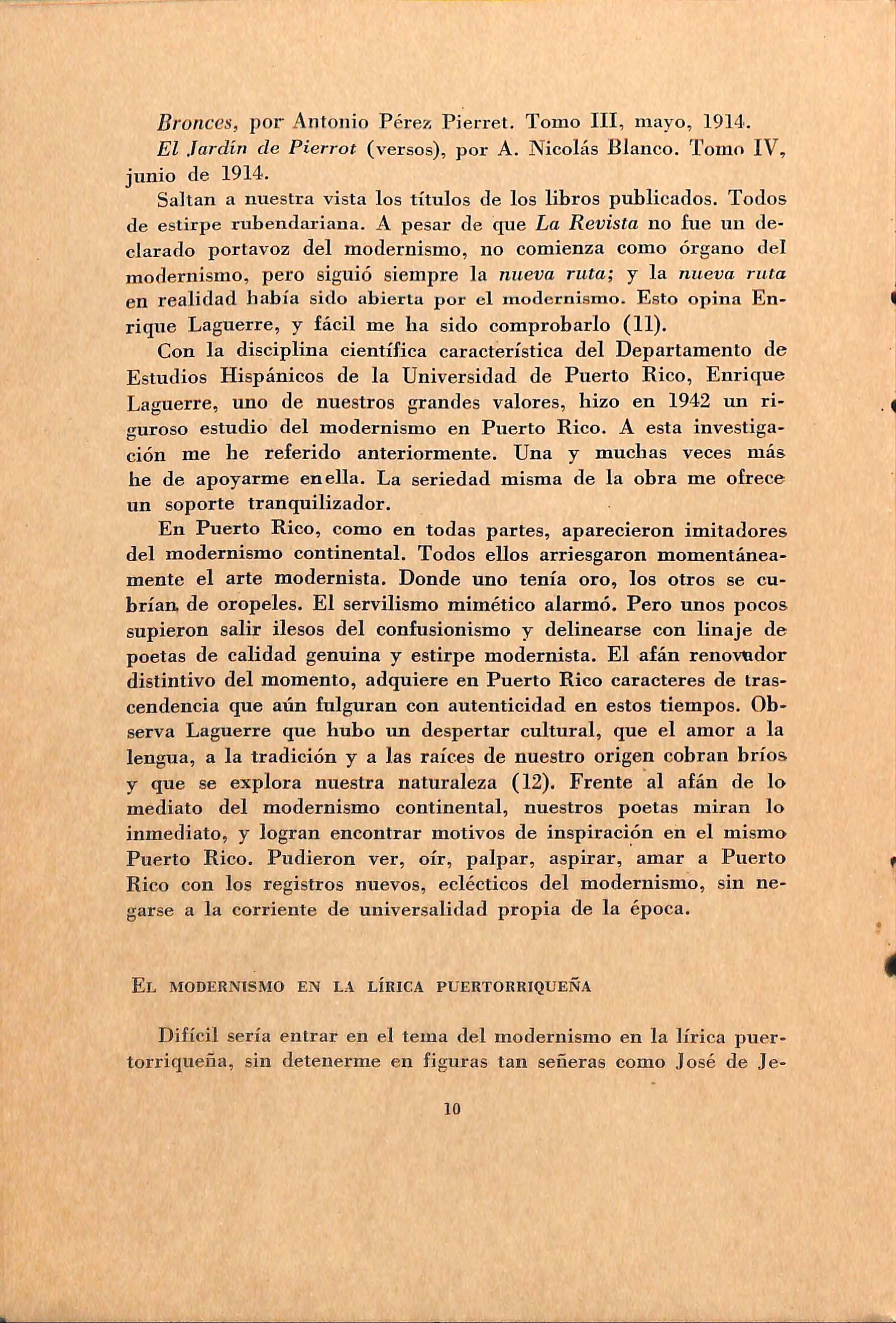 La g u e rre, uno d e nue stro s grande s valor es, hizo en 1942 un riguro so estudio del moderni smo en Puerto Rico. A e sta inve s ti gación me he referido anteriormente. Una y muchas veces má s he de apoyarme enella. La seriedad mi sma de la obra me ofr e c e un soporte tranquilizador.