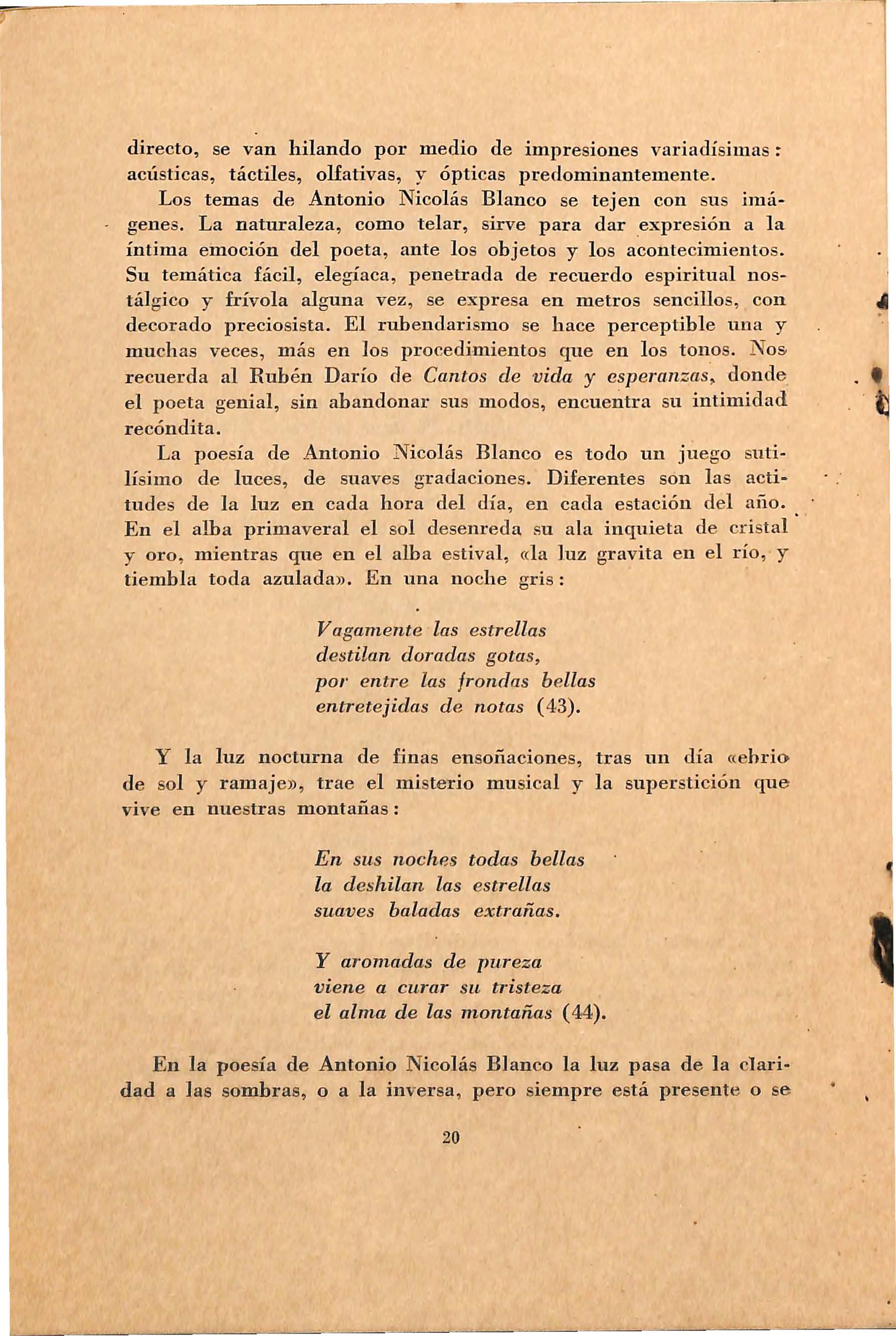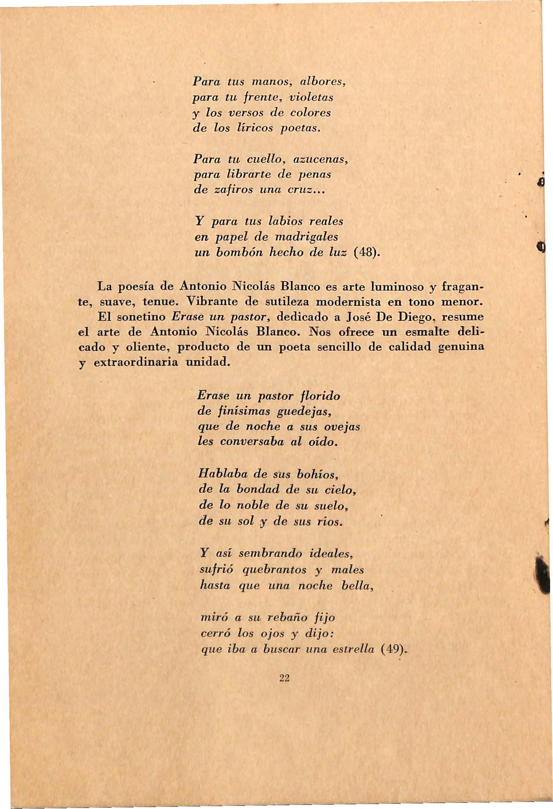 Antonio Nicolás Blanco fue una presencia constante en la poesía mo d e rni s ta puertorriquefia e ntr e lo s años 1914 -1918. Nace en San Juan e l 10 de sep ti emb r e d e 1887 . Vive parte de su niñez en 'lll campo de Vega Baja, lo que lo pone en contacto con la campiiia puertorriqueña. Es dificil eh nu estro tiempo se r únicam e nte poeta y preservarse del choque de la s nece sidades diaria s . El poeta estudia comeT"i<i v poetiza. Trabaja de dependiente en lo s muelles y poetiza. Hace tertulia con Evaristo Ribera ChoP.vJ:emont , Luii; Palés Matos, Julio Soto Ramo s, y también poetiza. Impo sible vivir únicame nte para la bel1 e za. Muy j oven contrae matrimonio y la muerte interviene con su e s posa. Lo inesperado causa dolor. La juventud se impone. Veintidós años de re sidencia terrenal. Contrae d e nue vo matrimonio con doña Dáma sa Alon so , una d e esas mujeres que dan las rosas para quedar se con las espinas, como diría Rubén Darío. Antonio Nic olá s Blanco fue bueno, de s prendido , senc il1o y suti l. Nos lo de sc ribe Antonio Coll y Vidal en El Gran Hermano: