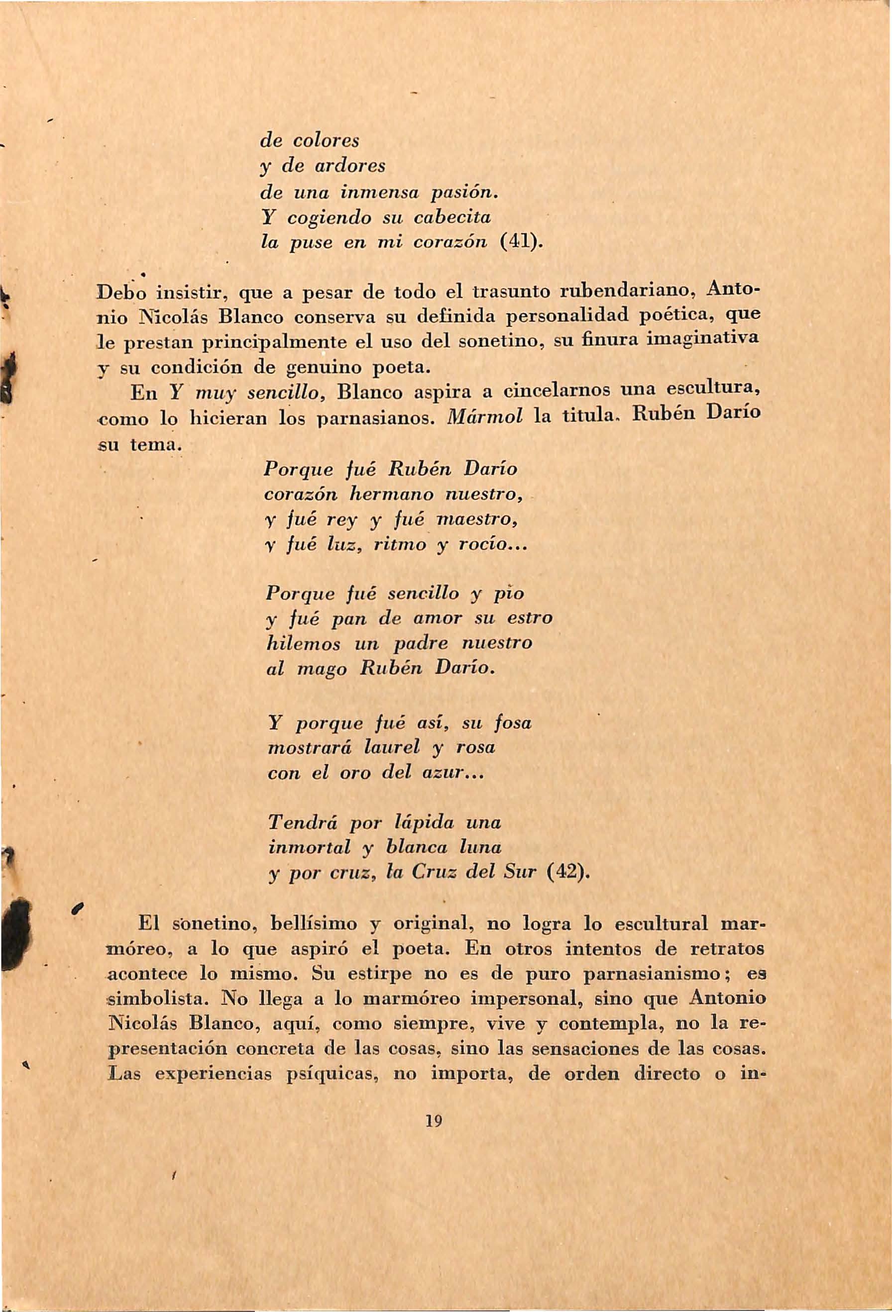 ¿Debo continuar hablando sobre ellos, que tienen ese mayorazo bien plantado, y olvidar a los hermanos menores como sometiéndolos al rigor de una ley arcana e in sos tenible? Me parece oportuno y razonab]e que recu e rde a otro s poet as, tambi é n moderni s tas , a unque de no tan abundante vendimia . E se es el caso de Antonio N icolá s Blanco y Antonio P ére z Pierret . A ellos dedicaré el tiemp o que me resta.