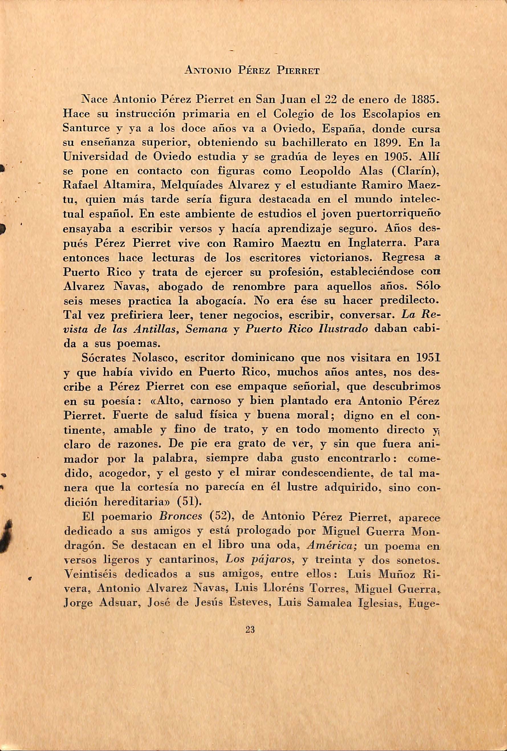 Nace A ntonio P é r e z P ie rr e t e n S a n Juan e l 22 de e n er o d e 1885. Ha ce su in stru cc ión primaria en el Cole gio de los E s colapios e n Santur ce y ya a lo s do ce año s va a O viedo , España , donde cur s a su e n se ñanza superior , obt e ni e ndo su ba chille rato en 1899. En la U nive r sid a d de Oviedo e studia y se gradú a de le y es e n 1905. Alli s e pone en c ontacto con fi guras como Leopoldo Ala s (Clarín) , Rafael Altamir a, M e lquíade s Alvar e z y el e studiante Ramiro Maeztu , quien m ás tarde sería fi gura de stacada en el mundo inte ]ectual es pañol. En e ste ambiente de e studios el joven puertorriqueño en s a y aba a e scribir verso s y hacía aprendizaje se guro Años despu é s Pérez Pierret vive con Ramiro Maeztu en Inglaterra. P a ra entonce s hace lectura s de los escritores victorianos. Regre s a a Puerto Rico y trata de ejercer su profesión, estableciéndose con Alvarez Navas, ahogado de renombre para aquellos años. Sólo seis meses practica la abogacía. No era ése su hacer predilecto. Tal vez prefiriera leer, tener nego cios, escribir , conversar. La R evista de las Antillas, Semana y Puerto Rico Ilustrado daban cabida a sus poemas