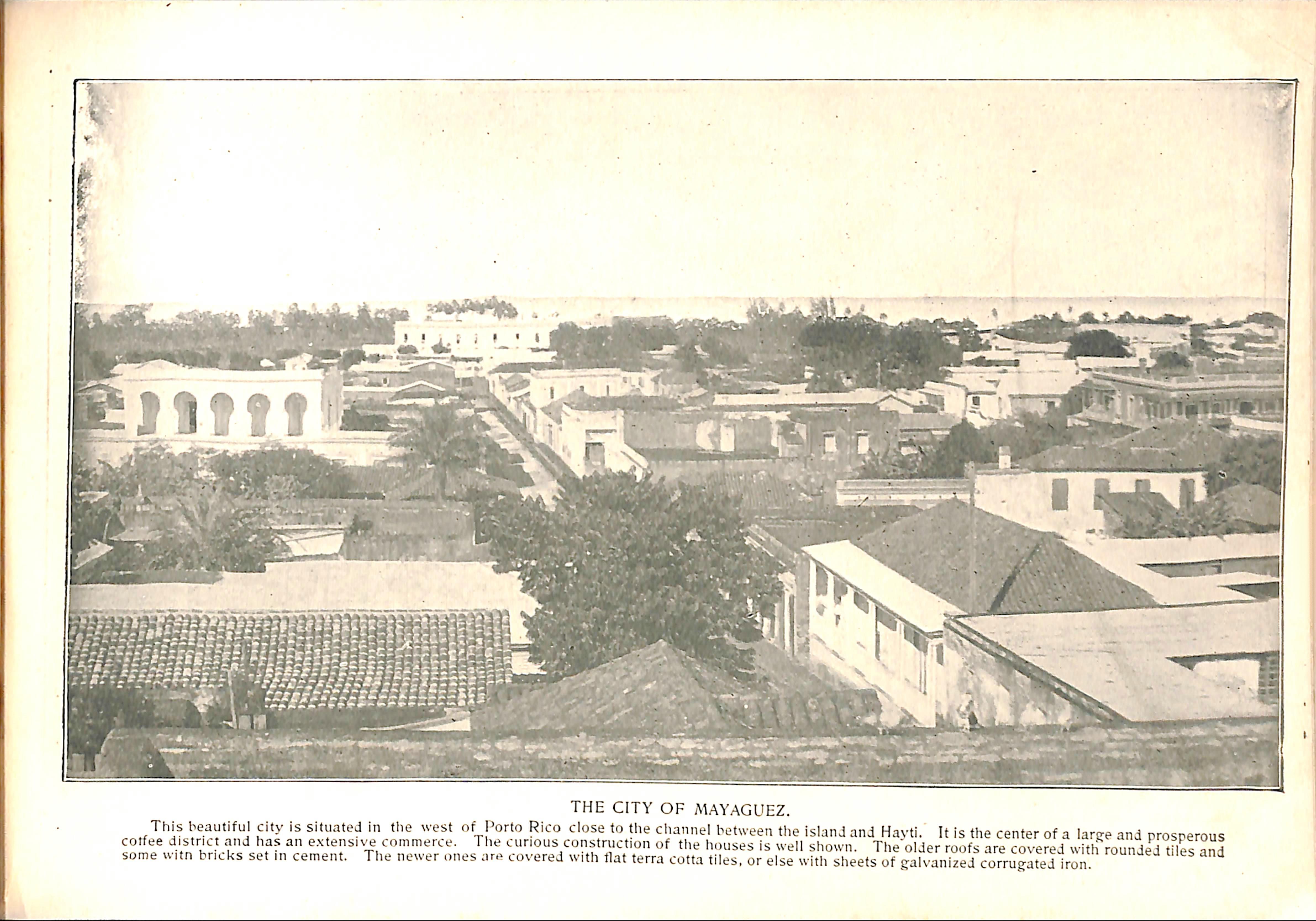 This heautiful city is situated in the west of Porto Rico cióse to the channel between tlie islanJ and Havti. It Is the center of a lartre and rrosperous colfee district and has an extensiva commerce. The cunous construction of the houses is well shown, The'older roofs are covered with rounded tilefand sowe »-,tn hricks set in cement. The newer ones are covered with tlat térra cotta tiles, or else with sheets of ^alvanized corrugated iroi^^ rounded tiles and