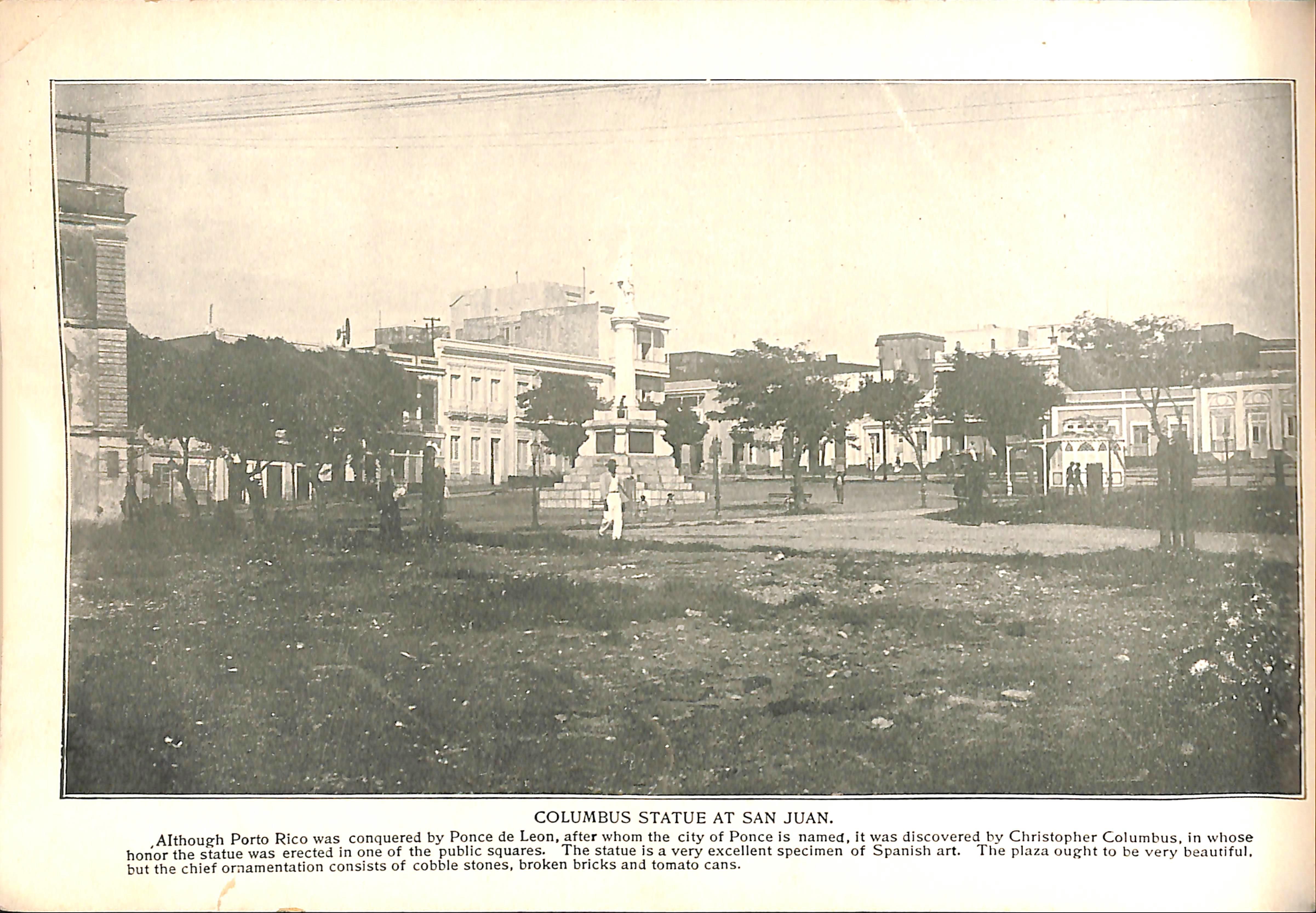 Althouffh Porto Rico was conquered by Ponce de León, after whom the city of Ponce is named, It was discovered by Christopher Columbus, in whose honor the statue was erected in one of the public squares. The statue ís a very excellent specimen of Spanish art. The plaza ought to be very beautiful. but the chief ornamentation consists of cobble stones, broken bricks and tomato cans.