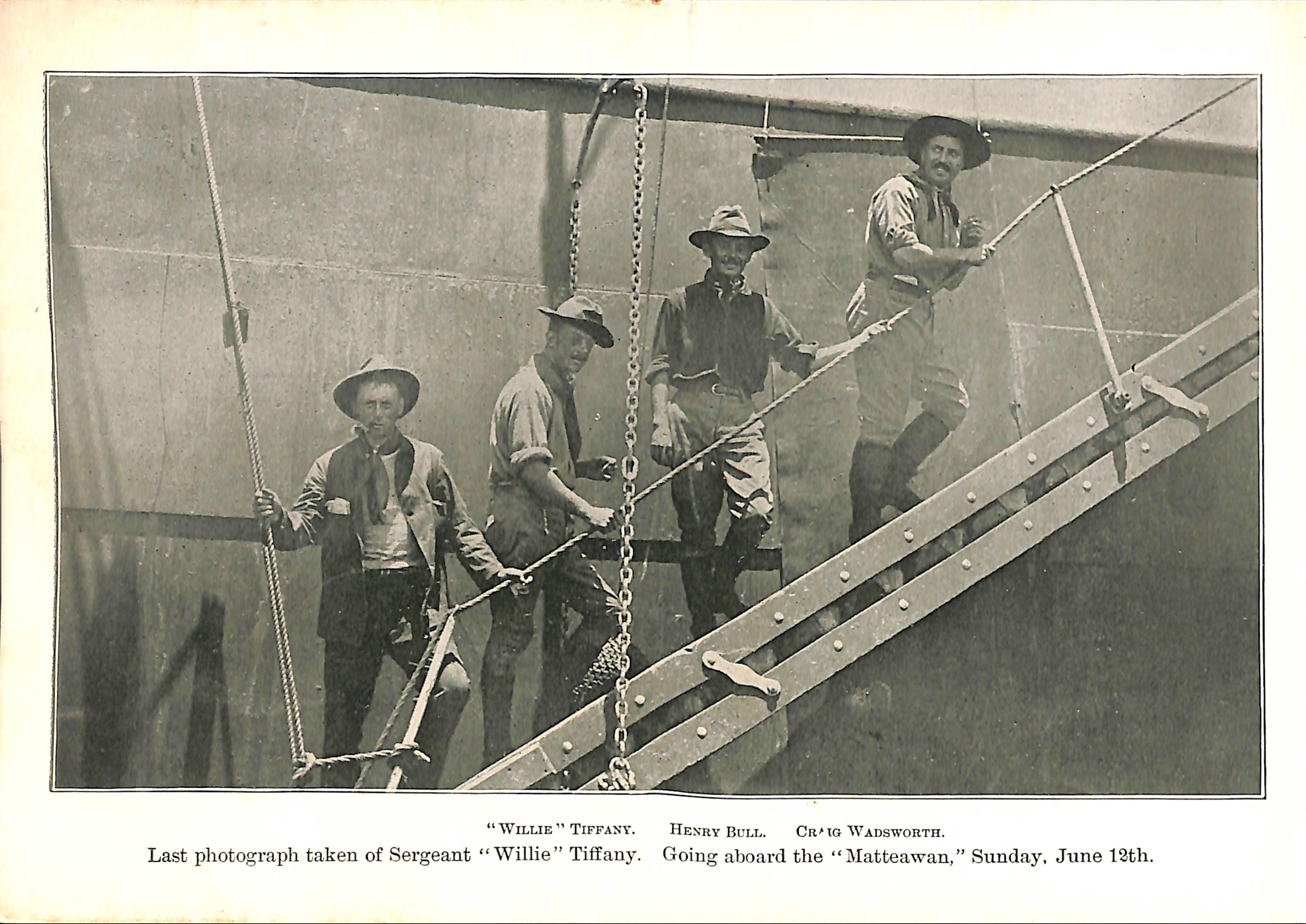 Last photograph taken of Sergeant "WlLLIE"Tiffany. Henry Büll. Cr'tq Wadsworth. 'Willie" Tiffany. Going aboard the "Matteawan," Sunday, June 13th.