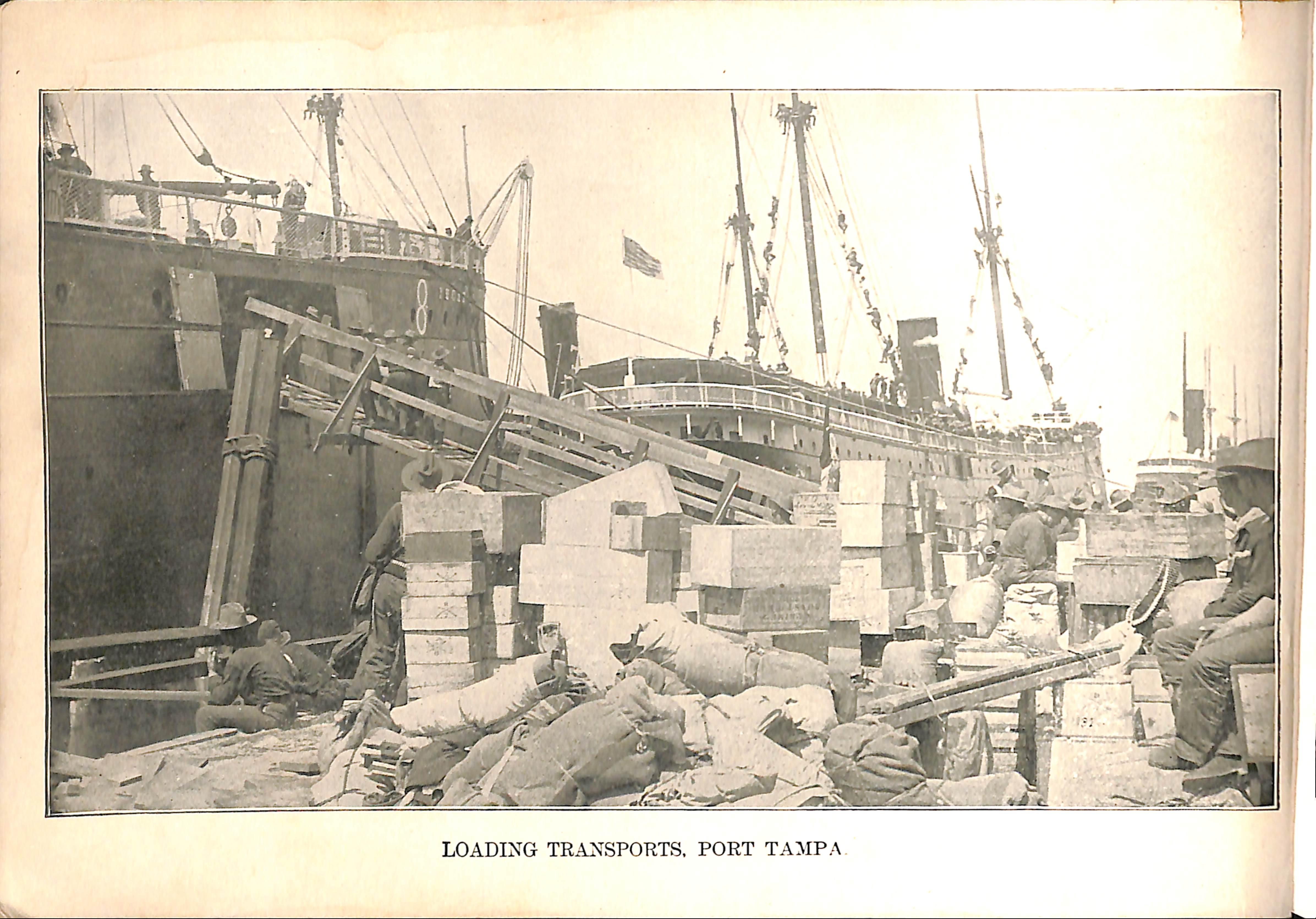 Second Massaclmsetts Regiment going aboard transports at Tampa. Numbers eighteen aud seven show how transports are distiuguished.