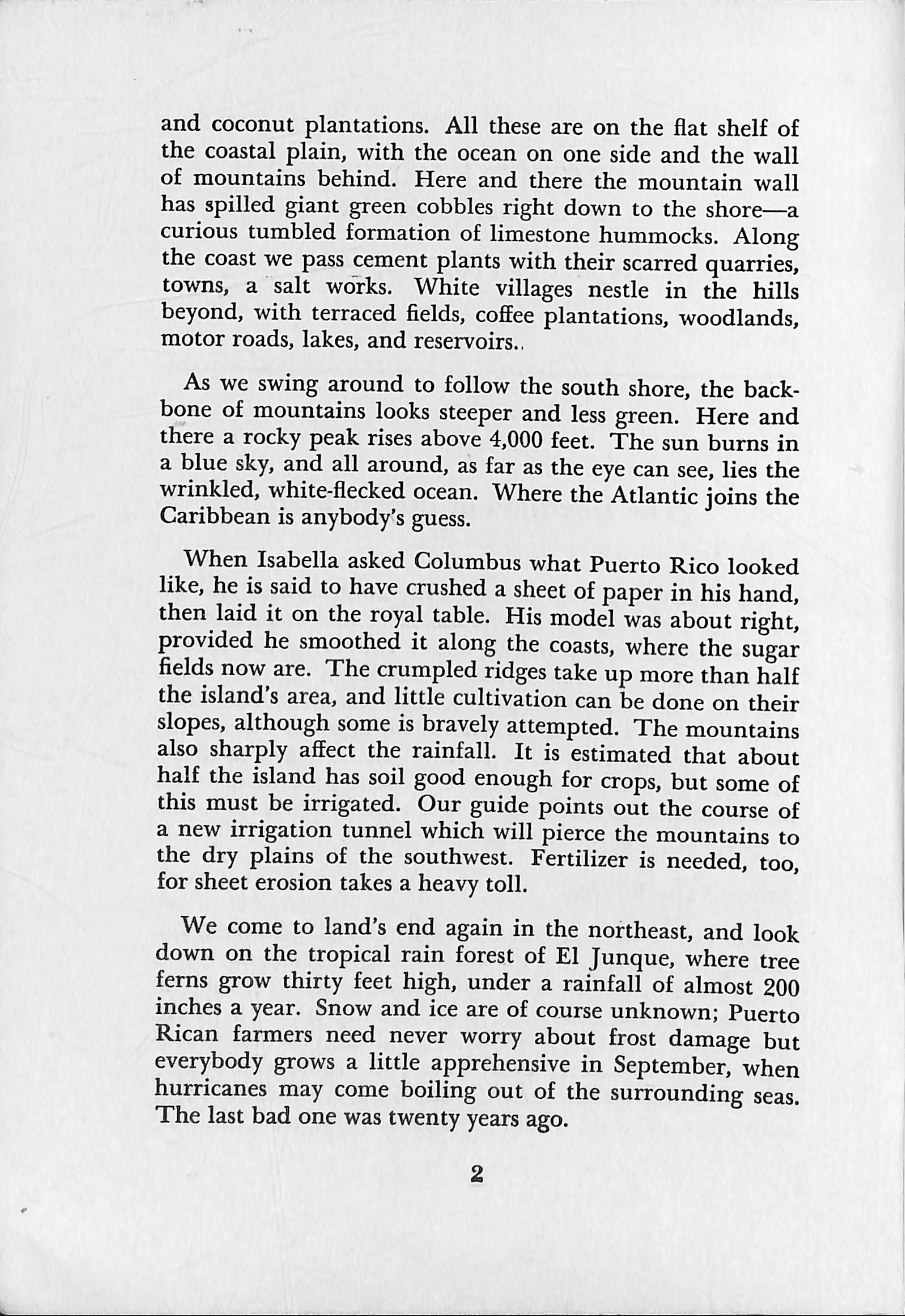 When Isabella asked Columbus what Puerto Rico looked like, he is said to have crushed a sheet of paper in his hand, then laid it on the royal table. His model was about right^ provided he smoothed it along the coasts, where the sugar fields now are. The crumpled ridges take up more than half the island's area, and little cultivation can be done on their slopes, although some is bravely attempted. The mountains also sharply affect the rainfall. It is estimated that about half the island has soil good enough for crops, but some of this must be irrigated. Our guide points out the course of a new irrigation tunnel which will pierce the mountains to the dry plains of the southwest. Fertilizer is needed, too, for sheet erosión takes a heavy toll.