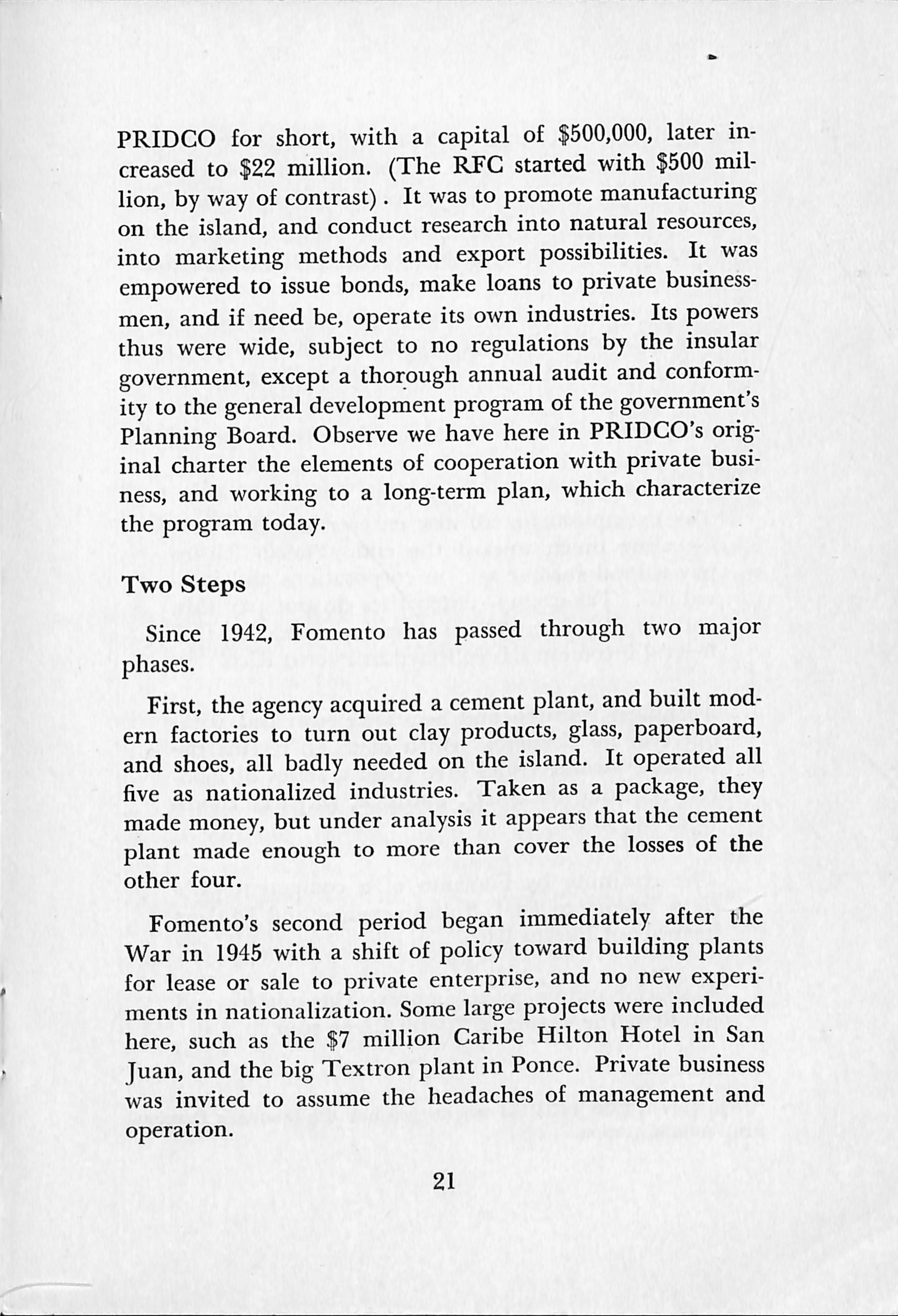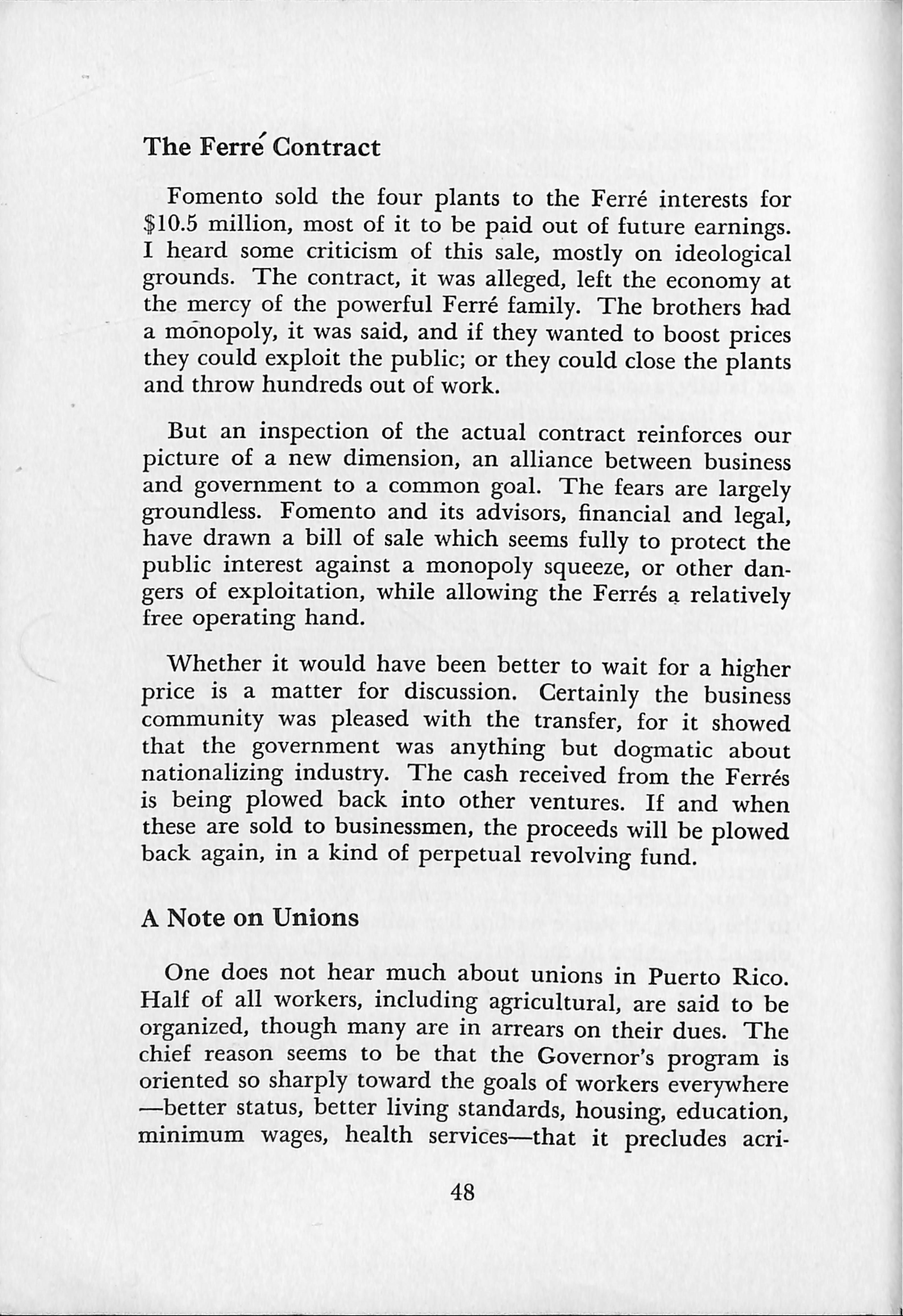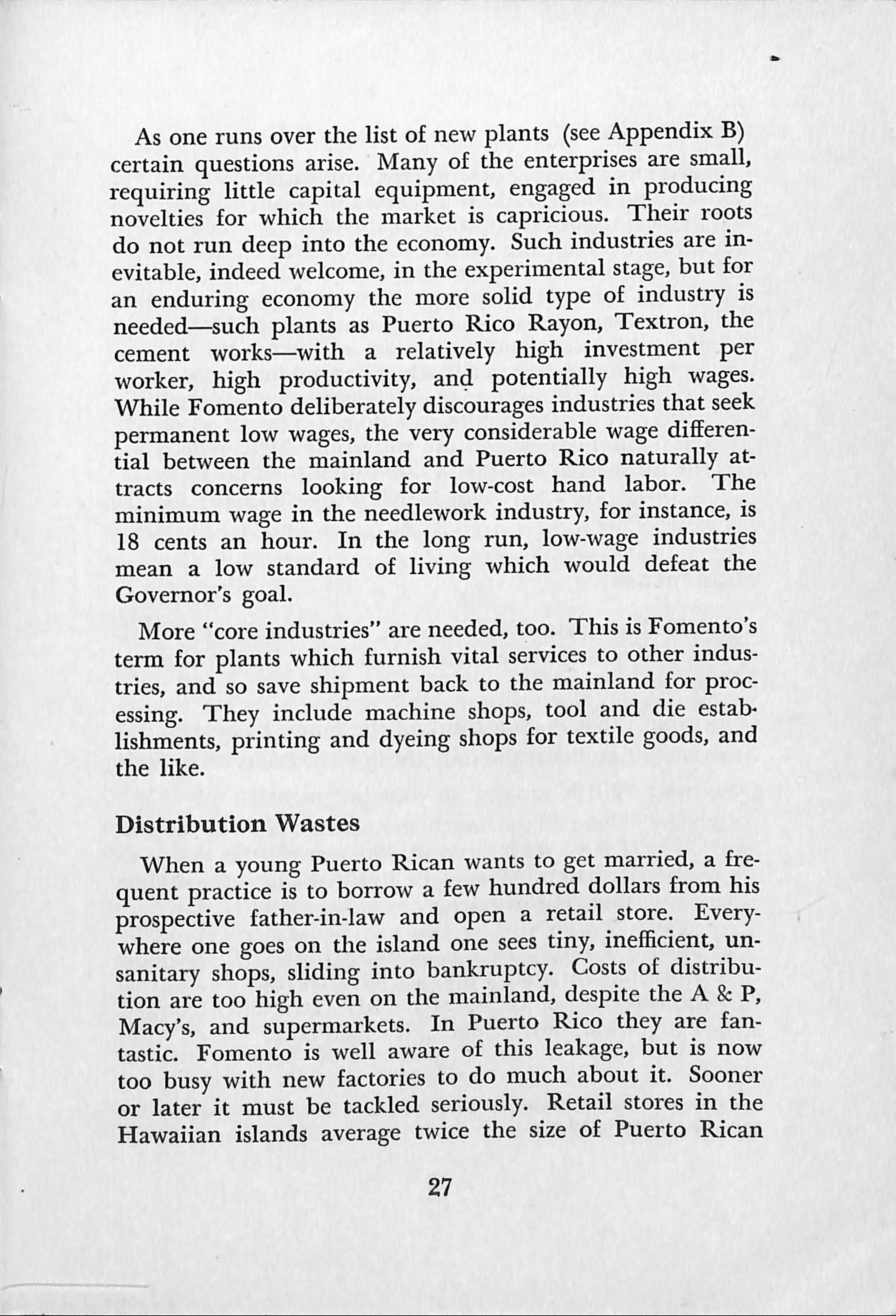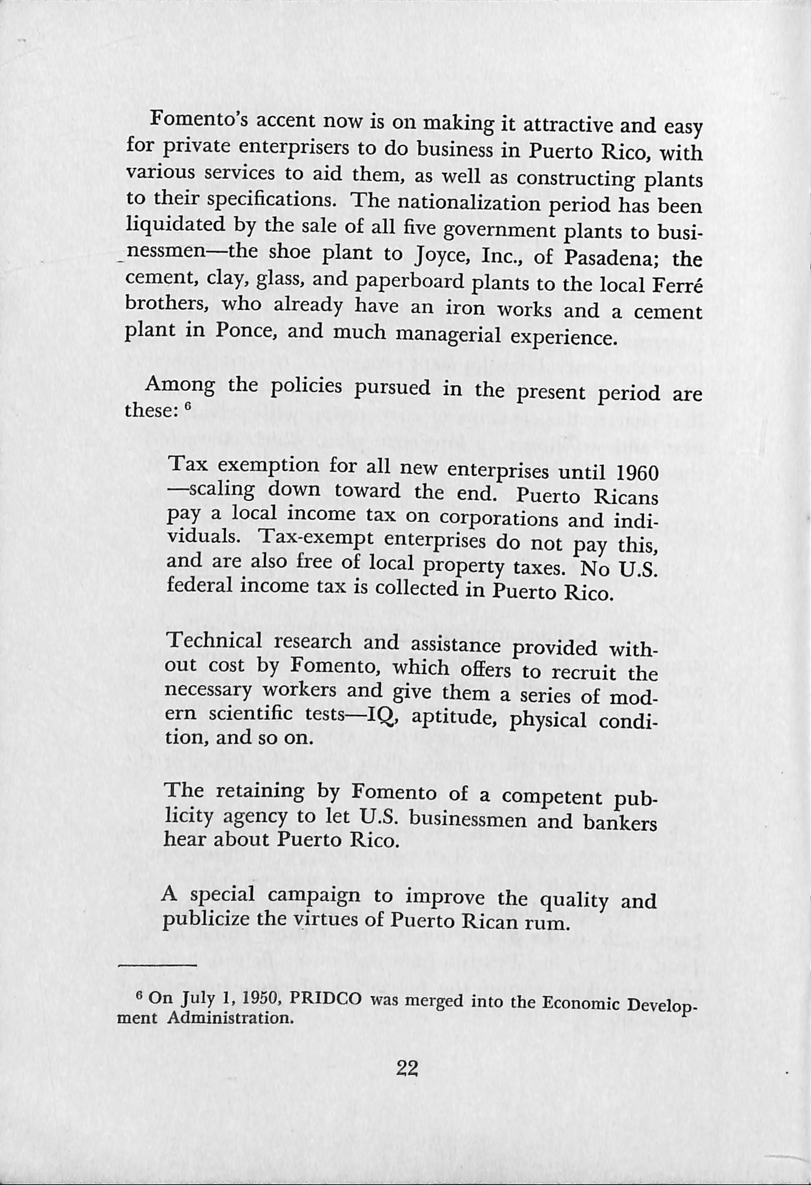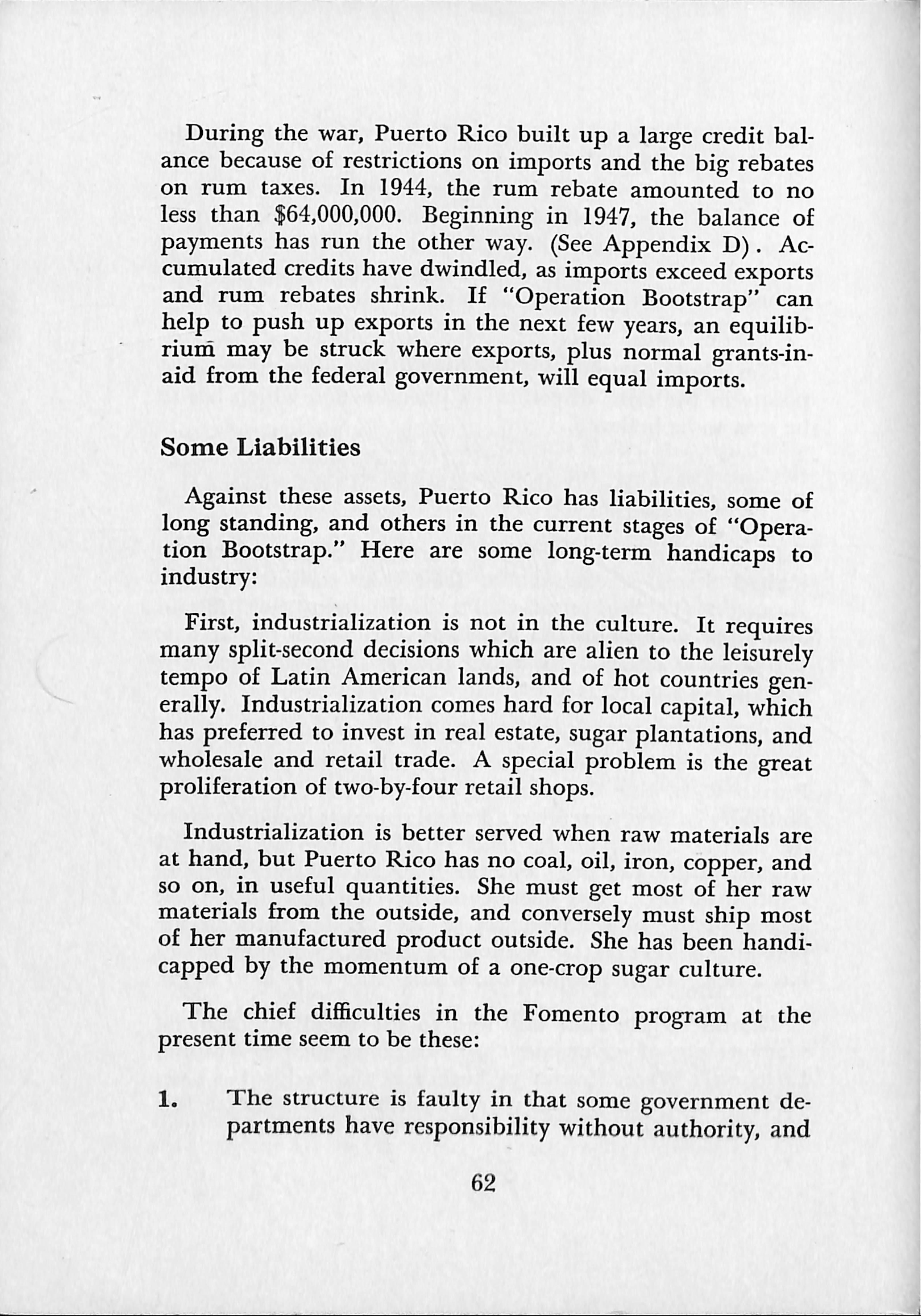 In the pages to follow we shall describe briefly Governor Muñoz's "Operation Bootstrap"—how it began, what it has accomplished to date, and its prospects for ultimate success. Finally, we will speculate upon the lessons for other lowincome societies, and for high-income societies too. For Puerto Rico now operates at least three pilot plants, as well as Point Four training, which any modem industrial community might study to advantage: