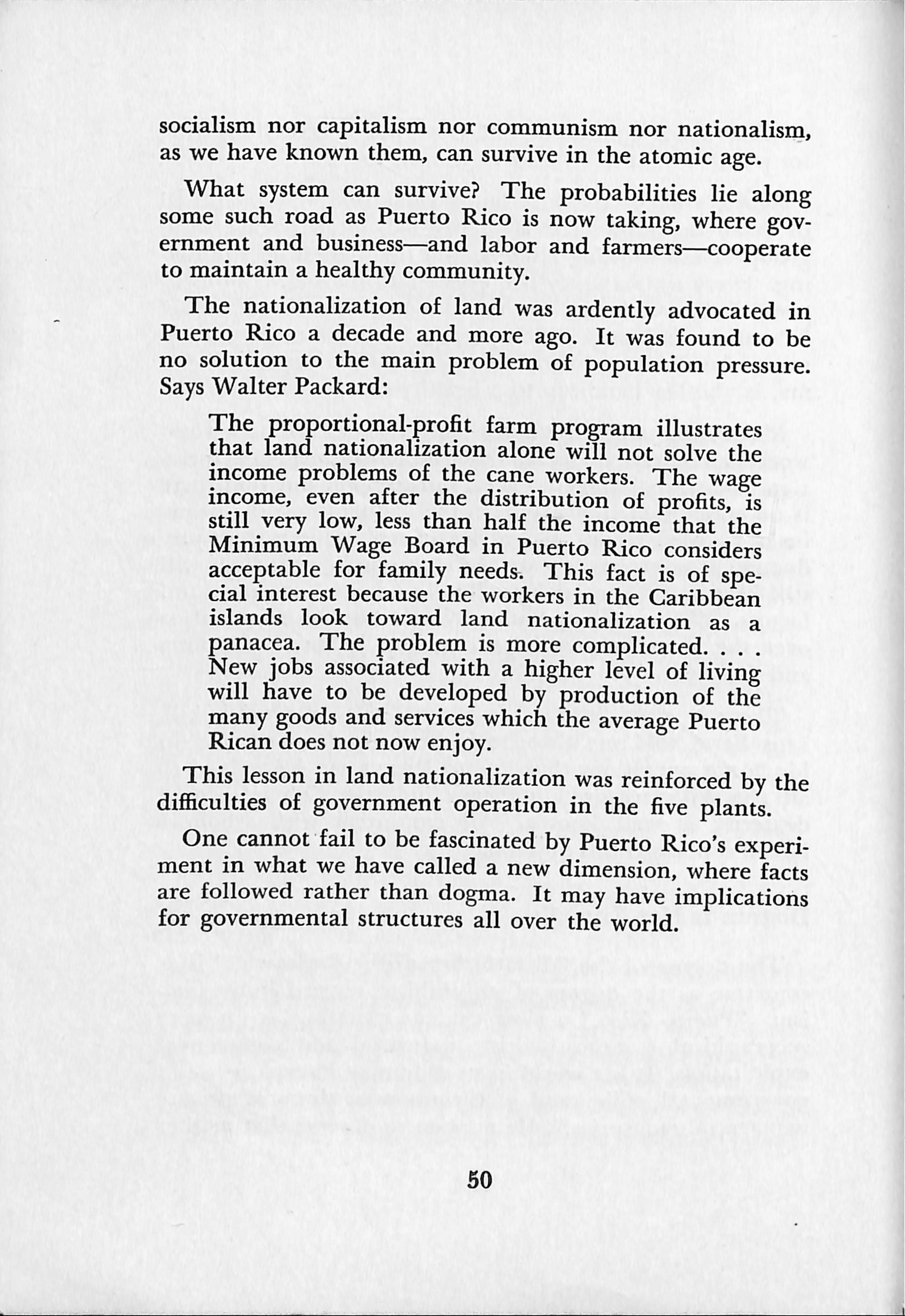 For the dilemma o£ Puerto Rico is the world's dilemma. If it can be resolved in this land of severely limited natural resources, one is tempted to say that it can be resolved anywhere—in Ceylon, Java, India, China, the Congo. I£ Puerto Rico can find an answer which, with due modification, can be applied to other lotv-income societies, it will have made a major contribution to one o£ the £undamental problems in the world today—the relation o£ £ood supply to population.