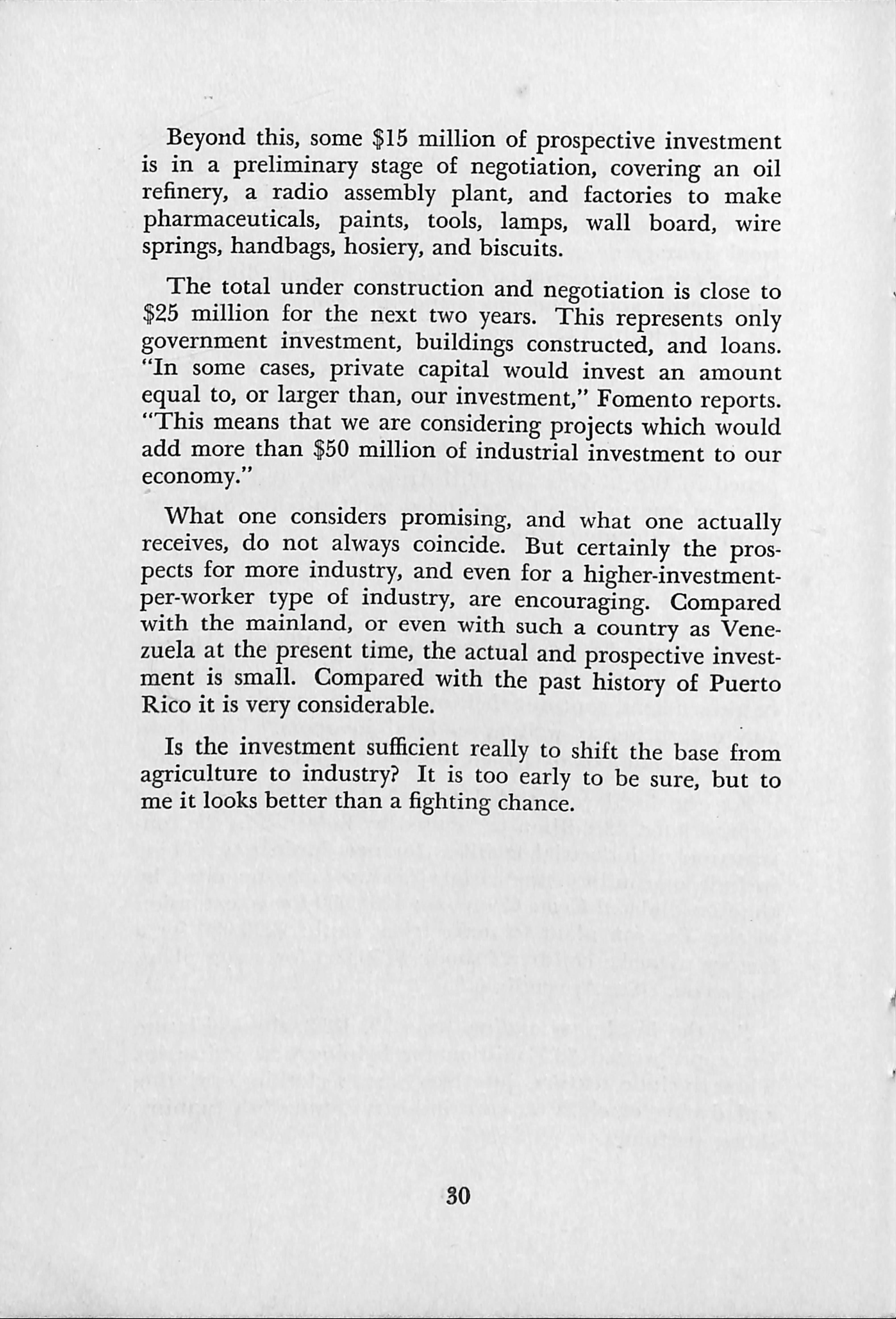 And so the £arm people, many o£ them, must come down £rom the hills, and £rom the sugar fields. They must go into £actories, and into the occupations which serve industry. I£ Puerto Rico is to avoid the doom o£ Malthus, it must.do what the United States, Britain, Western Europe, have done, and reduce the proportion o£ £armers in the total o£ gain£ully employed to 30 percent or less. (In the United States the ratio now stands at about 16 percent.) This means mechanization, technology, inanimate energy £rom oil, coal, £alling water; and a large increase in capital investment. It took the West a century to make the transfer. Russia has been struggling with it £or a generation without too much success. Puerto Rico has hardly more than begun.