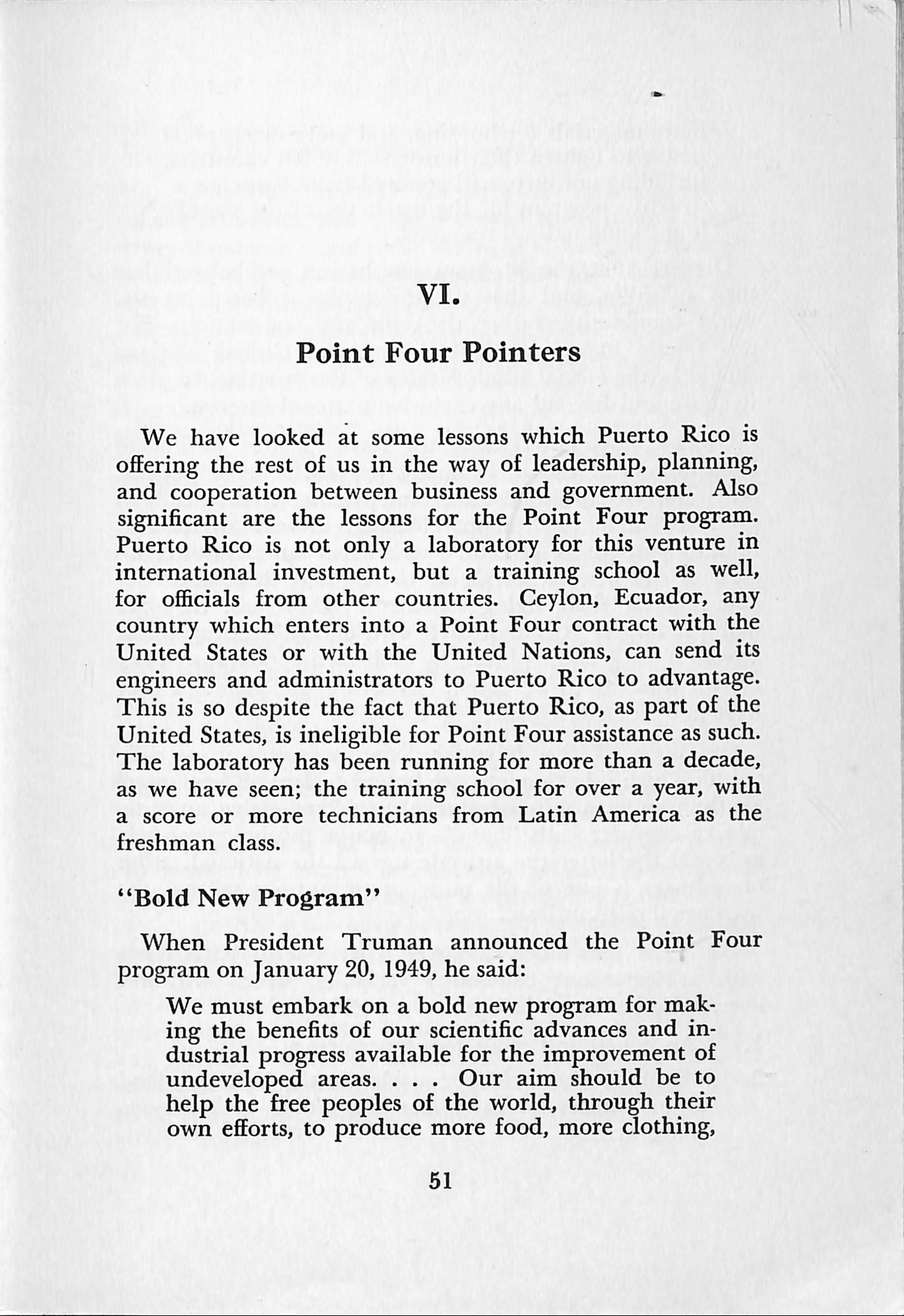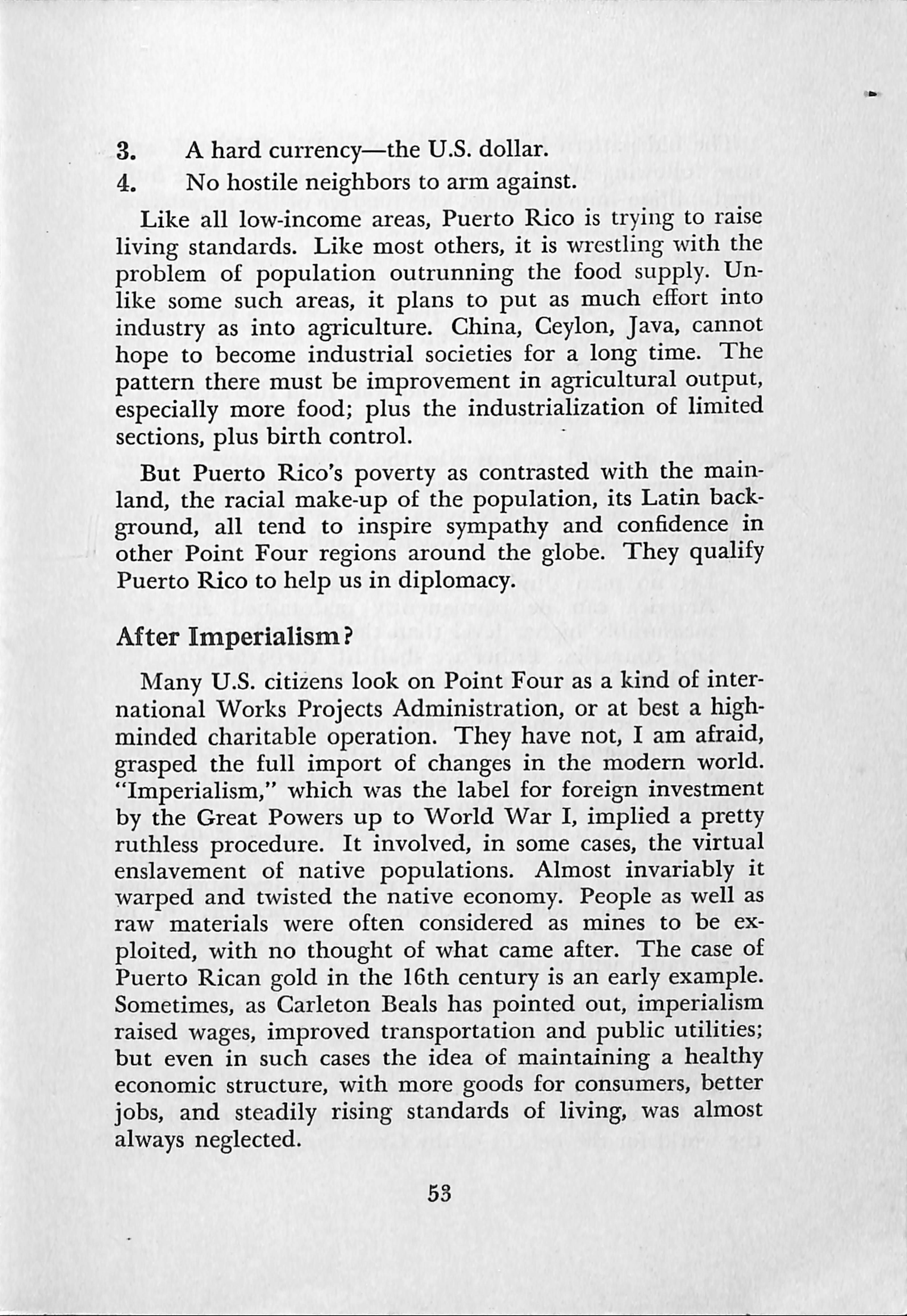 The oíd imperialism, in spite o£ the shouts £rom Moscow, is gone £orever. What will replace it £or the necessary international productivity, investment, and trade? Here again. Puerto Rico may have some valuable lessons for the rest o£ US. It provides, indeed, a kind o£ pilot plant for the Point Four Program. Puerto Rico is not technically a Point Four area, because it is an integral part of the United States. It can help, and is helping, to show other nations how to proceed.