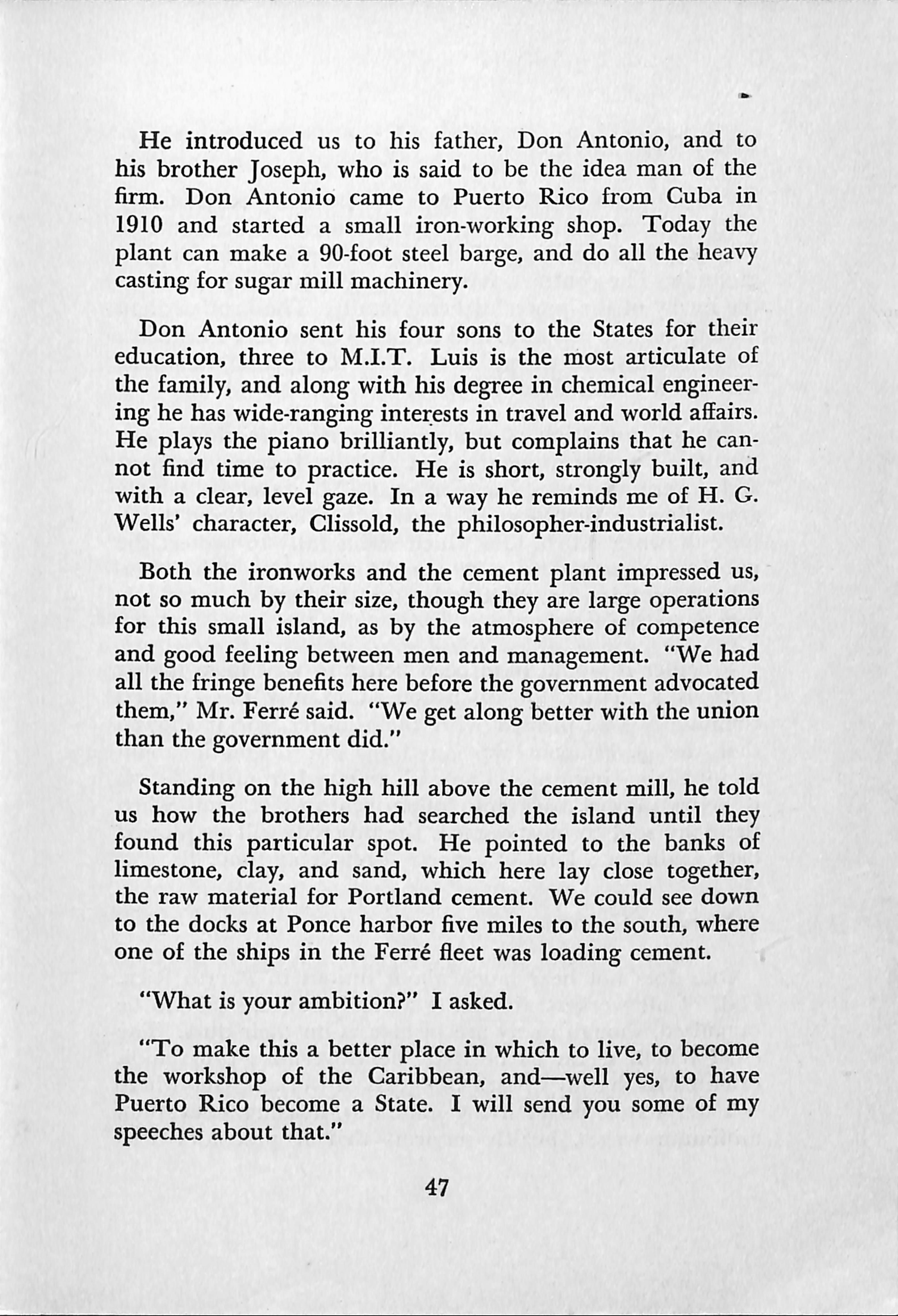 How different in Puerto Ricol Everywhere one goes, even in the high mountains, he sees new enterprise, new construction, new hope. One must constantly detour because of the new roads. Wherever he looks there is a new housing development, a new skyscraper, factory, airfield, concrete baseball park, renovated church, new hospital, school, or market. This rush of physical activity suggests a new determination, the antithesis of degradation and despair. It is not the declining slums that the visitor remembers, had as they still are, hut the new vocational school at Ponce, the new library at the University, the amazing new botéis, the Textron plant, the new hóuses which the government is huilding for the people of the slums.