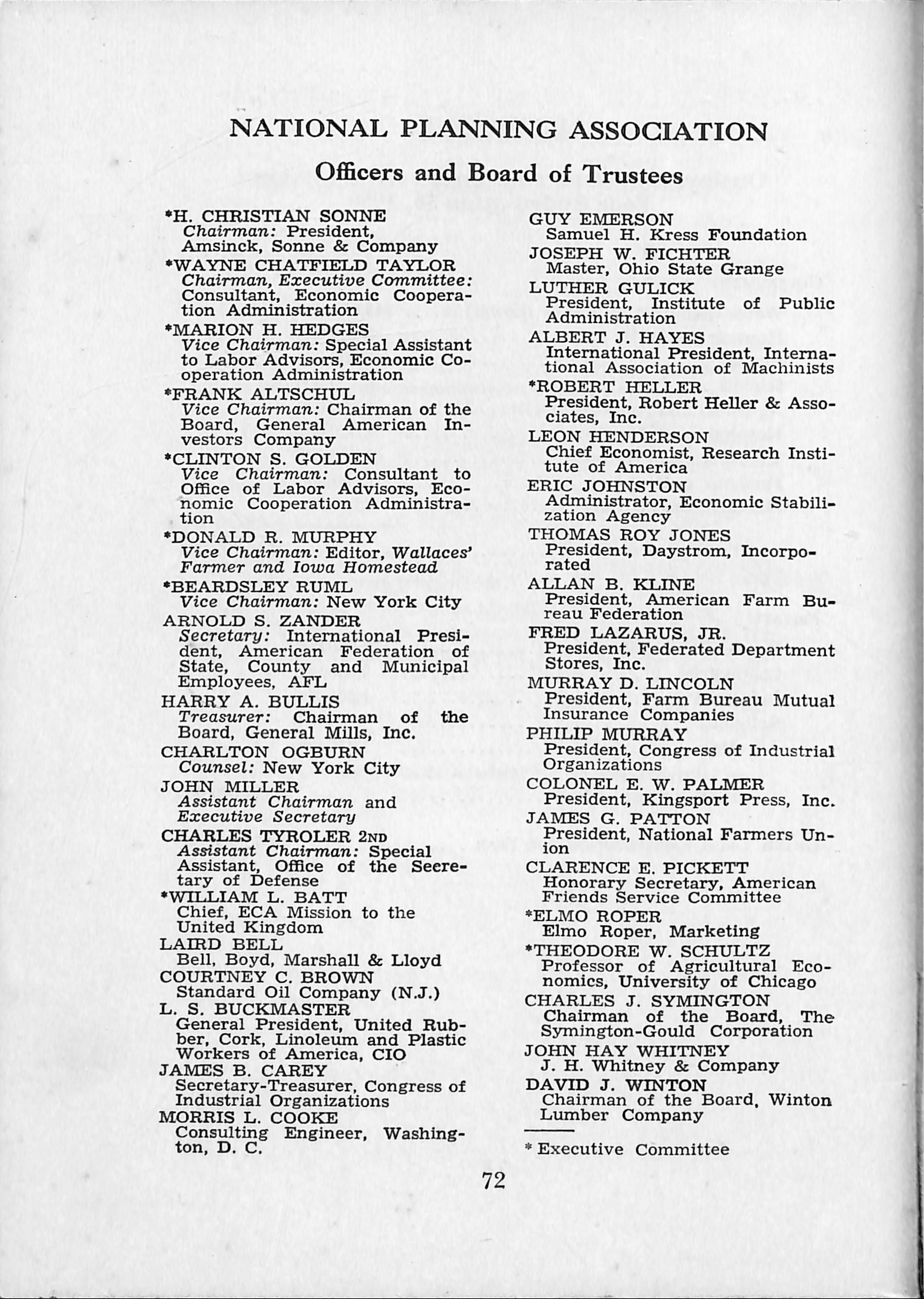 NPA is an independent, nonpolitical, nonprofit organization established in 1934. Those who particípate in the activities of NPA believe that the tendency to break up into pressure groups is ene of the most grave, disintegrating forces in our national life. America's number-one problem is that of getting agriculture, business, government, labor, and the professions to work together for common objectives: opportunity, security, rising standards of living, and respect for human rights. Oniy through joint democratic efforts can programs be devised which support and sustain each other in the national interest.