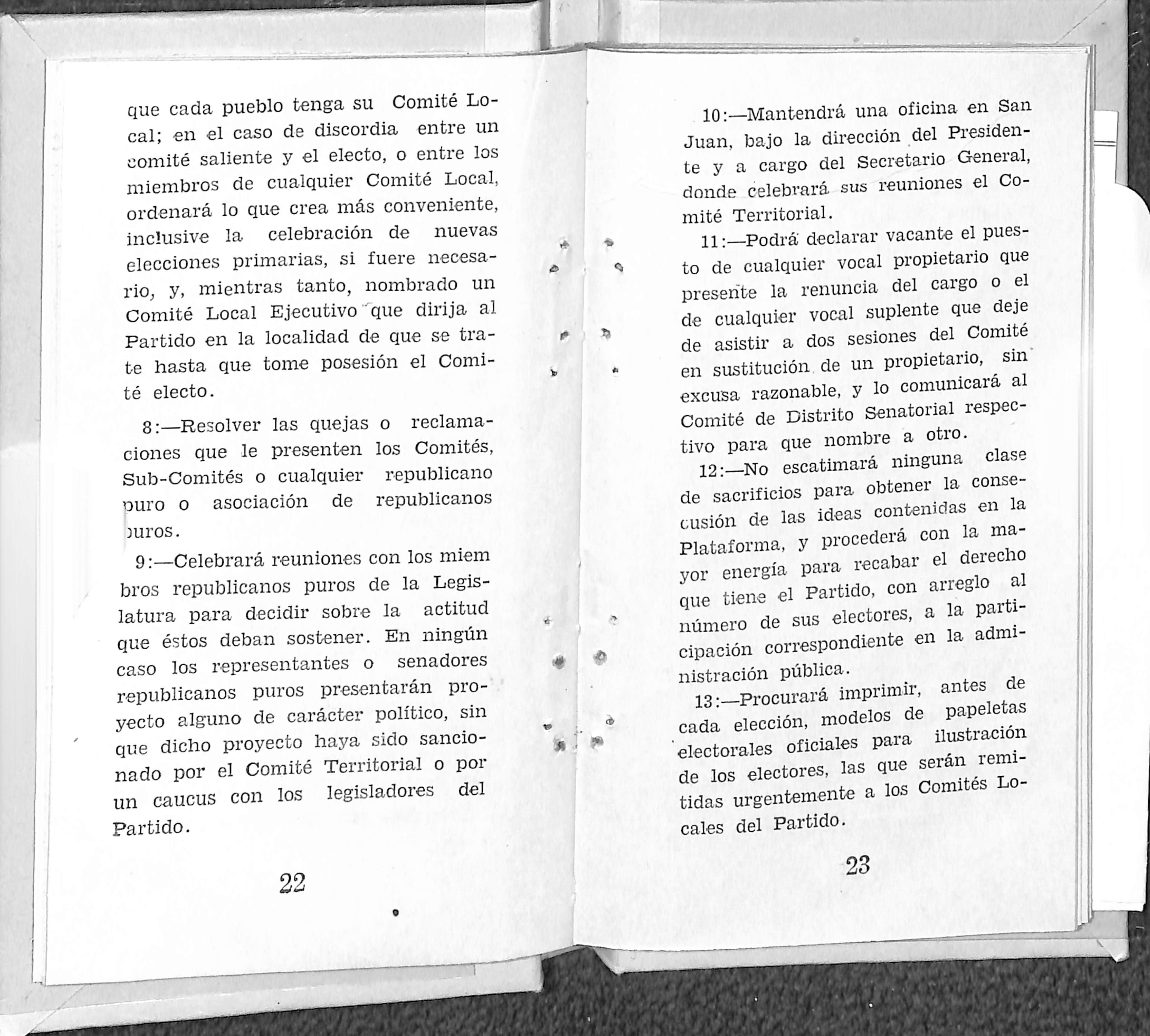 9.-—Celebrará reuniones con los miem bros republicanos puros de la Legis latura para decidir sobre la actitud que éstos deban sostener. En ningún caso los representantes o senadores republicanos puros presentarán pro yecto alguno de carácter político, sin que dicho proyecto haya sido sancio nado por el Comité Territorial o por un caucus con los legisladores del Partido.