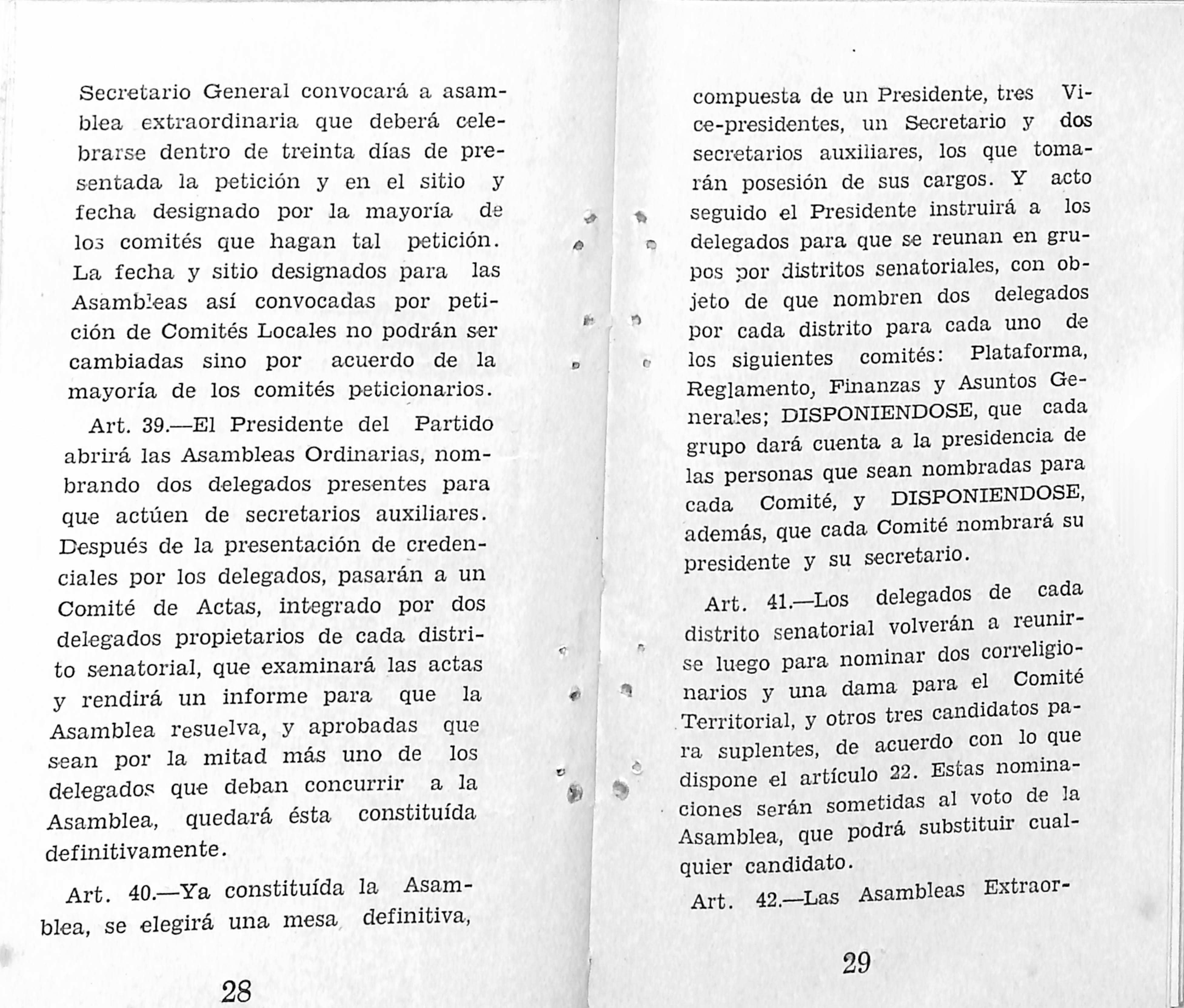 Art. 37.—Cada año de 'elecciones generales, dentro del mes de mayo, se celebrará la Asamblea Ordinaria del Partido, la cual tendrá carácter de constitucional, tratándose de todos los asuntos que se relacionen ccn el Partido, se someterá y aprobará el Programa o Plataforma del Partido, con arreglo al cual haya de librarse la campaña electoral, y en cuyo pro grama se consignarán las soluciones que el Partido proponga para resol ver los problemas del país. En dicha Asamblea Ordinaria se elegirán los candidatos para Comisionado a Washüigton. Senadores y Representantes por acumulación y para todos los car gos que hayan de votarse por los electores de la Isla en general; desig nará al Presidente del Partido, a los tres Vice-presidentes y 'al Secretario