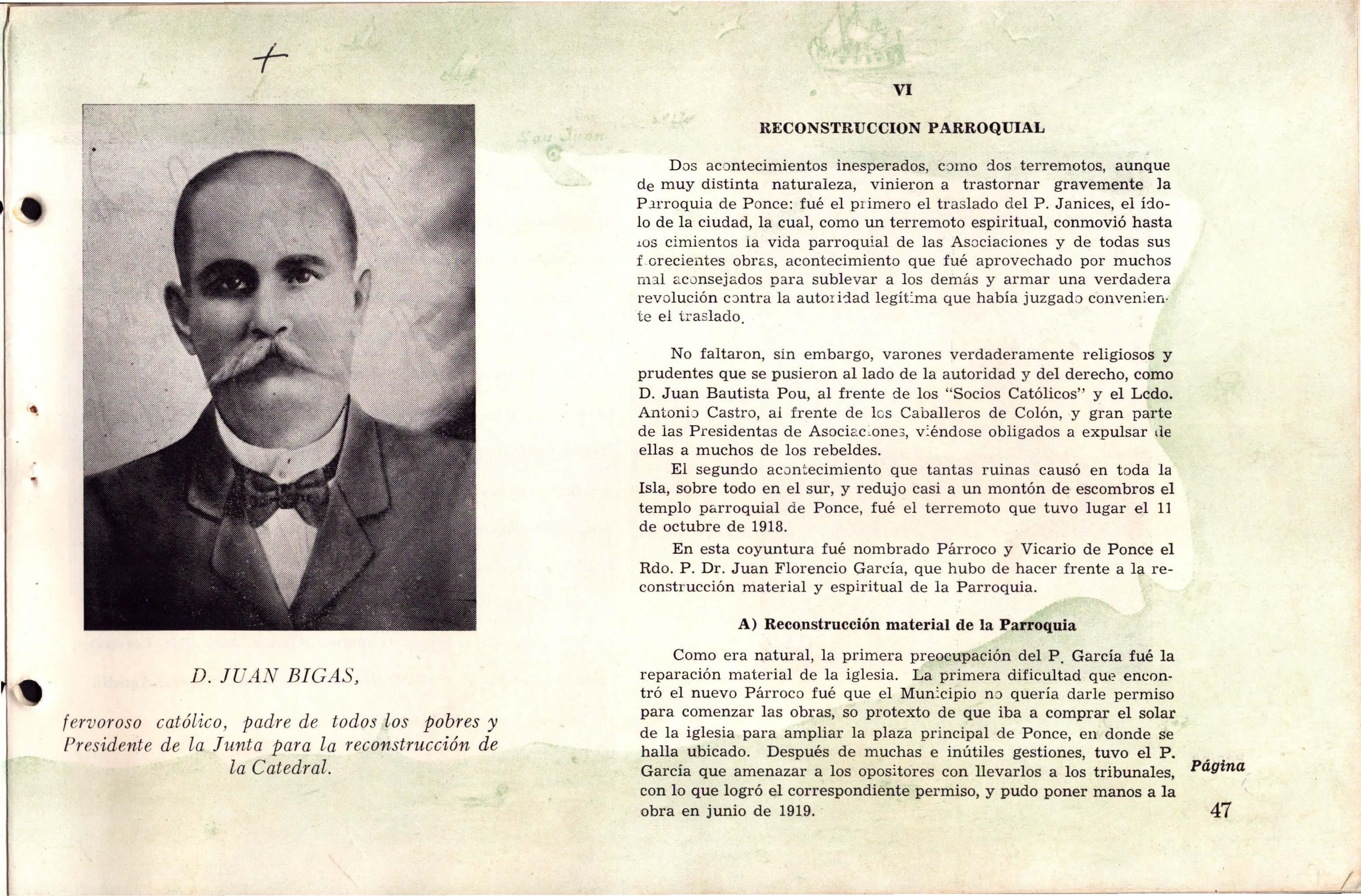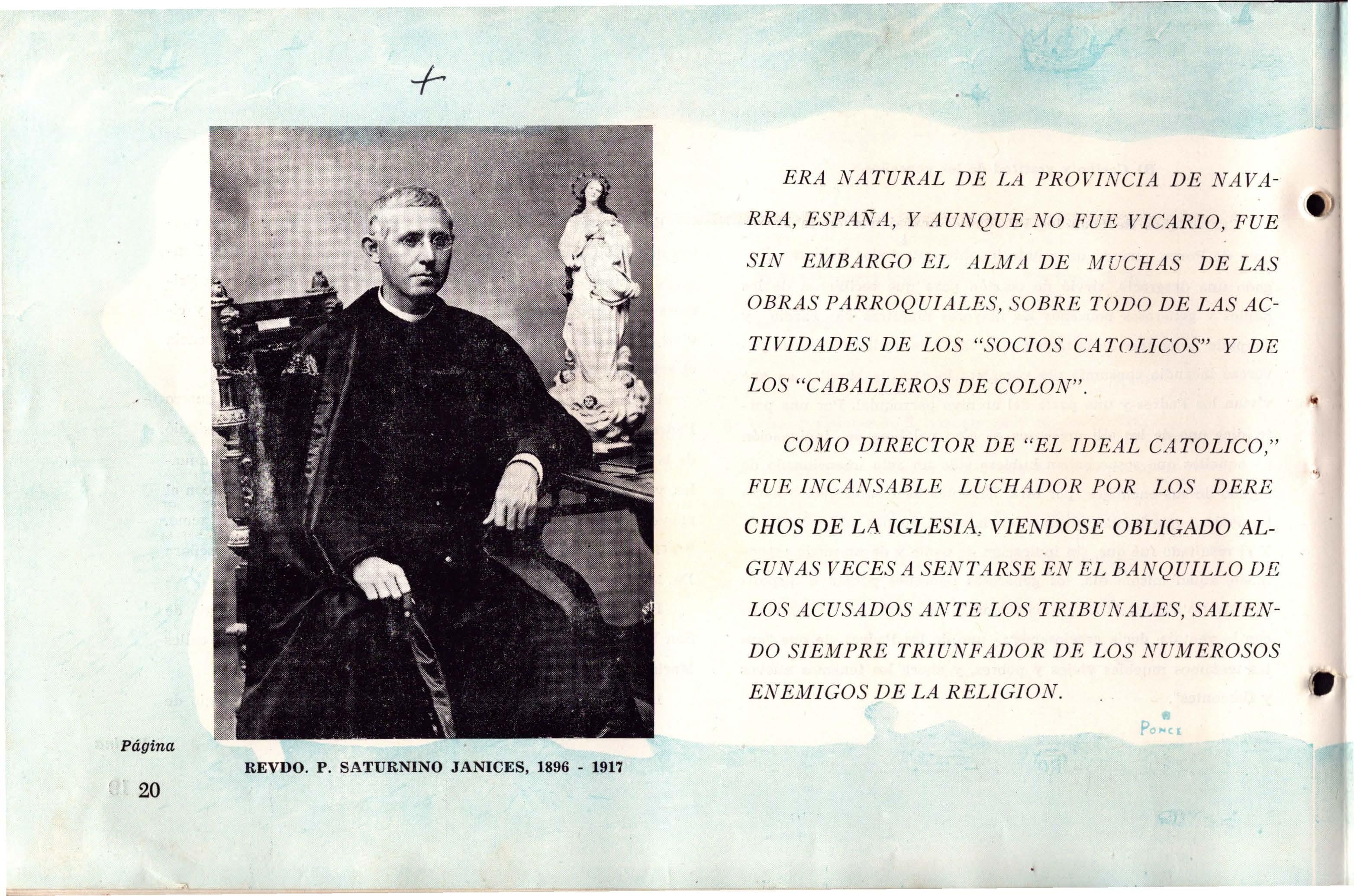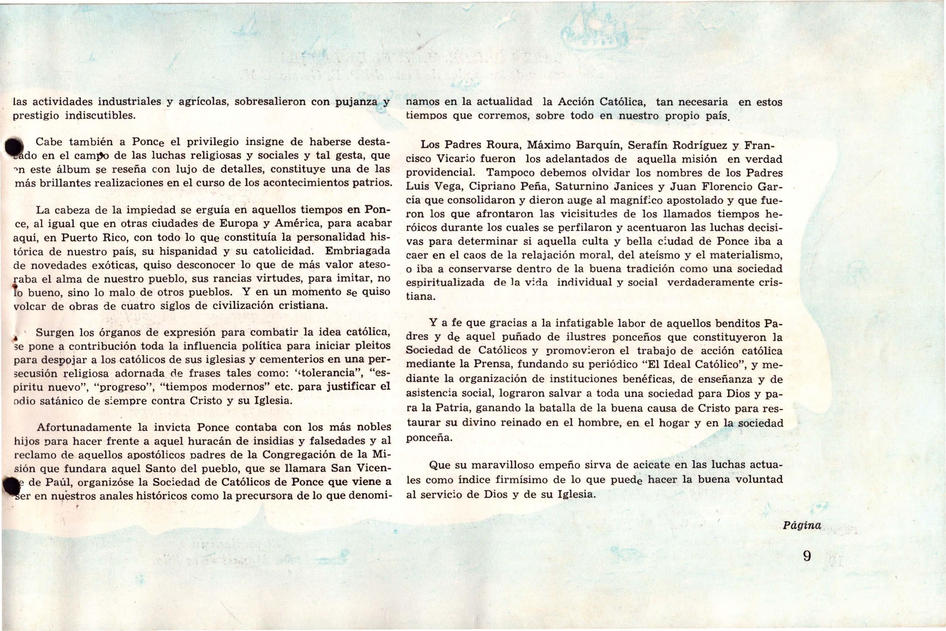 "En Ponce estuve y ví el asíduo laborar del misionero, que al monte sube; del confesor que al alma penitente oye y al enfermo visita, consuela y administra ; del regulador de conc ie ilci a s que a éstas aclara dudas, b o r ra ob s curidades y mu e stra luces; del maestro de verdad qu e la expone y la d e fiende y la practi c a ; del que , obrero de la gracia, bautiza y casa, reparte pan y vestido c o n el hambriento y con el que cubre su carne con harapos, ví la brega de un os y de otros y por ell os , p:ira gloria de D i'J s y p a ra s a n ti fic a ci ó n de las almas, llenas estaban las naves de . la Catedral Guadalupana en misas y n oven a s , y largas , incont ab les filas de alm a s , c ual p a l omas que revolotean, sucedíanse en la recepción de sacramentos de y de comunión; y los niños se agrupaban y cantaban a la Hostia Santa bajo banderas eucarístic a s, y allí estaban l as piad osas asociaciones, almas de la vida parroquial, y federad o s en asociación benéfica obrera los Socios Católicos, y dando esplendor y brillo a todo acto de religión valios os ornamentos de sedería y oro, y s::ilemnizando el culto las privilegia.das voces de bajos, baríton o s y tenores formadores de c a tarata de armonías que al Cielo suben como suspiros de almas, como plegarias de justos.