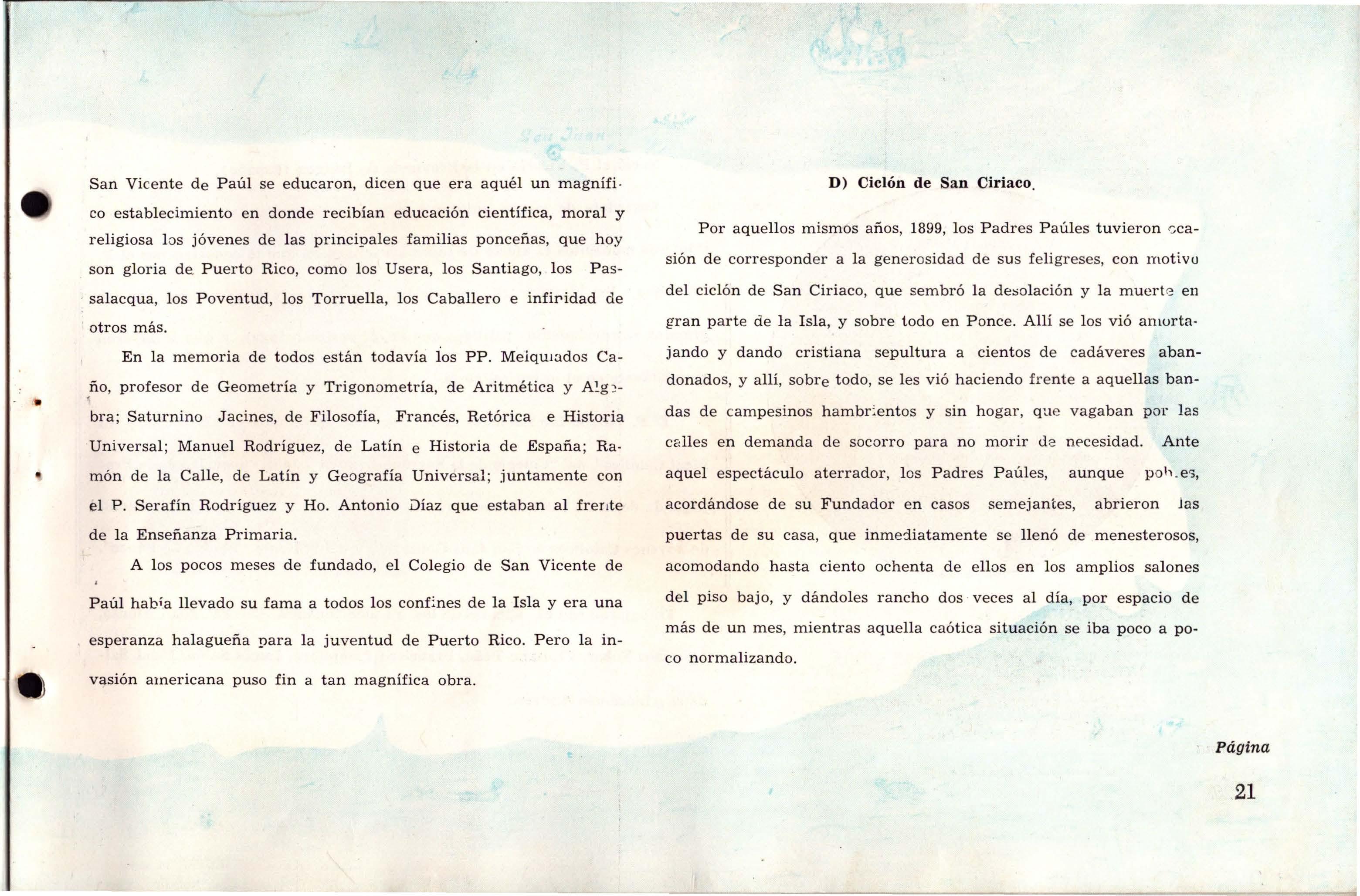 San Vicente de Paúl se educaron, dicen que era aquél un magnífico establecimiento en donde recibían educación científica, moral y religiosa l os jóvenes de las principales familias ponceñas, que hoy son gloria de. Puerto Rico, como los Usera , los Santiago, los Pa ssalacqua, los Poventud, los Torruella, los Caballero e infiPidad de otros más.