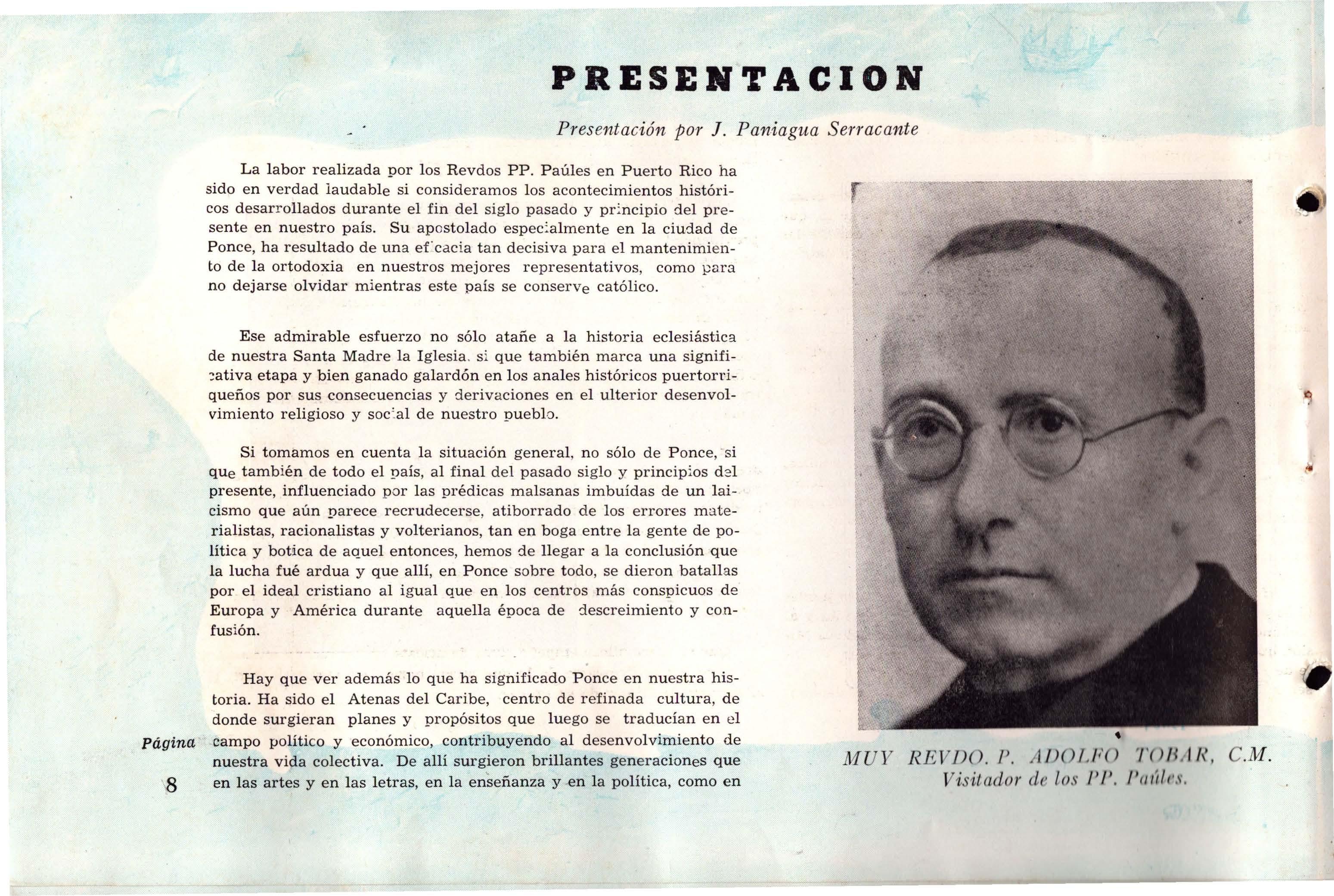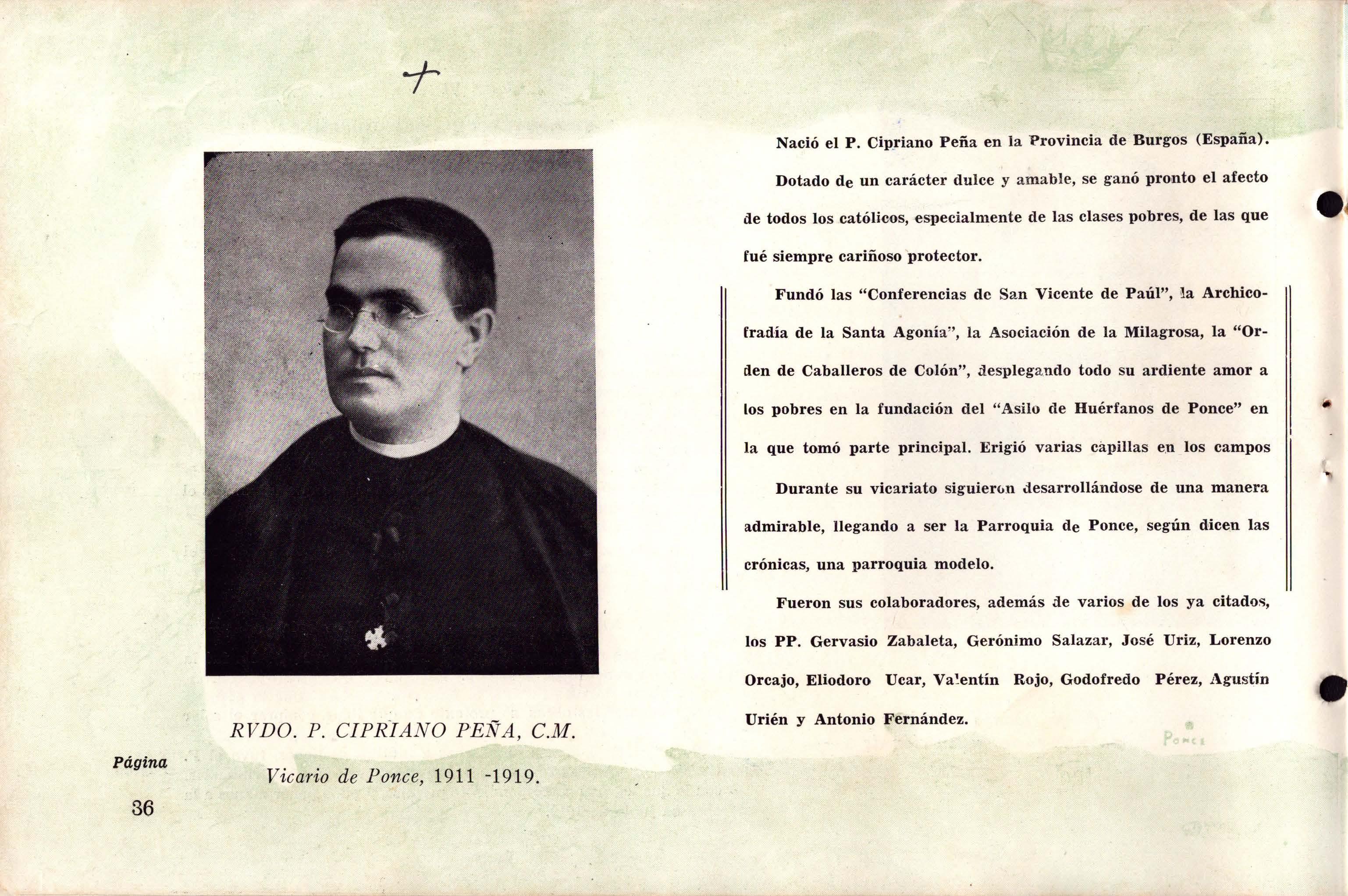 Esta fué la razón que movió a Ilmo. Sr . Obi s po de Puert o Rico, Mons. Puig , a pedir al Provincial de los P a dres Paúles , R. P. Arnáiz, le enviara Padres de su Comunidad pa ra la Parroquia de Ponce.· Y, aunque el Sr. Ob ispo vari a s negativas d e dicho P. Provincial , tanto insistió, que al fin vinieron a un acuerdo , viendo el Pr ovi nci al en la voluntad decid i da del Prelado la expr e sa voluntad de Di os.