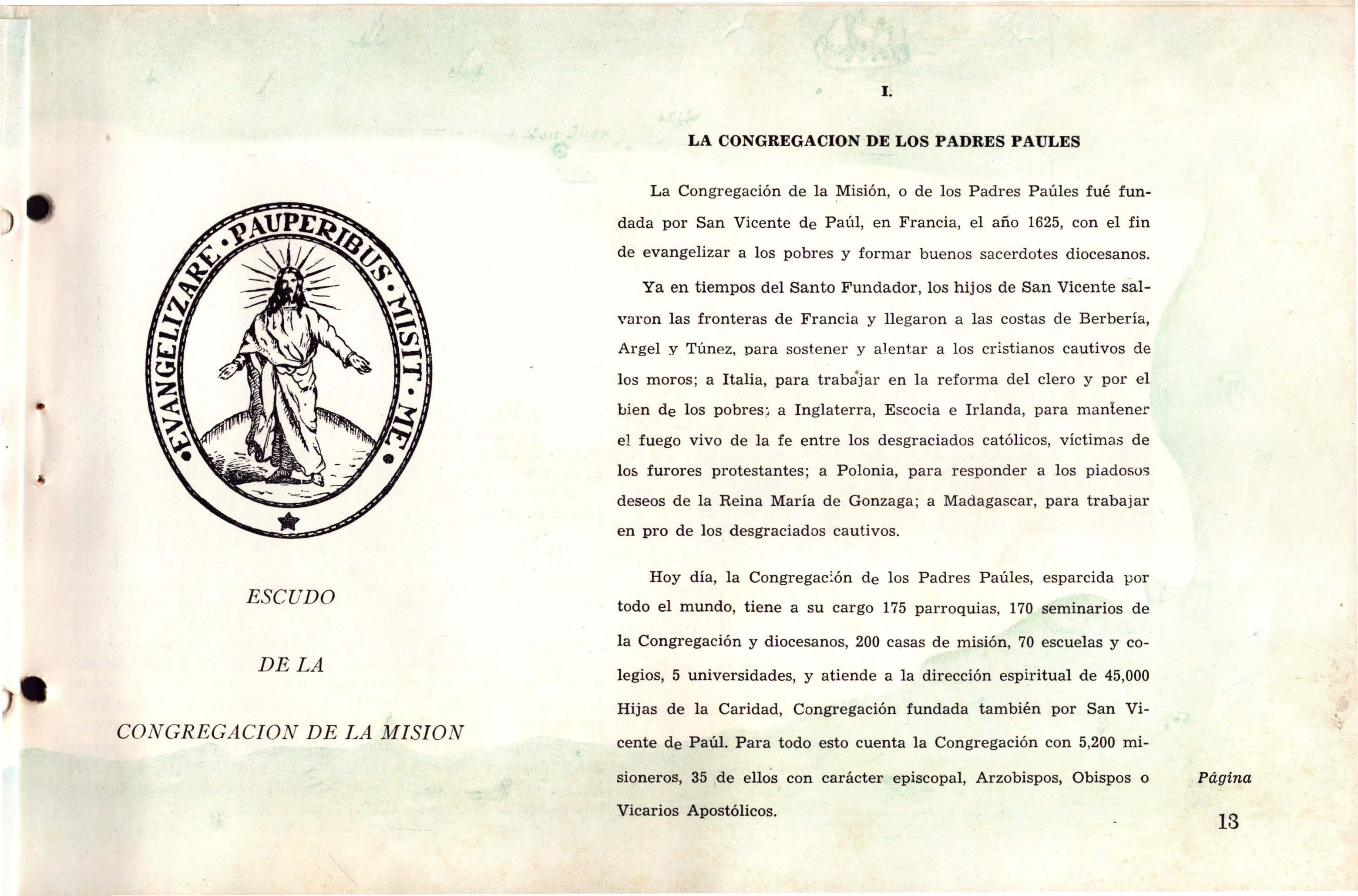 La Congregación de la :i'disión, o de los Padres Paúles fué fundada por San Vicente de Paúl, en Francia, el año 1625, con el fin de evangelizar a los pobres y formar buenos sacerdotes diocesanos.