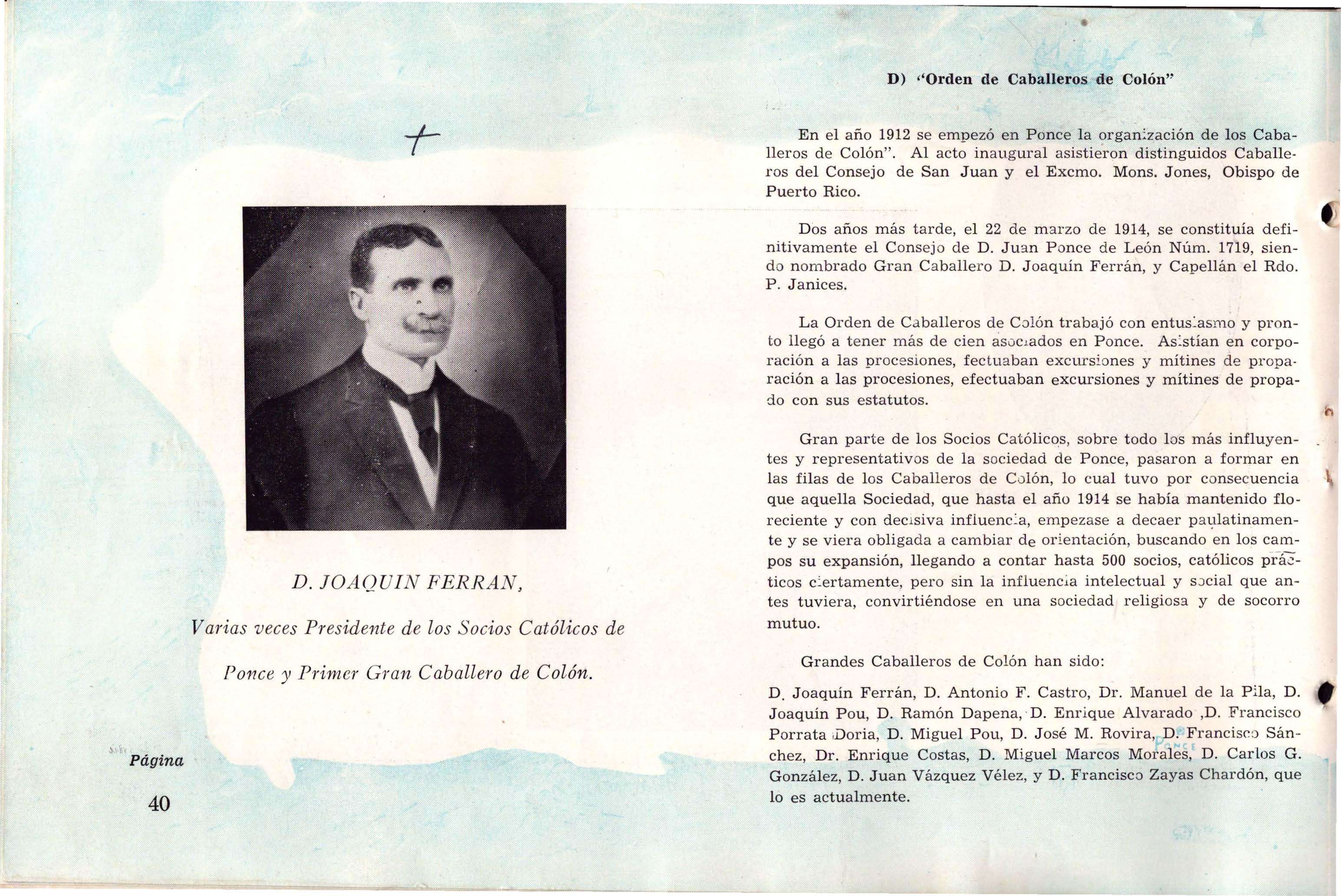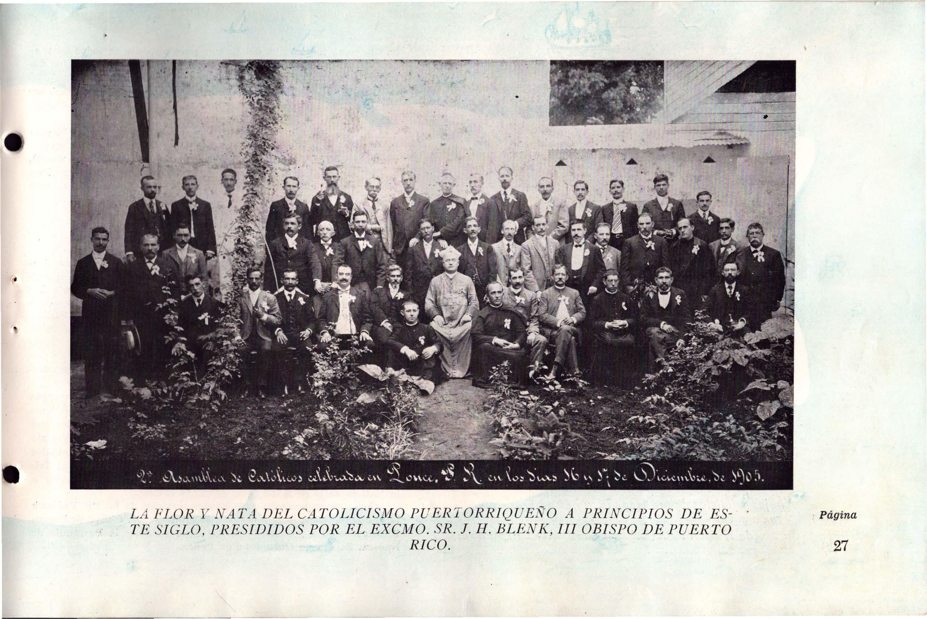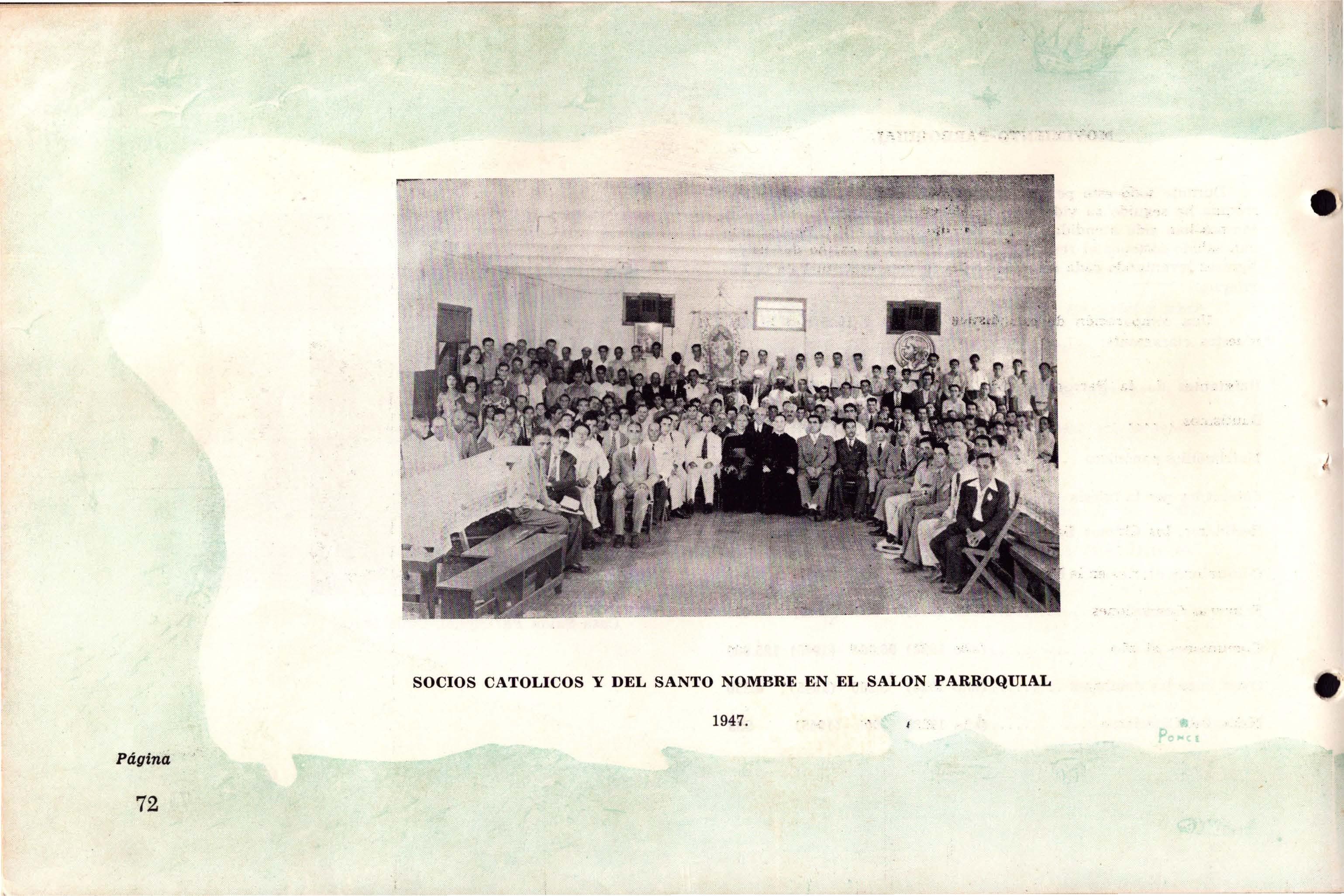 Un pequeño grupo, que n o lleg aba a una docena, fueron los que fundaron, el día 16 de abril de 1899, la " Aso ciació n de Católicos de Ponce ", presentándose al público por prim era vez e l día 14 del mes siguiente, comulgado juntos en la misa de 7, ac t o que suponía para ellos el rompimiento con el respeto human o que hasta entonces los había mantenido alejados de toda manifestación religiosa. Este acto lo el día de su Patrona , la Asunción de la Santísima Virgen a los cielos, día en que obsequiaron a lo s pobres con bonos por valor de $60 .00. Es de advertir que estos caballerosº eran de las familias más acomodadas y prestigiosas de Ponce. Al año siguiente, en la misma fecha, eran ya 60 los caballeros comulgantes y así continuaron aumentando de año en año, hasta llegar a varios cientos los hombres que, no sólo anu a lment.e, todos los ineses, recibían la Sagrada Comunión. · "'