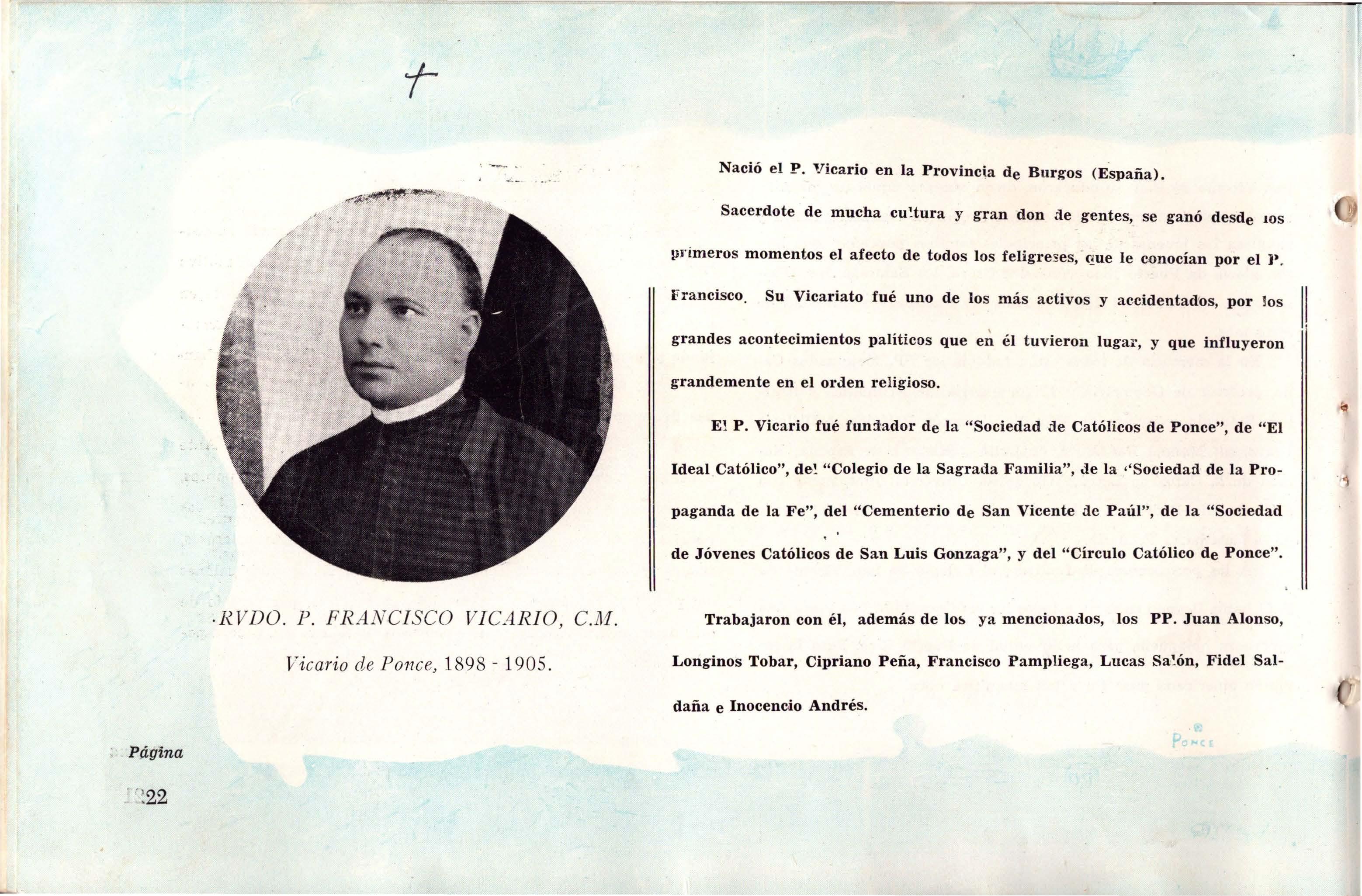 P. Vicario fué funiador de l a " Soc i edad .ie Católicos de Ponce", de " El Ideal Católico", "Colegio de la Sagrada Famili a " , Je la " Sociedad de la Propaganda de la Fe", del "Cementerio de San Vicente lle Paúl " , de la " Sociedad de Jóvenes Católicos de San Luis Gonzaga", y del "Círculo Católico de Ponce".