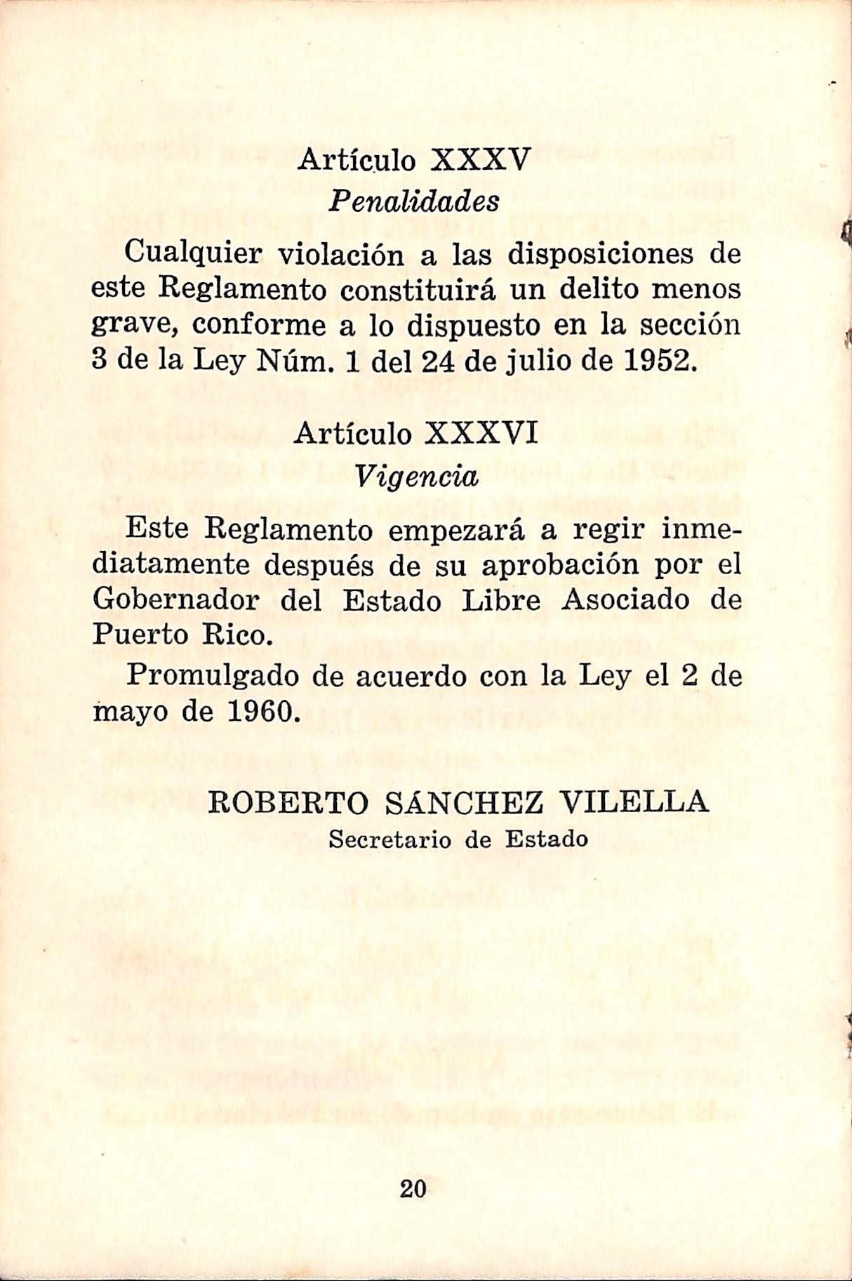 Este Reglamento empezará a regir inme diatamente después de su aprobación por el Gobernador del Estado Libre Asociado de Puerto Rico. Promulgado de acuerdo con la Ley el 2 de mayo de 1960.