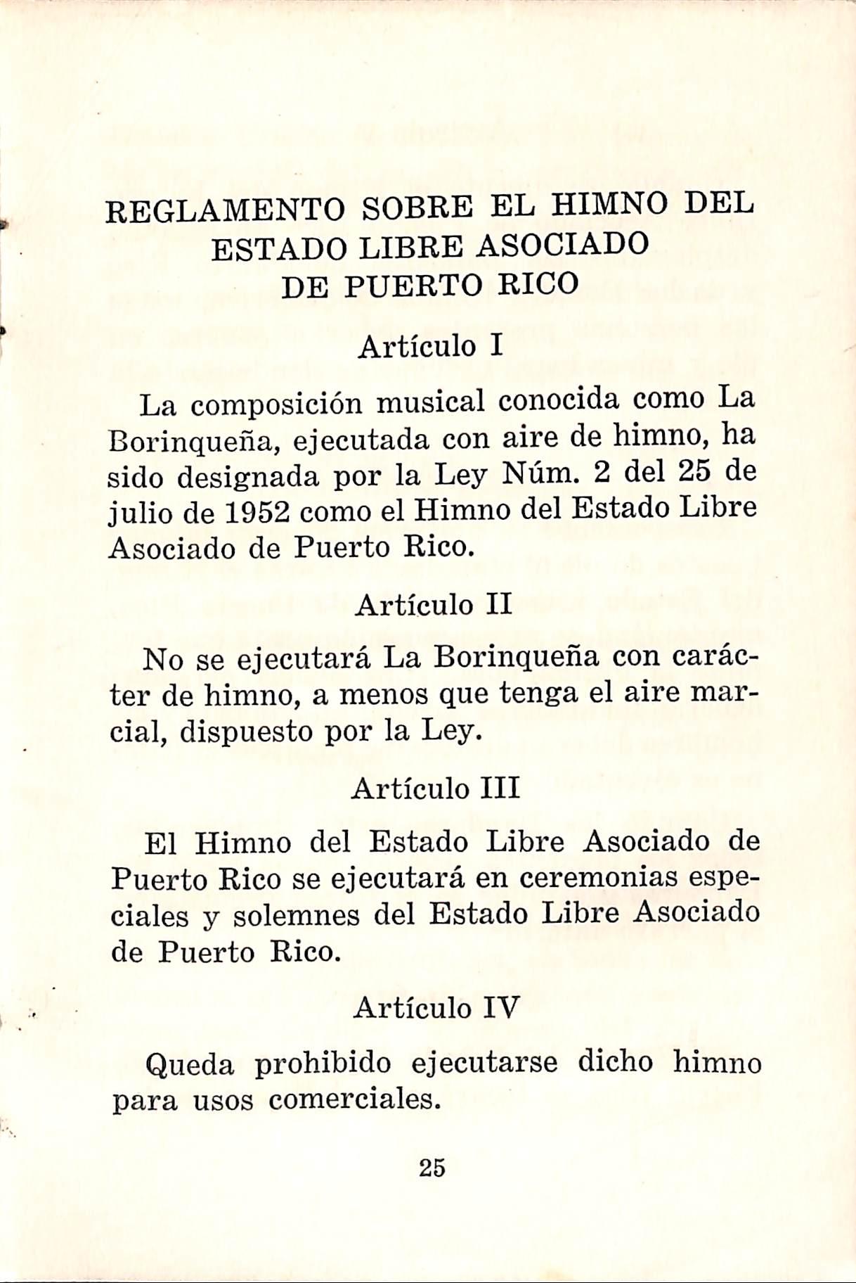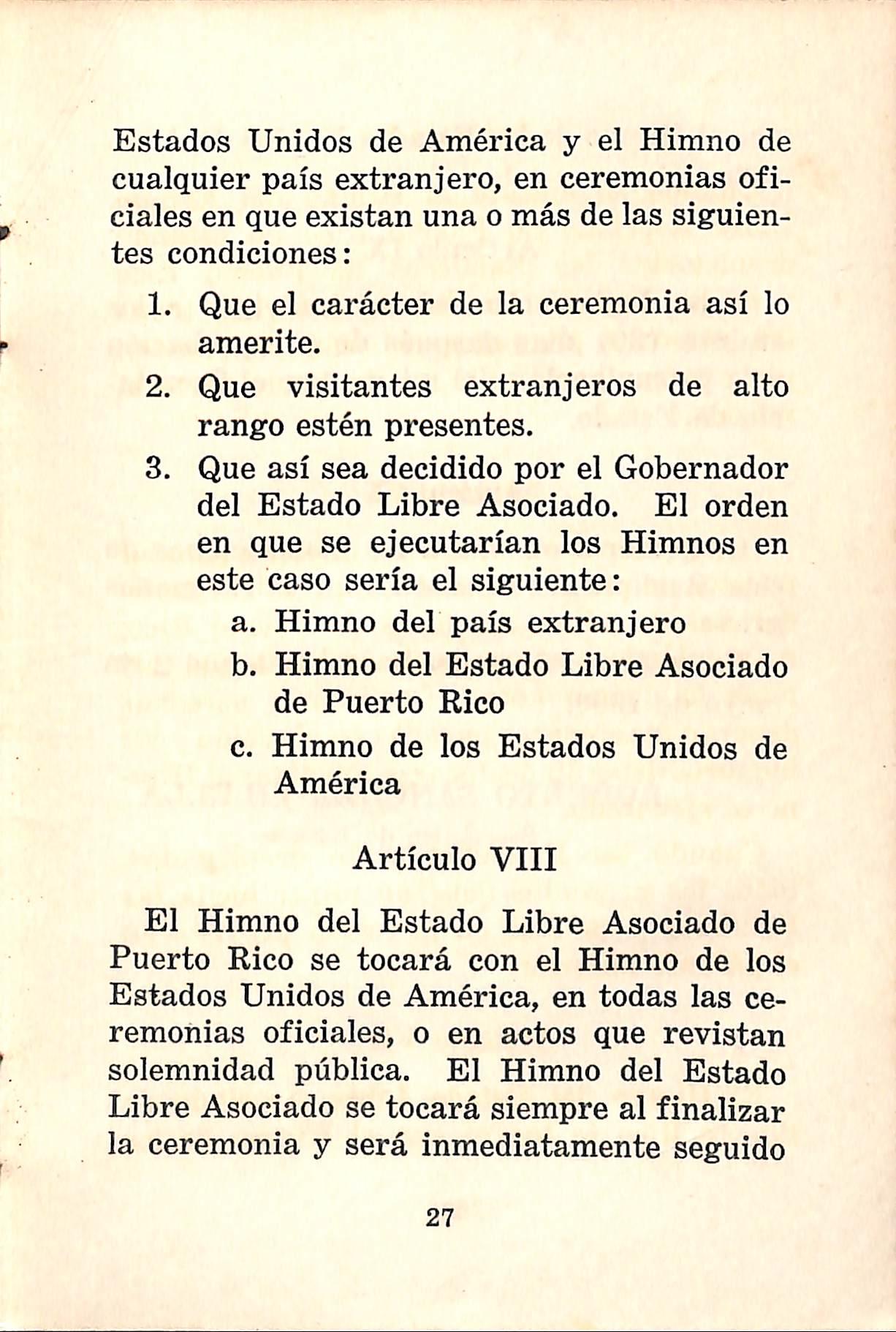 El Himno del Estado Libre Asociado de Puerto Rico se tocará con el Himno de los Estados Unidos de América, en todas las ce remonias oficiales, o en actos que revistan solemnidad pública. El Himno del Estado Libre Asociado se tocará siempre al finalizar la ceremonia y será inmediatamente seguido