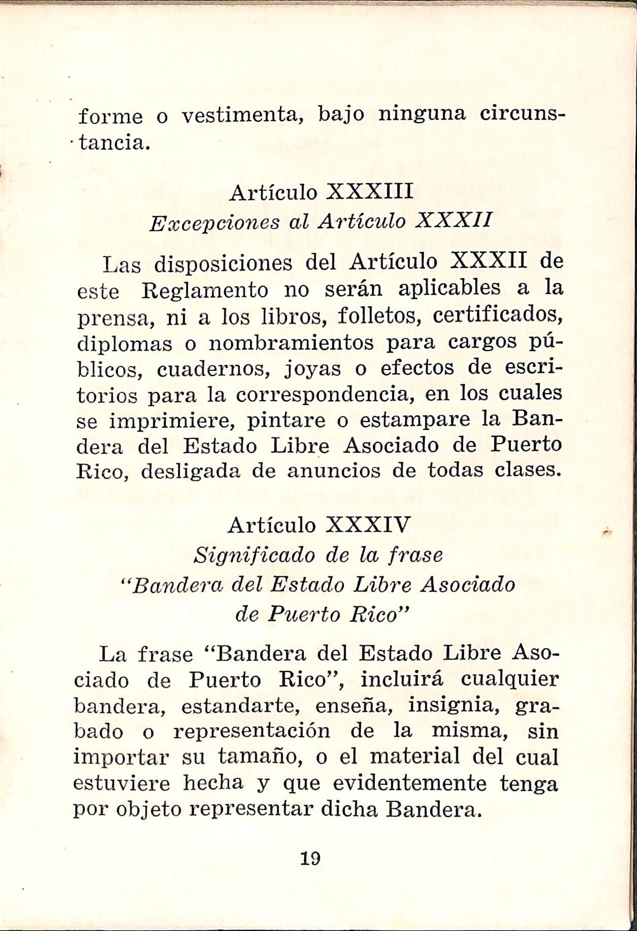 Las disposiciones del Artículo XXXII de este Reglamento no serán aplicables a la prensa, ni a los libros, folletos, certificados, diplomas o nombramientos para cargos pú blicos, cuadernos, joyas o efectos de escri torios para la correspondencia, en los cuales se imprimiere, pintare o estampare la Ban dera del Estado Libre Asociado de Puerto Rico, desligada de anuncios de todas clases.