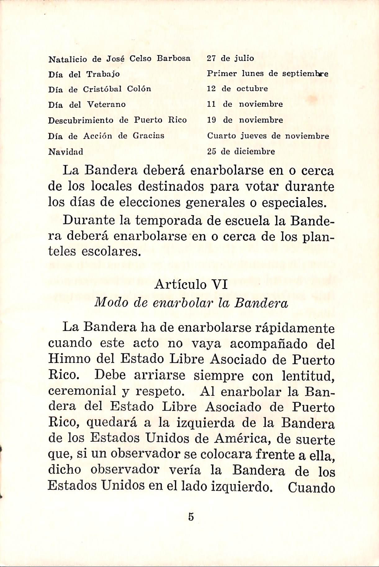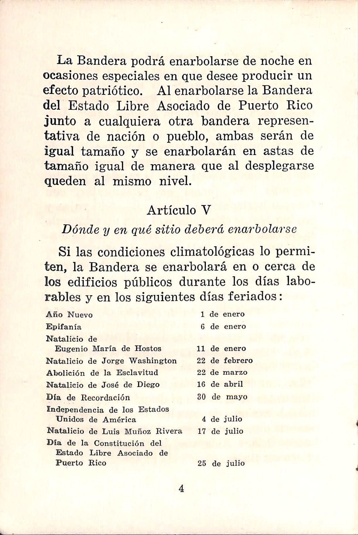 La Bandera no debe enarbolarse al aire libre antes de la salida ni después de la puesta del sol, excepto en aquellas ocasiones en que por razones especiales el Gobernador del Estado Libre Asociado de Puerto Rico dis ponga otra cosa.