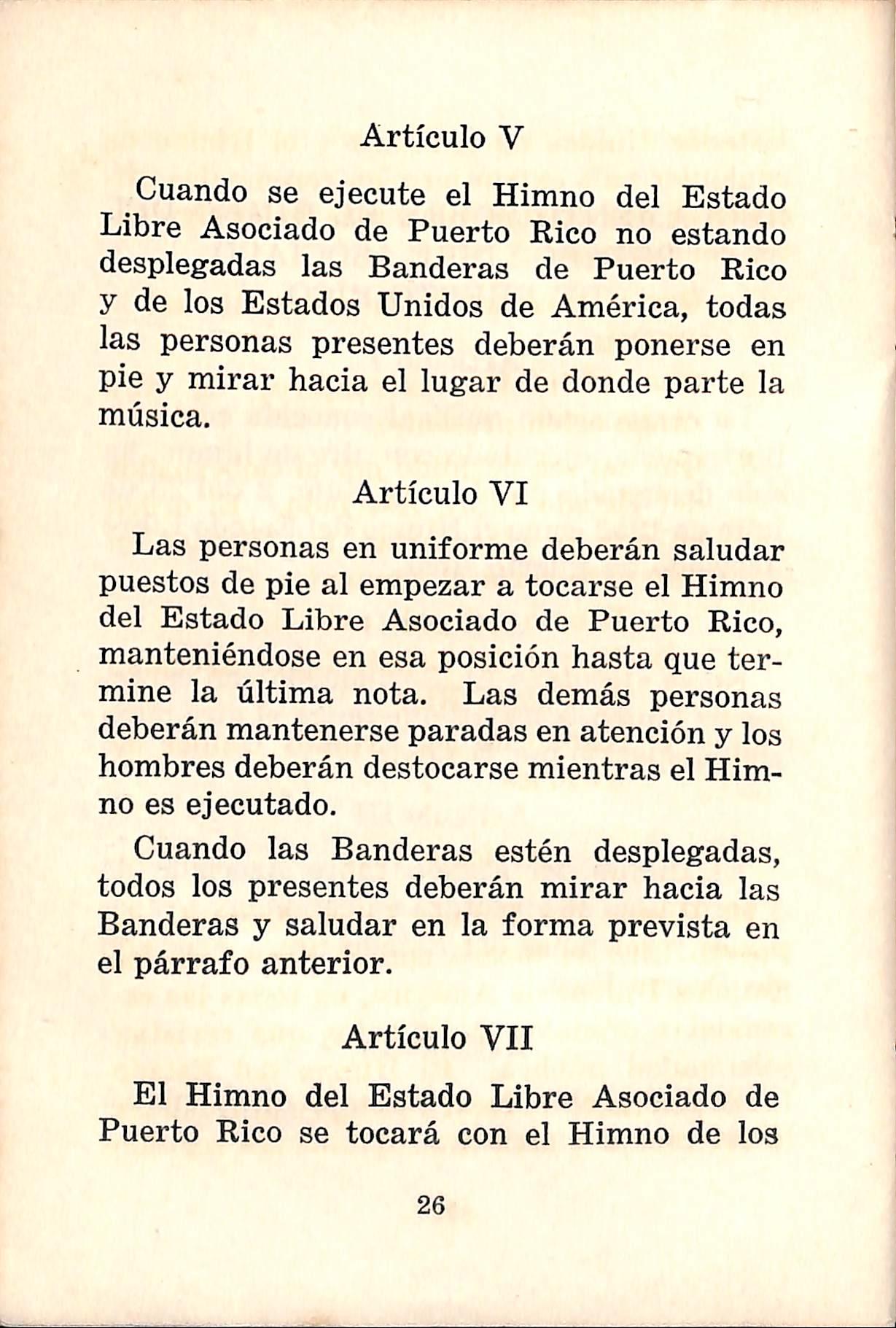 Cuando se ejecute el Himno del Estado Libre Asociado de Puerto Rico no estando desplegadas las Banderas de Puerto Rico y de los Estados Unidos de América, todas las personas presentes deberán ponerse en pie y mirar hacia el lugar de donde parte la música.