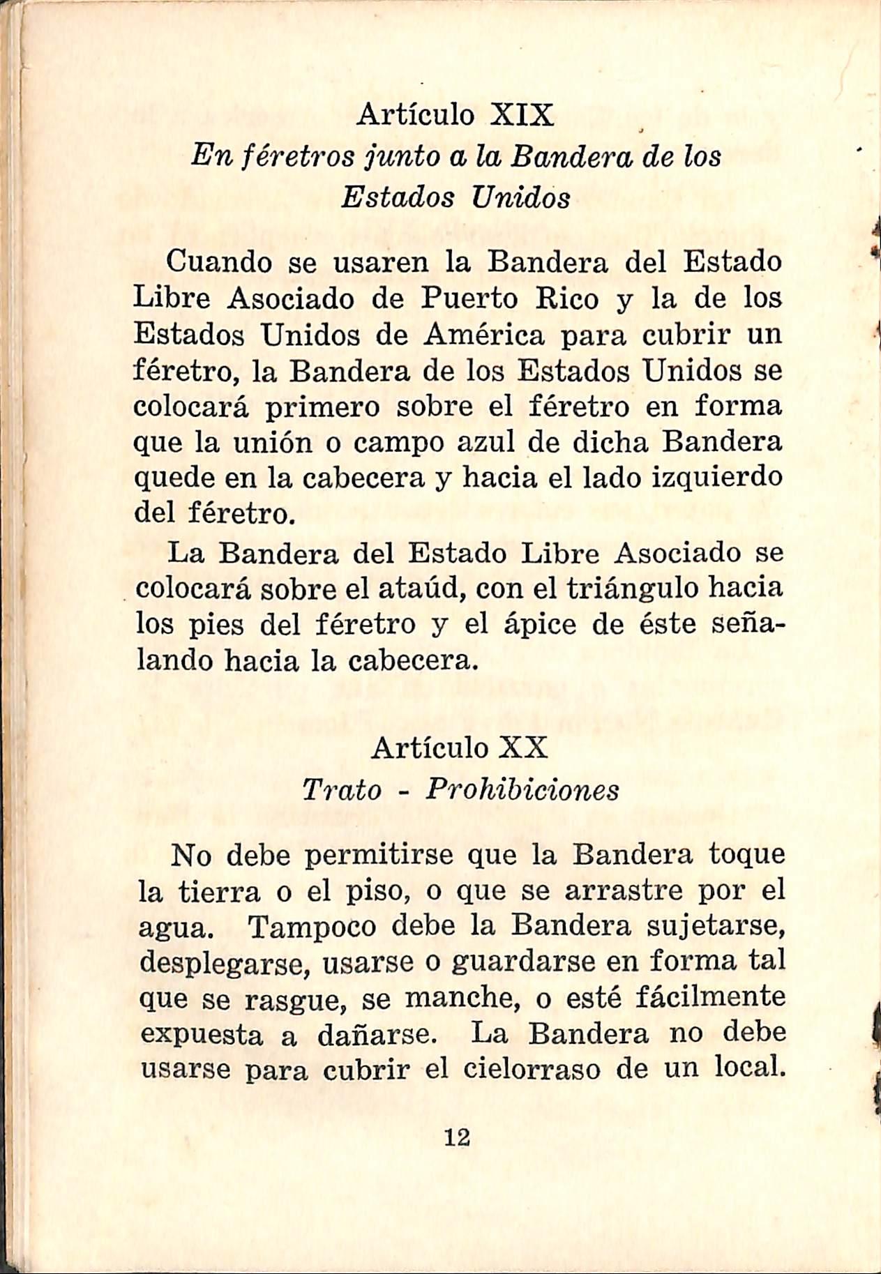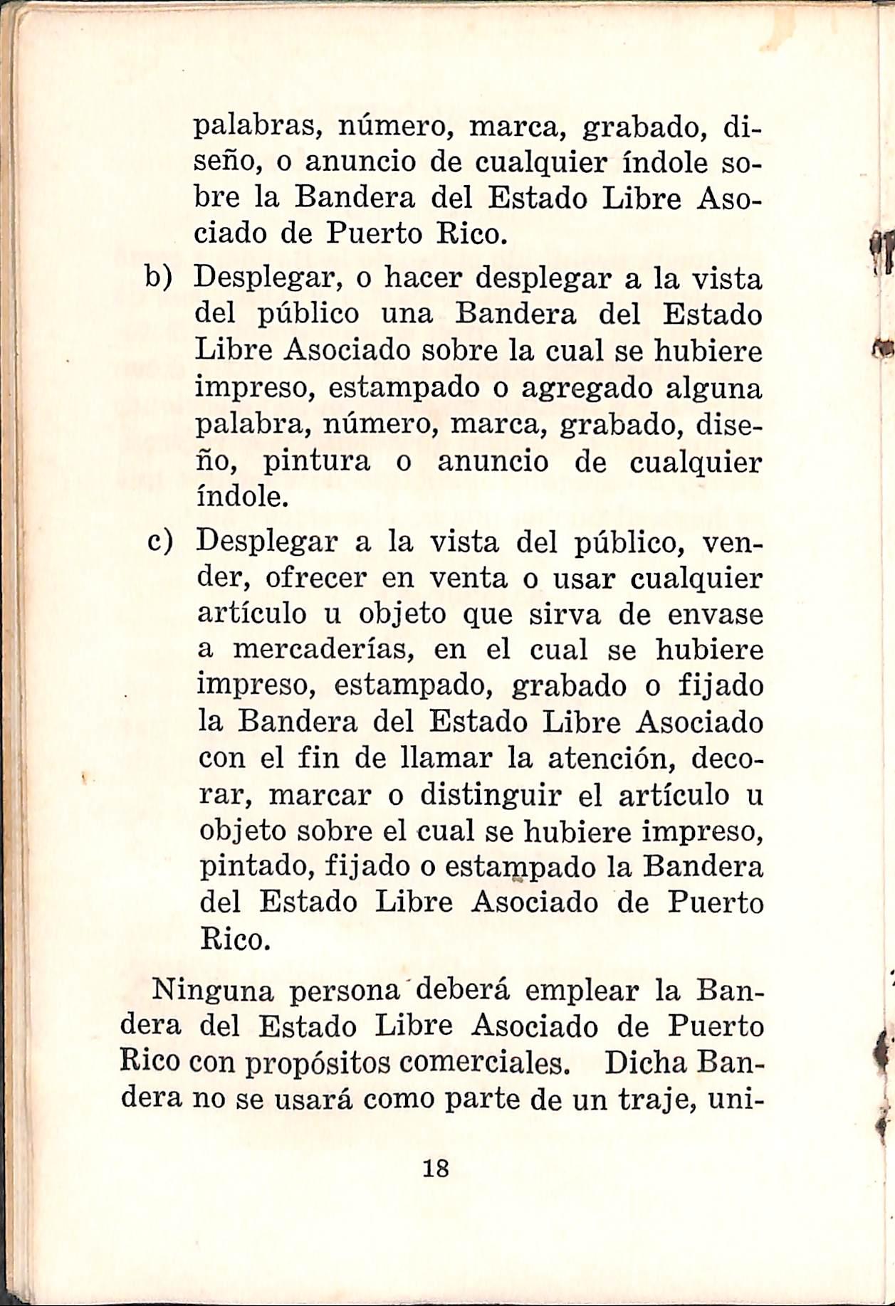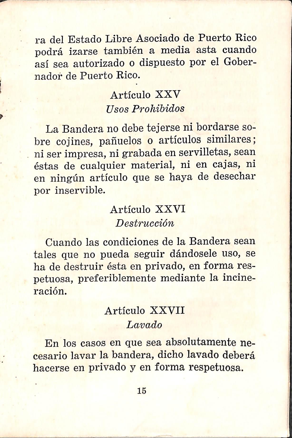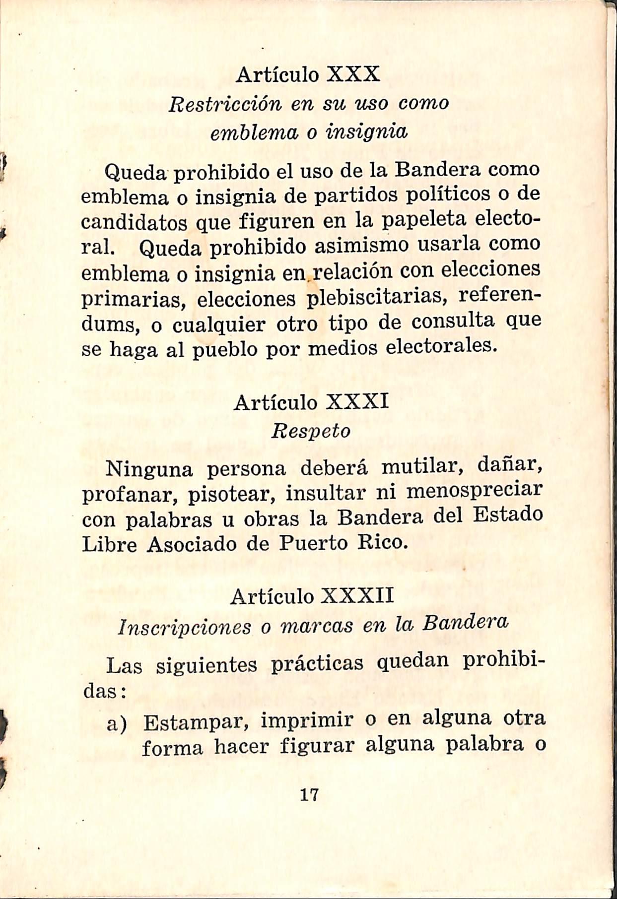 Ninguna persona deberá mutilar, dañar, profanar, pisotear, insultar ni menospreciar con palabras u obras la Bandera del Estado Libre Asociado de Puerto Rico.