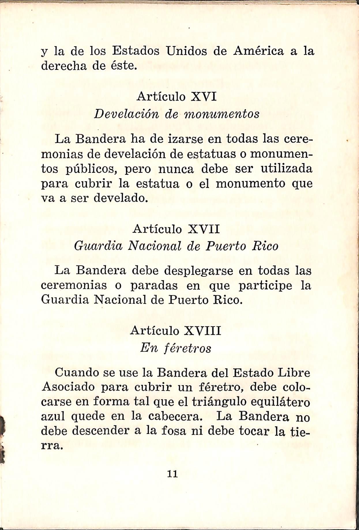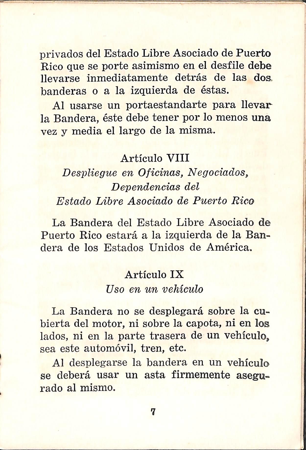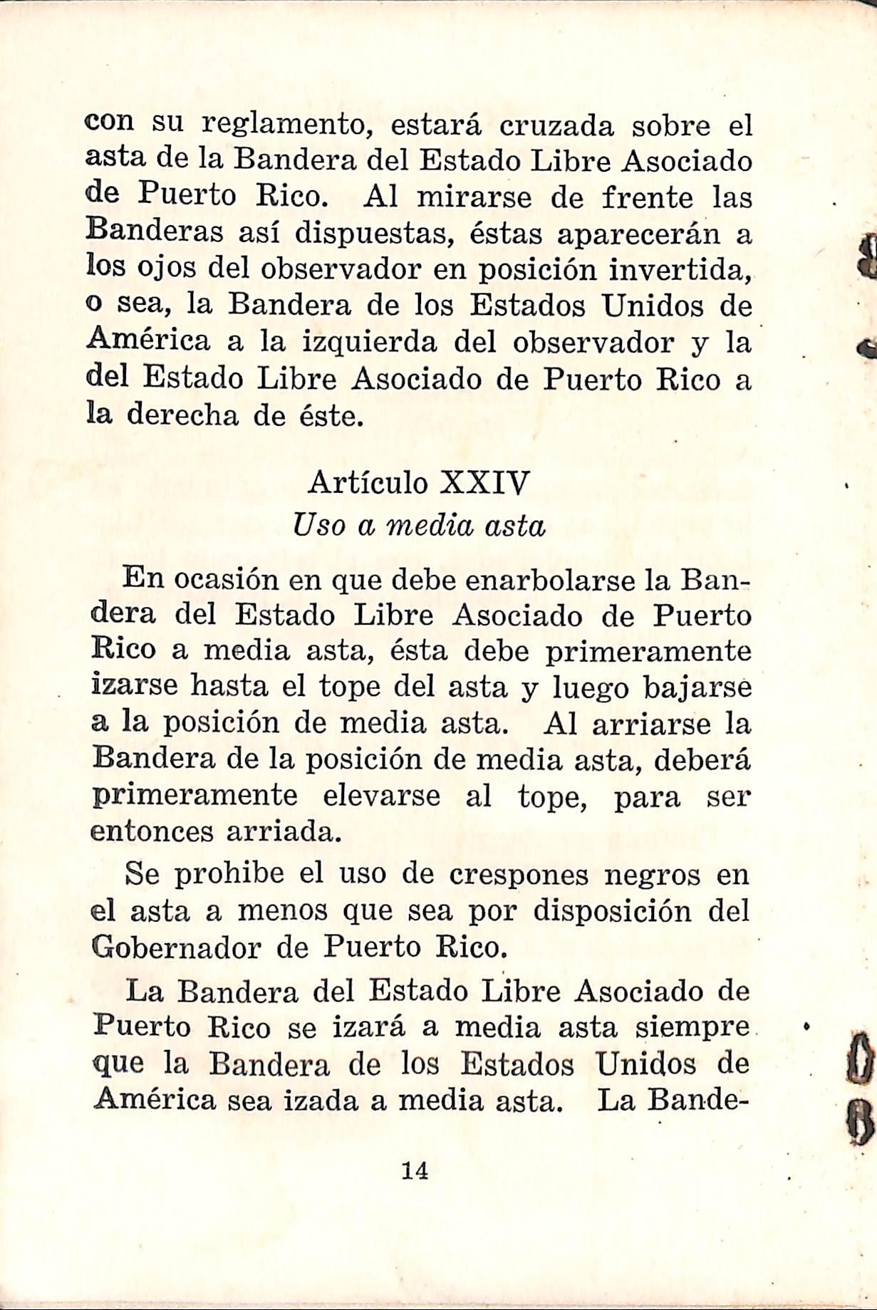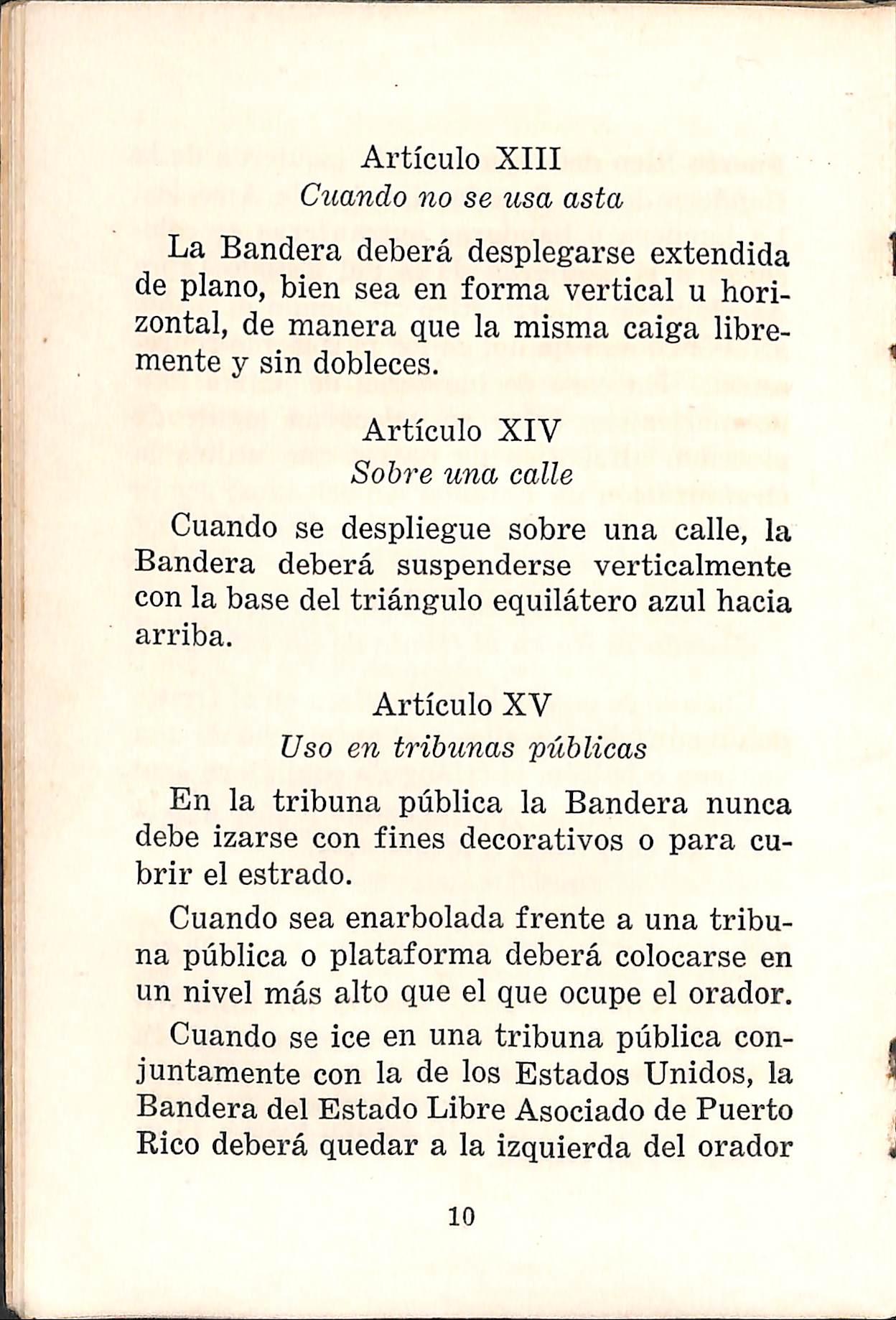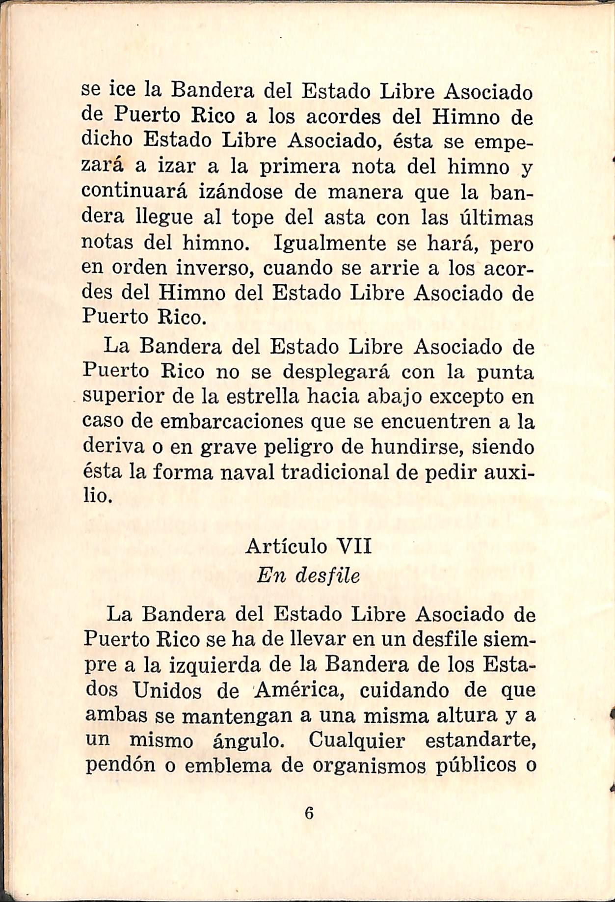 Ninguna persona deberá mutilar, dañar, profanar, pisotear, insultar ni menospreciar con palabras u obras la Bandera del Estado Libre Asociado de Puerto Rico.